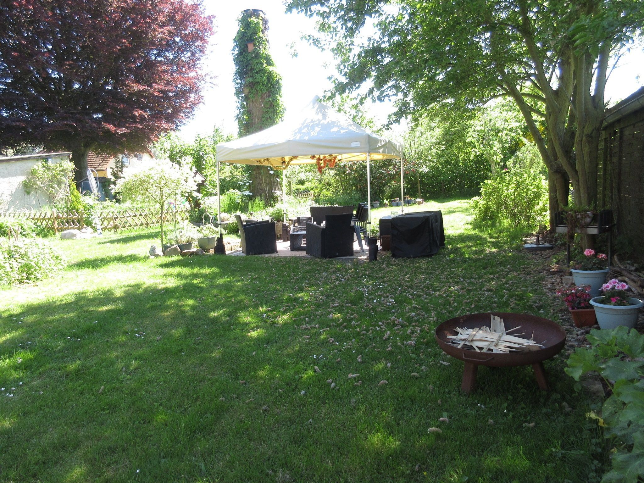Hinter dem Haus befindet sich auf dem komplett eingezäunten Grundstück (Höhe ca. 60 120cm), der kostenlose Parkplatz, ein großer Garten mit Wiese (Auslauf für die Hunde), Gartenmöbeln und einen Grillplatz, der gerne mitgenutzt werden kann.