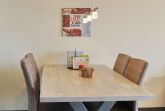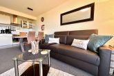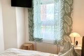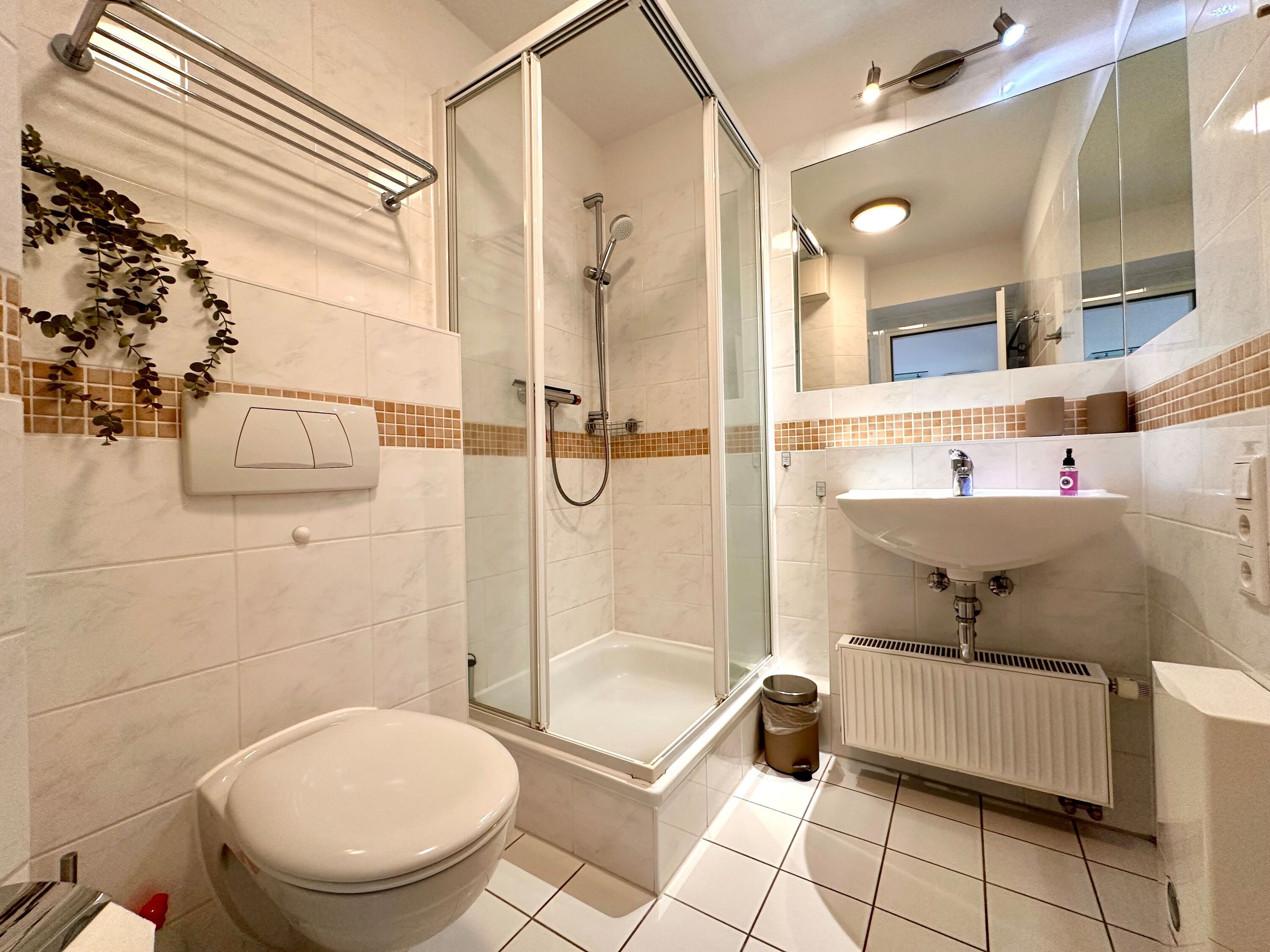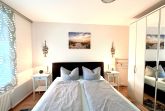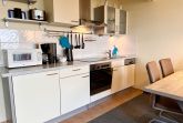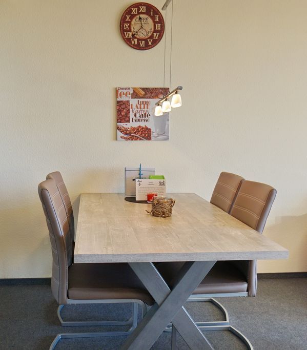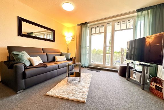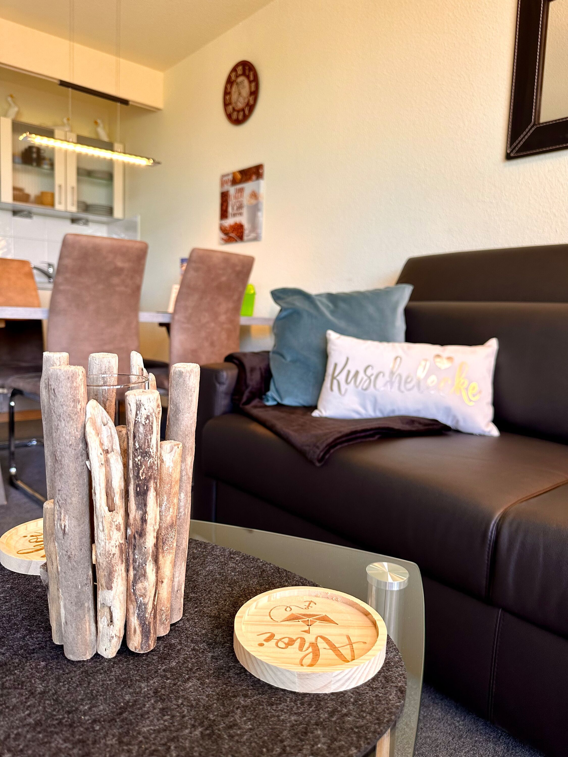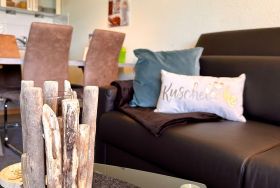 Die modern eingerichtete Ferienwohnung lädt zum Wohlfühlen ein. Geschmackvoll eingerichtet ist der Wohn-/Essbereich mit komplett ausgestatteter Küchenzeile. Im Wohnzimmer befindet sich eine bequeme Schlafcouch, auf der eine erwachsene Person oder 2 Kinder Platz finden, ein Esstisch und 4 Stühle, Sideboard und Fernseher. Im Schlafzimmer befindet sich ein Doppelbett sowie ein Kleiderschrank und ein Fernseher, auf dem man über WLAN Filme schauen kann. . Das moderne Badezimmer hat eine Dusche, WC und Waschbecken. Auf dem Balkon stehen zwei Stühle und ein Tisch.