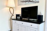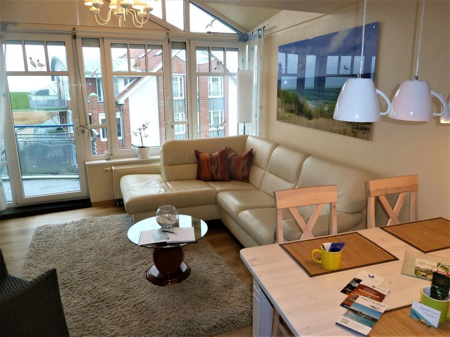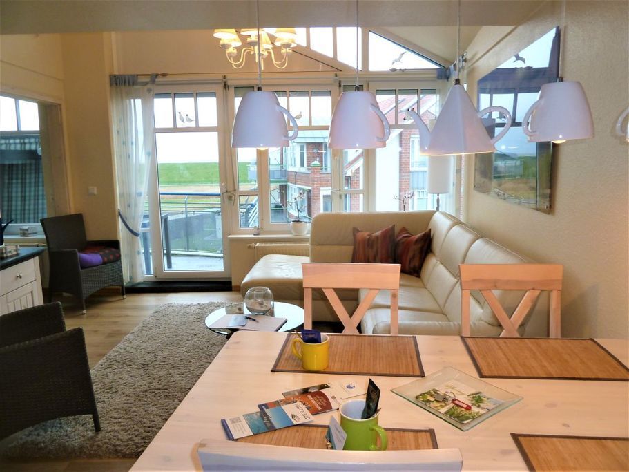 Im hellen Wohnzimmer mit großer Fensterfront und Essbereich können Sie entspannen und die Küchenzeile mit Geschirrspüler, Backofen und Ceranfeld lädt zum Kochen ein. Träumen Sie schön in den beiden Schlafzimmern: eines ist mit einem Doppelbett und eines ist mit zwei Einzelbetten (über die Treppe in der Wohnung erreichbar) ausgestattet.