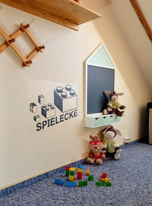 Ein Kinderreisebett und ein Kinderhochstuhl stehen bereit.