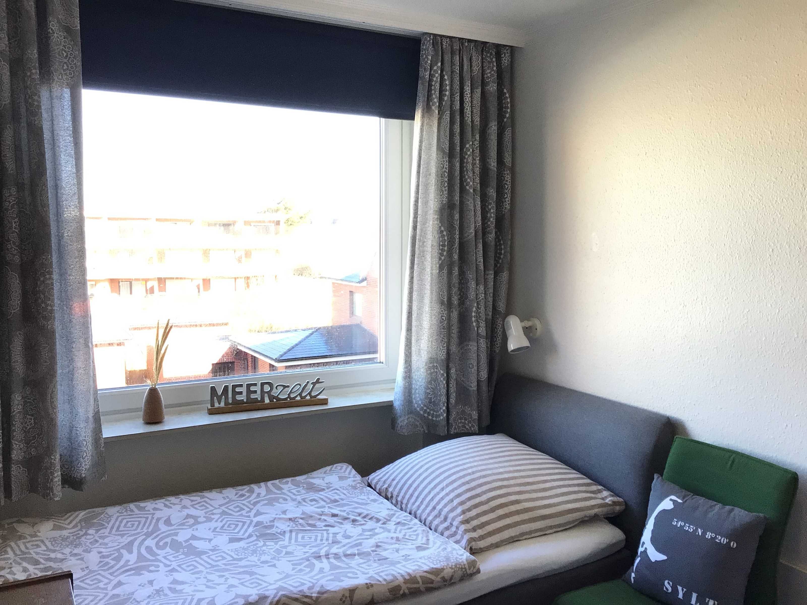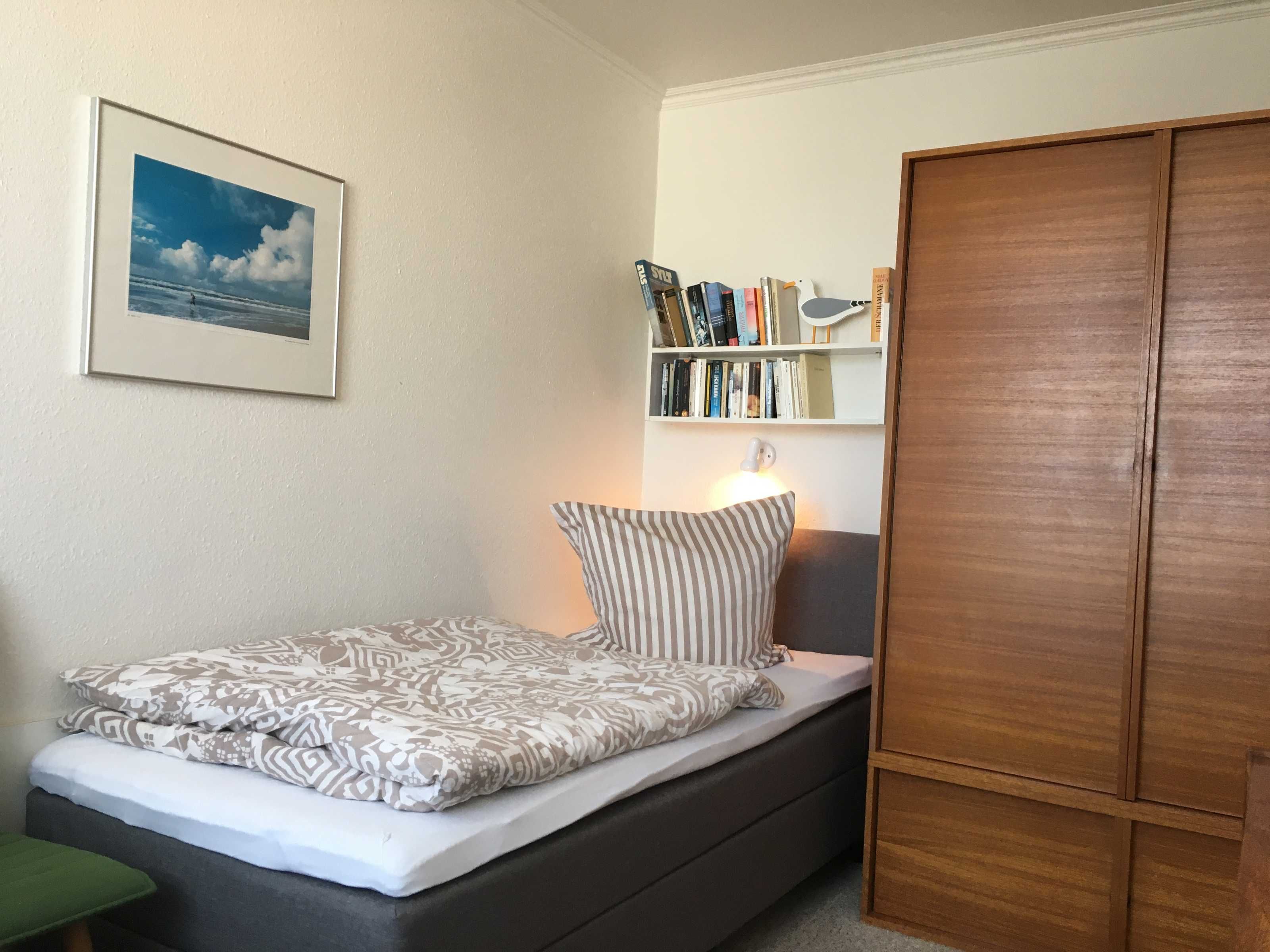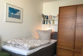 Das Schlafzimmer ist ausgestattet mit 2 Boxspring- Einzelbetten, Leselampen und Kleiderschrank. Bettwäsche und Handtücher sind für Sie bereitgestellt.