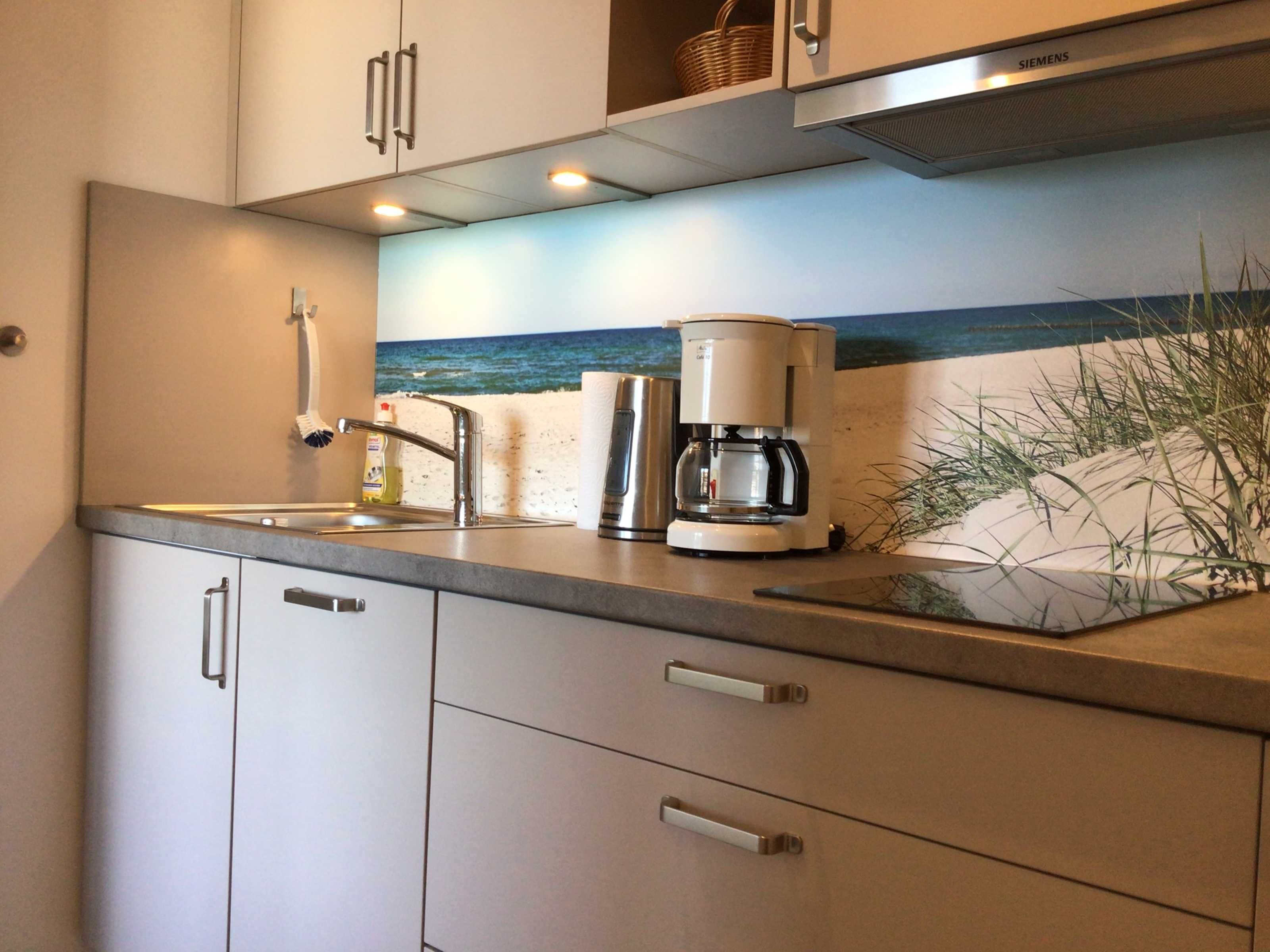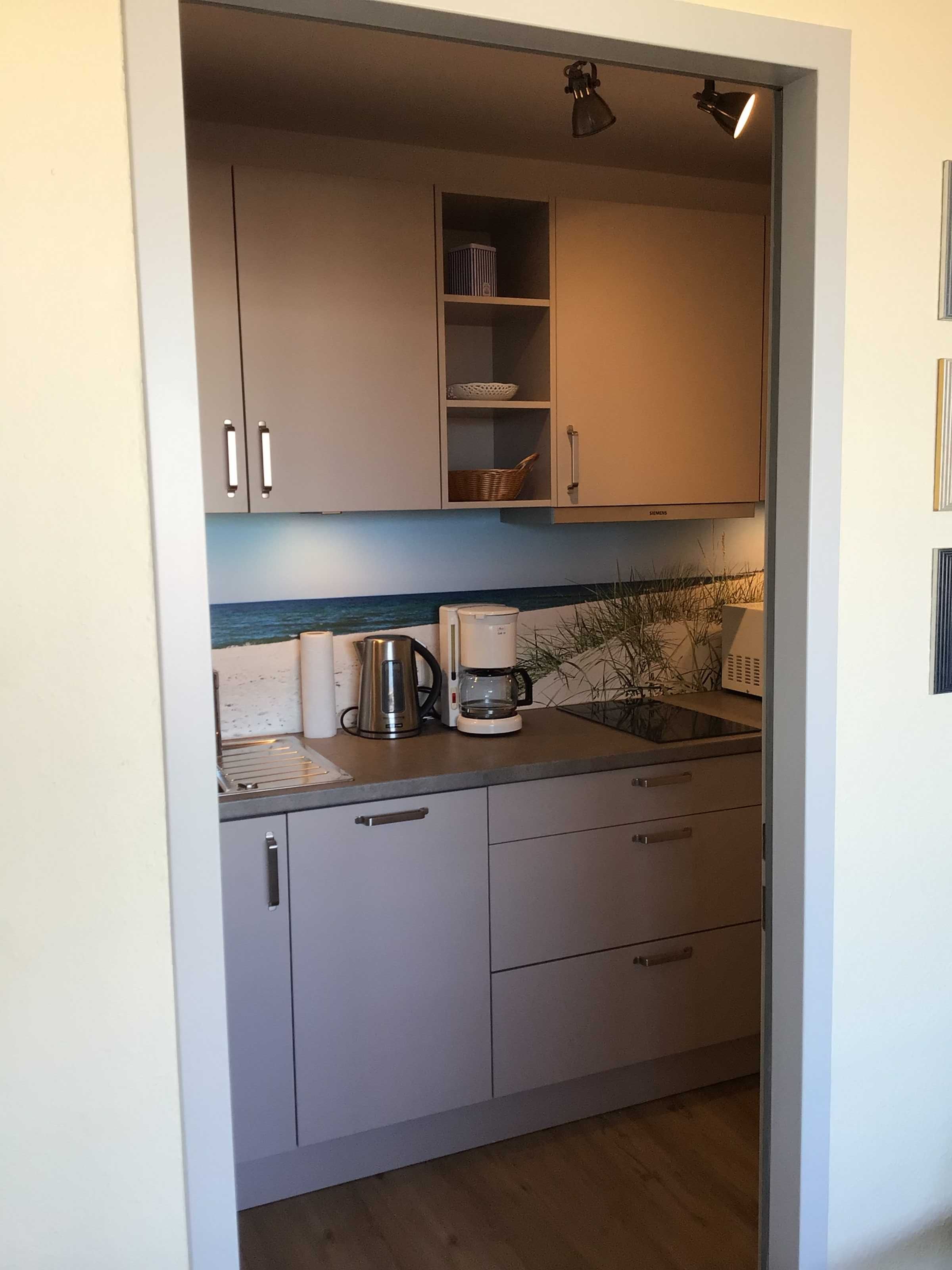 Eine separate Küche ausgestattet mit 2-Plattenkochfeld, Mikrowelle, Kühlschrank, Kaffeemaschine, Toaster, Wasserkocher und Geschirr für den täglichen Bedarf sind selbstverständlich.