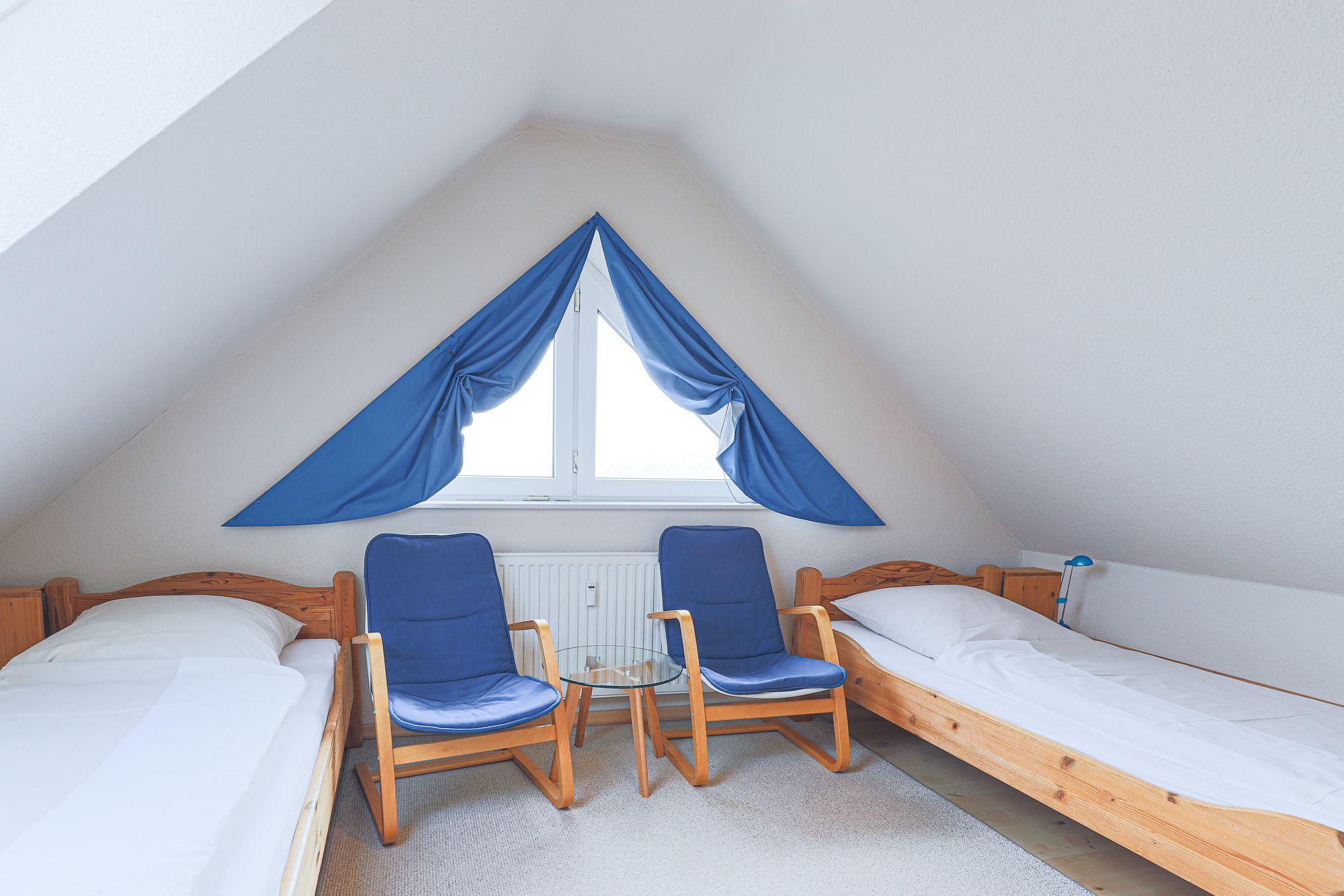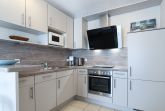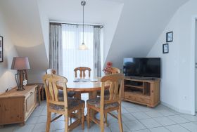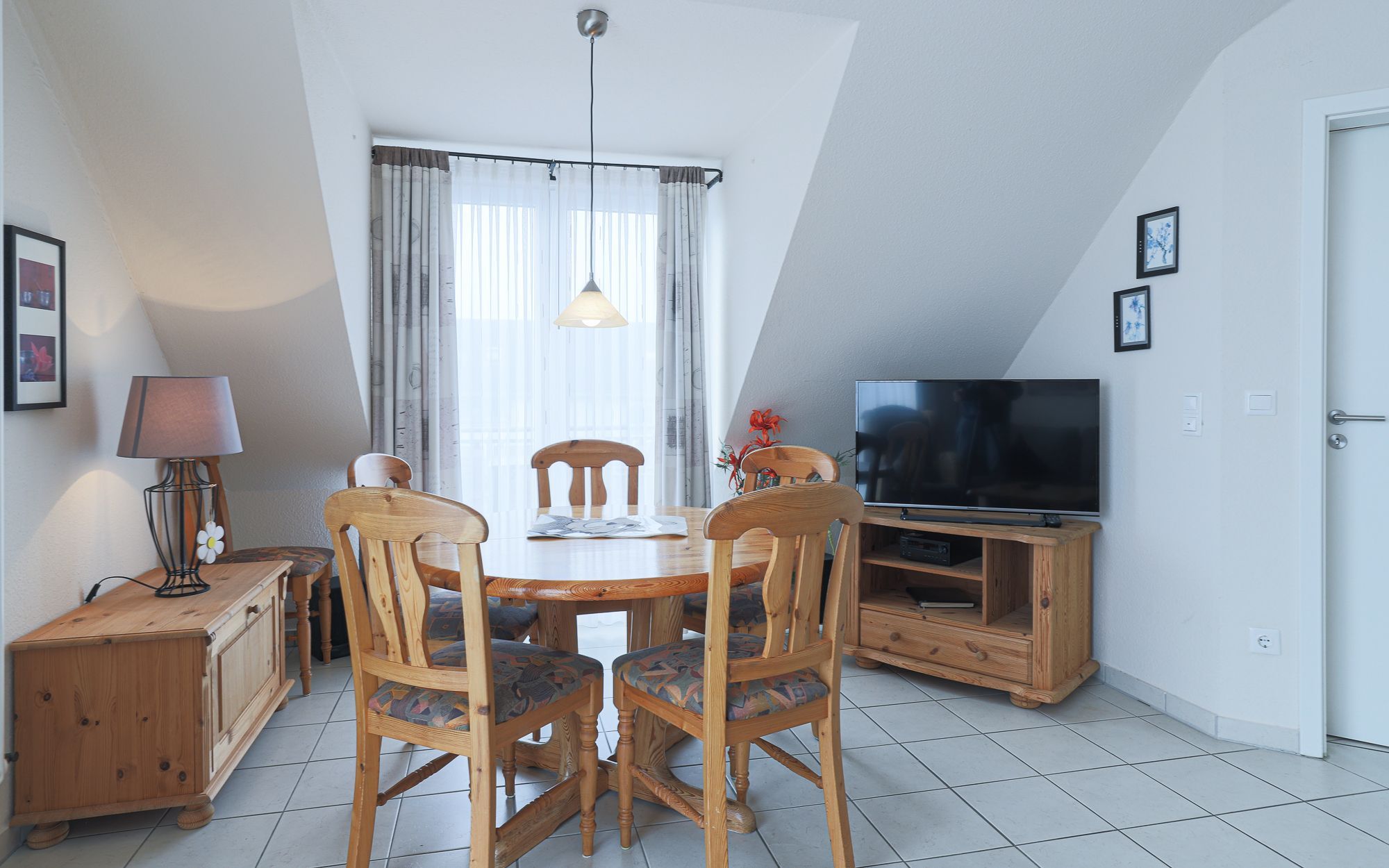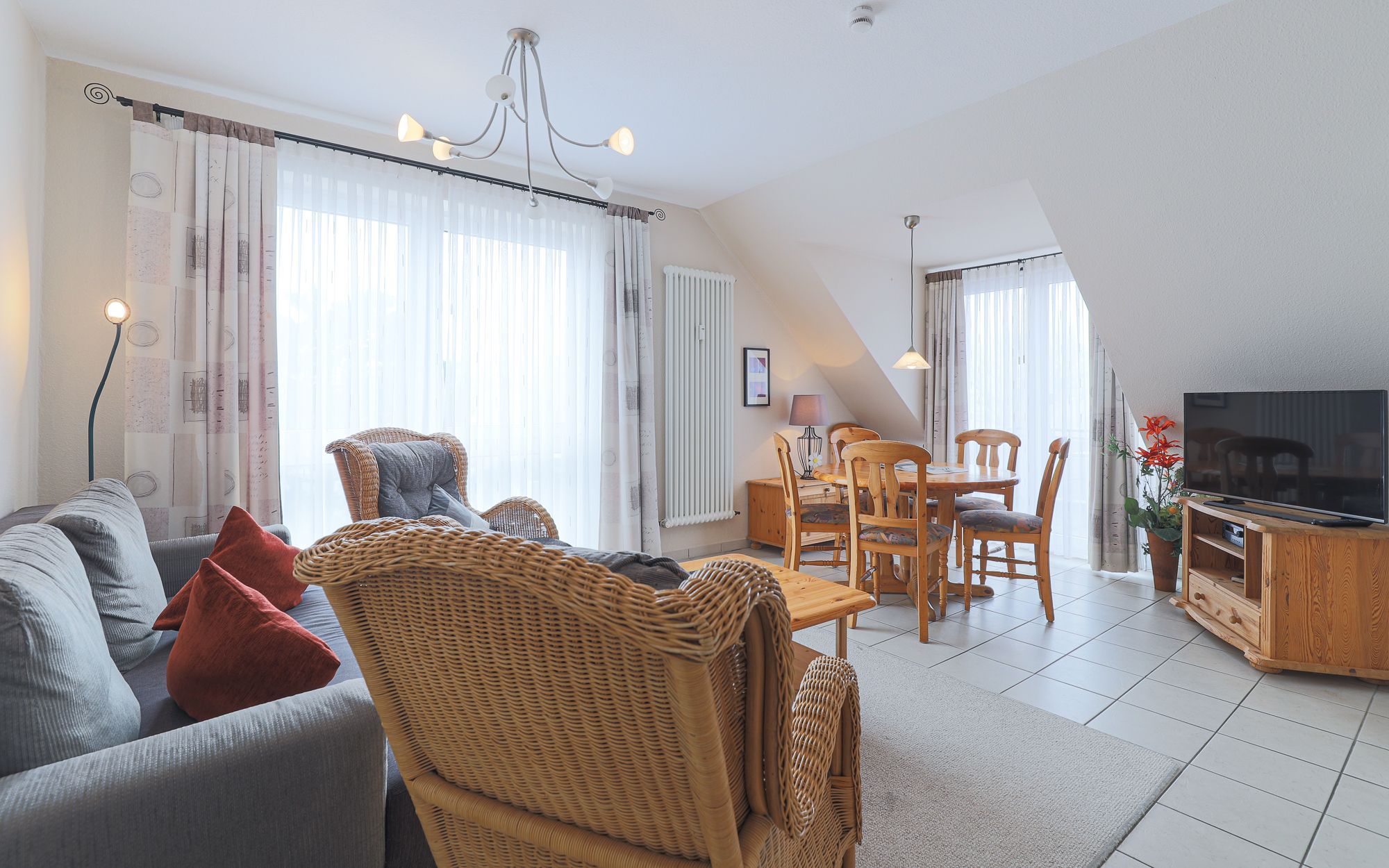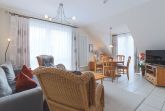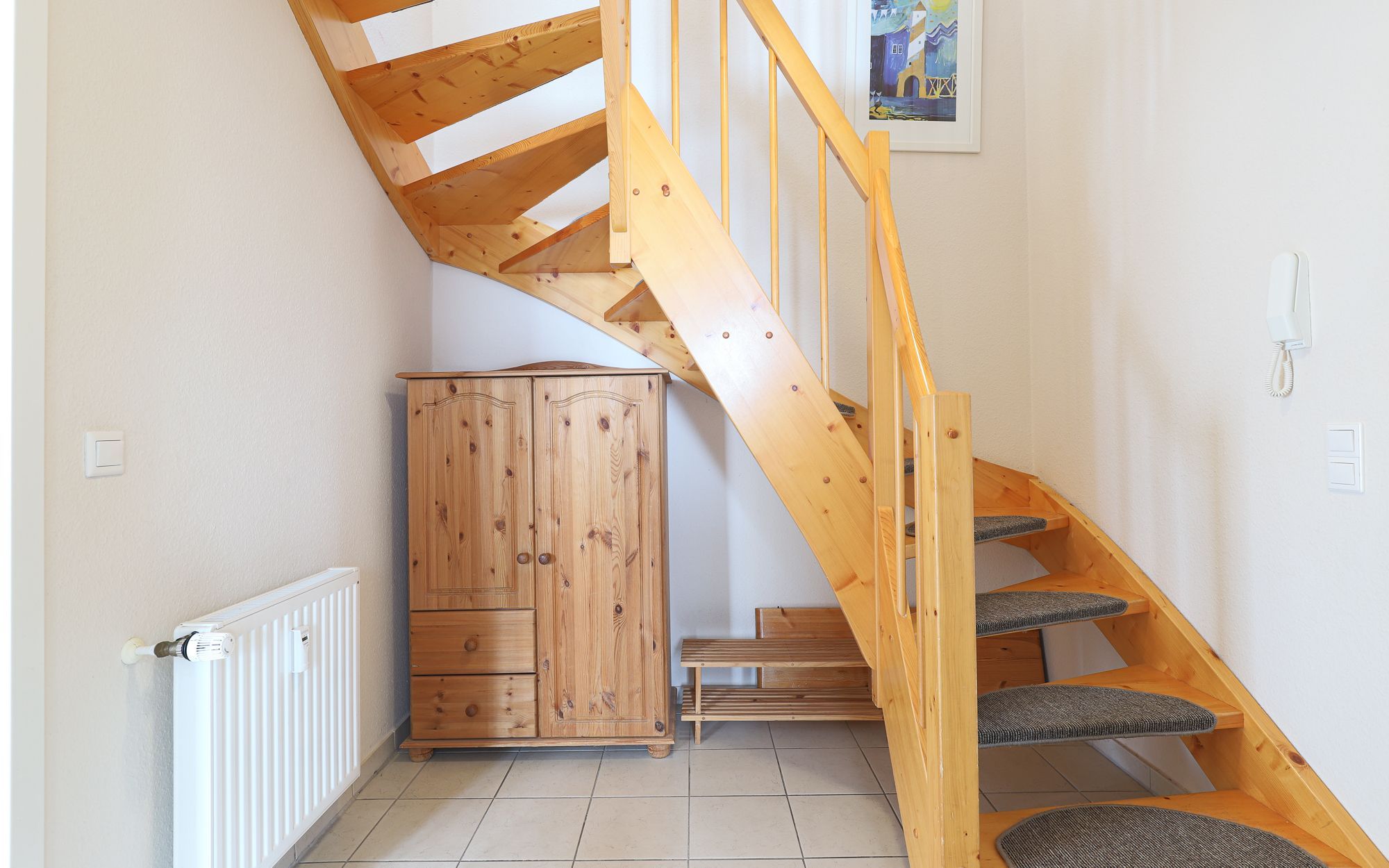 Im oberen Wohnbereich erwartet Sie ein offener, großzügiger Wohn-, Ess- und Küchenbereich mit direktem Zugang zum Westbalkon hier genießen Sie die Nachmittagssonne in vollen Zügen nach einem Spaziergang am Meer. Die Einbauküche ist komplett ausgestattet und lädt zu gemeinsamen Kochmomenten ein. Ebenfalls im Dachgeschoss befindet sich ein praktisches Gäste-WC.