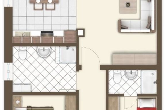 Die Wohnung ist ca. 60 qm groß und ausgelegt für 2-4 Personen. Sie besteht aus einem offenen Wohnzimmer mit Essbereich, Küche, 2 Schlafzimmern und 2 Duschbädern.