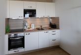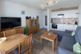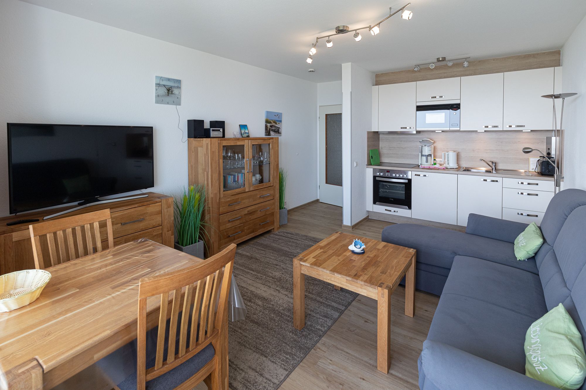 Die im Wohnbereich integrierte Küche ist mit Kühlschrank inkl. Gefrierfach und einer guten Ausstattung ebenso komfortabel eingerichtet. So kann die Planung für das erste Urlaubsmenü beginnen. Ob Sie am Esstisch speisen oder auf dem Balkon mit Seesicht ein Kaffee und Kuchen als Zwischenmahlzeit essen möchten.
