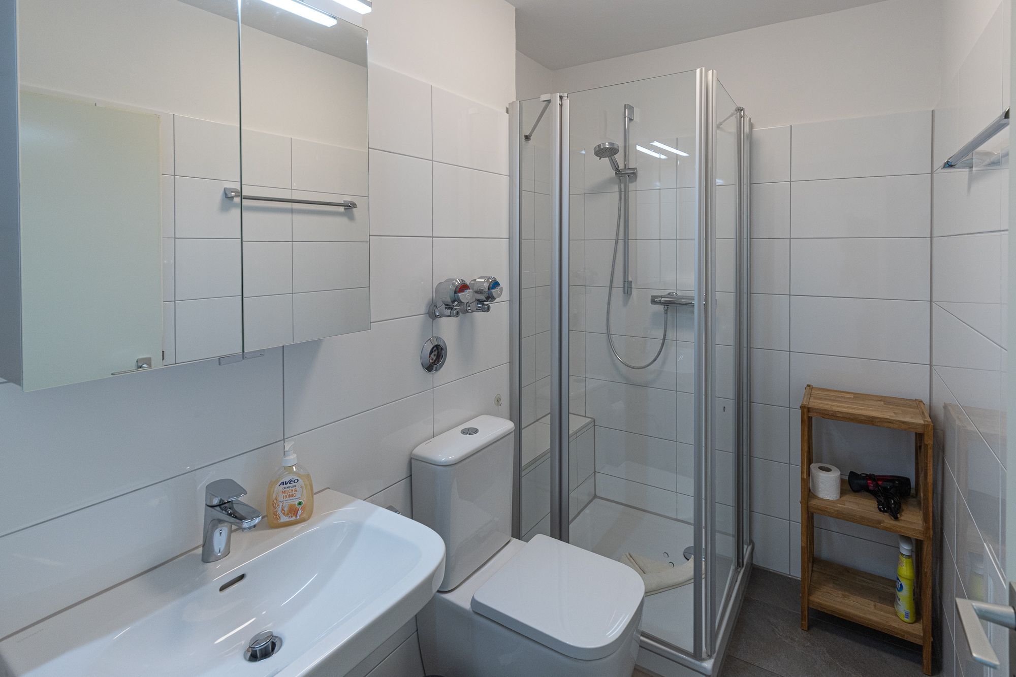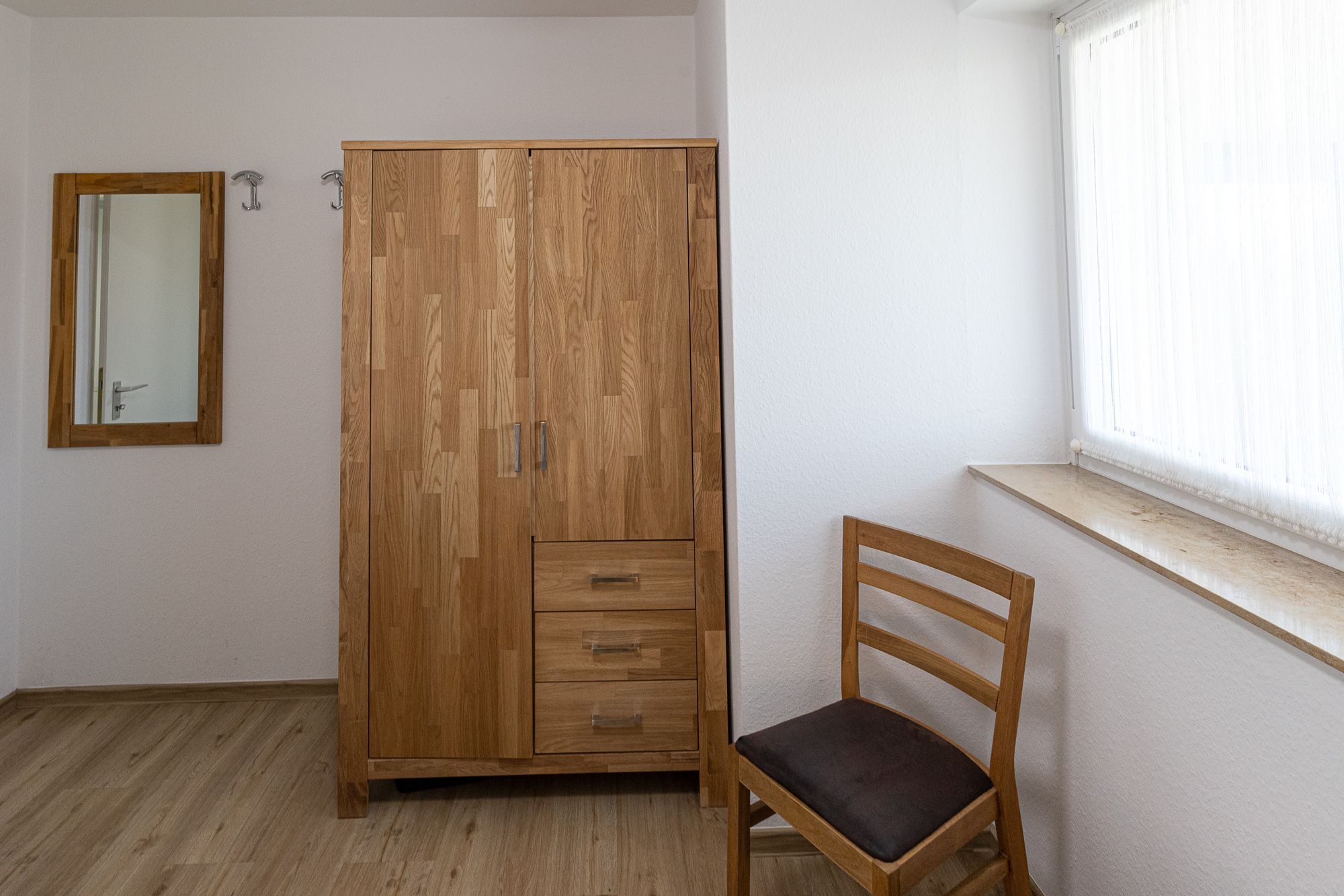 Der angrenzende Schlafbereich ist mit einem Kleiderschrank und zwei Einzelbetten für einen guten Schaf ausgestattet. Die Verdunklung der Fenster ist gegeben. Ein helles Duschbad mit WC wertet den Komfort dieser Ferienwohnung auf.