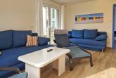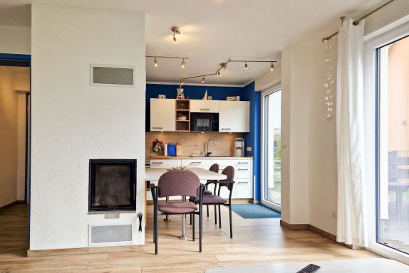 Eine weitere Tür führt in den Wohnraum, in den eine offene Küchenzeile integriert ist. Die Sitzgruppe in gedecktem Meeresblau lädt dazu ein, die Füße hochzulegen und einmal richtig auszuspannen. Bei Bedarf sorgt der Kamin für gemütliches Flammenknistern und wohlige Wärme.