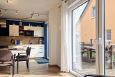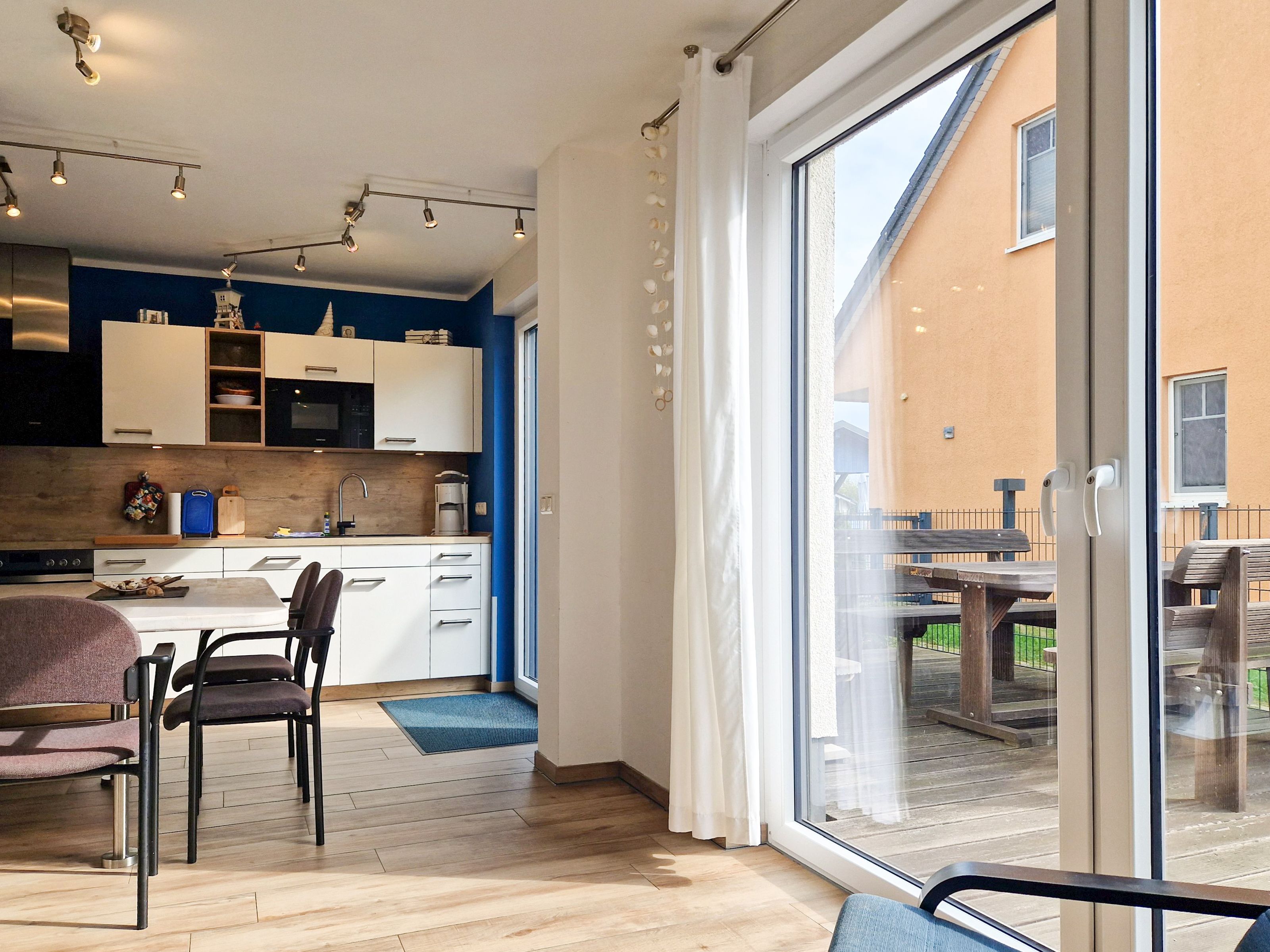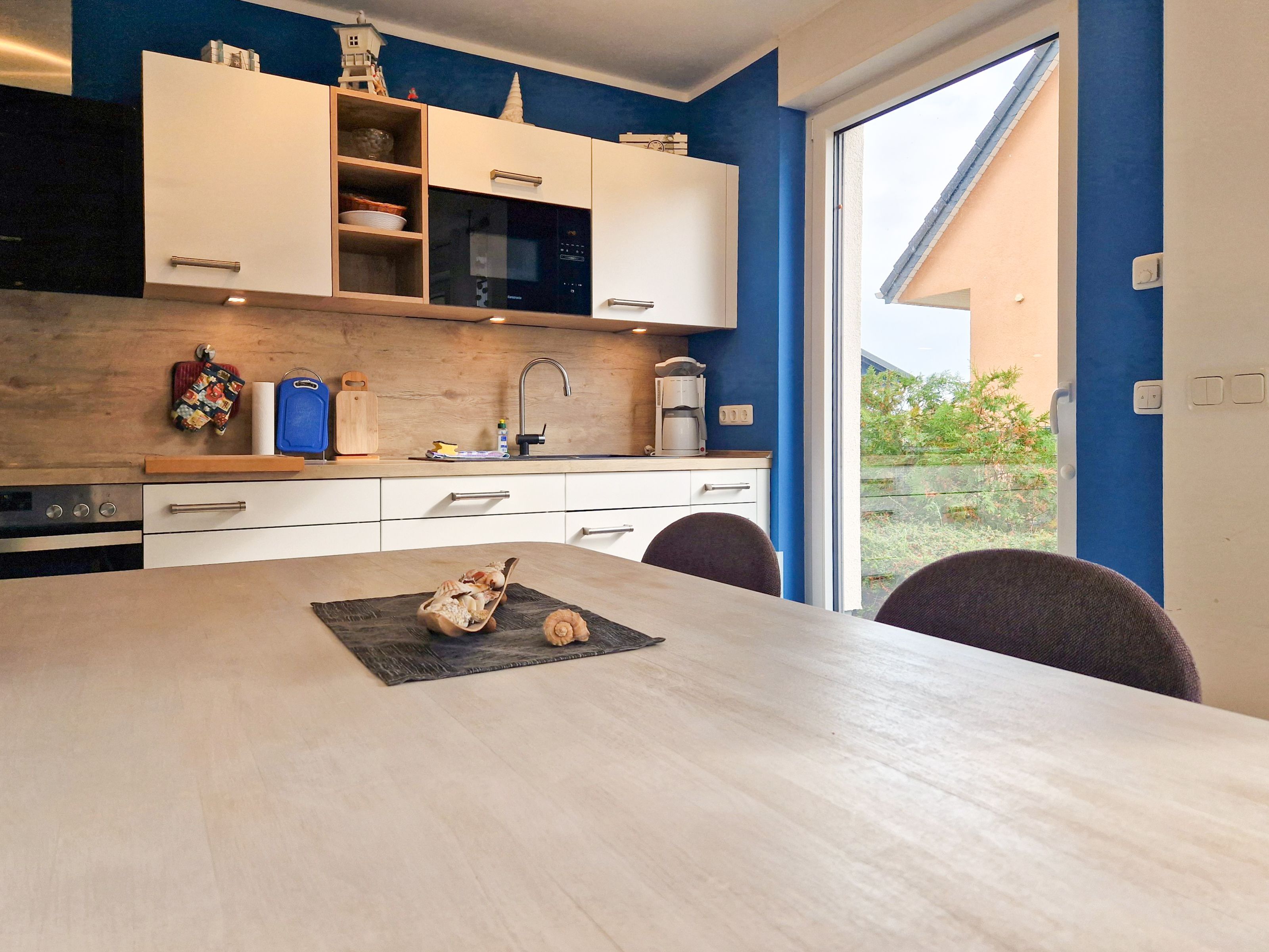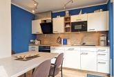 Um die Ecke gelangen Sie in den Küchenbereich. Zur modernen Ausstattung gehören Cerankochfeld mit Backofen, Mikrowelle, Spülmaschine, Kühlschrank mit Gefrierfach und Kleingeräte wie Toaster, Wasserkocher und Kaffeemaschine, die Ihnen den Start in den Tag erleichtern! In der Küche wird die Akzentfarbe Blau noch einmal aufgegriffen, sodass insgesamt ein harmonisches Raumgefühl entsteht.
