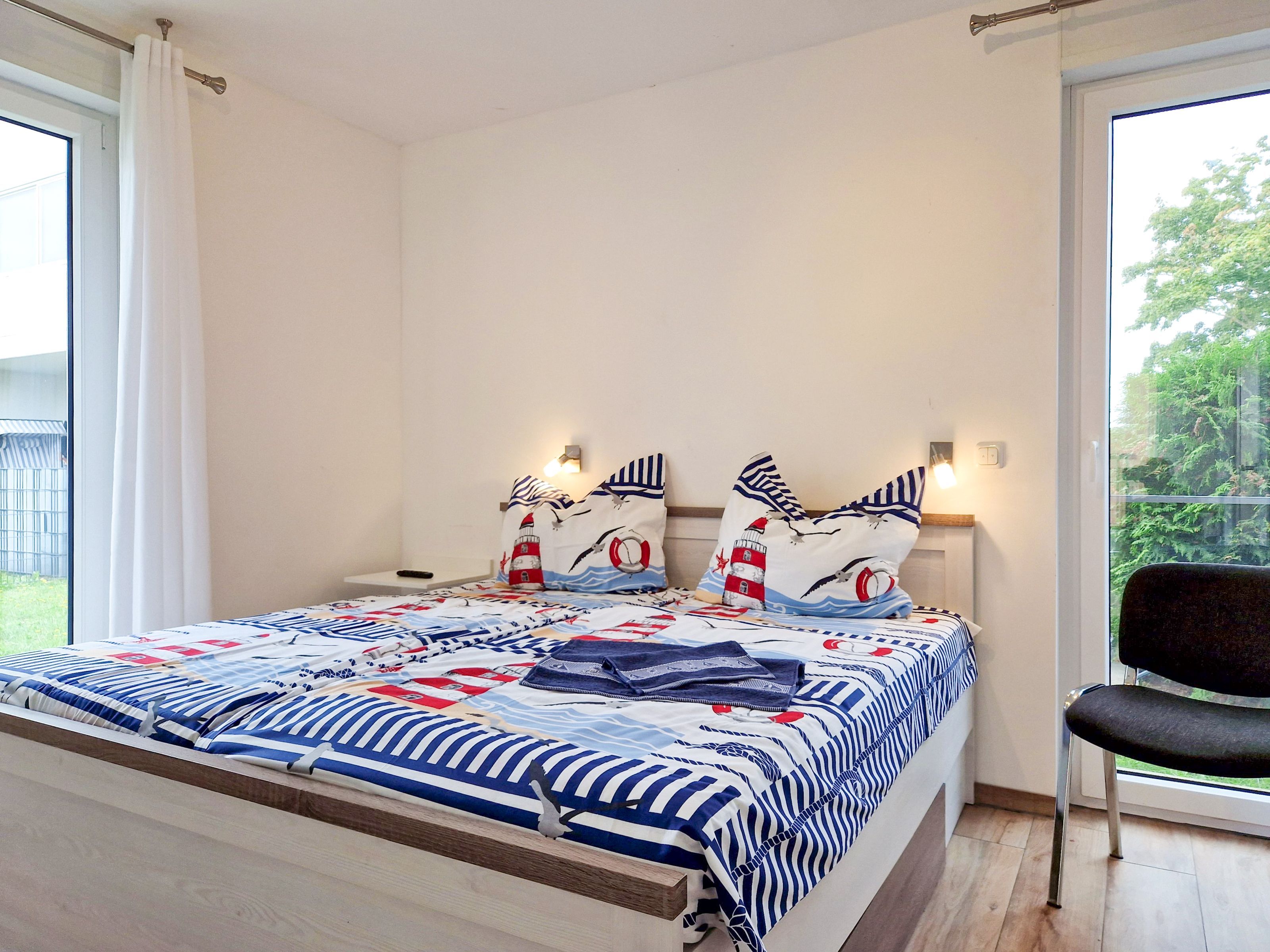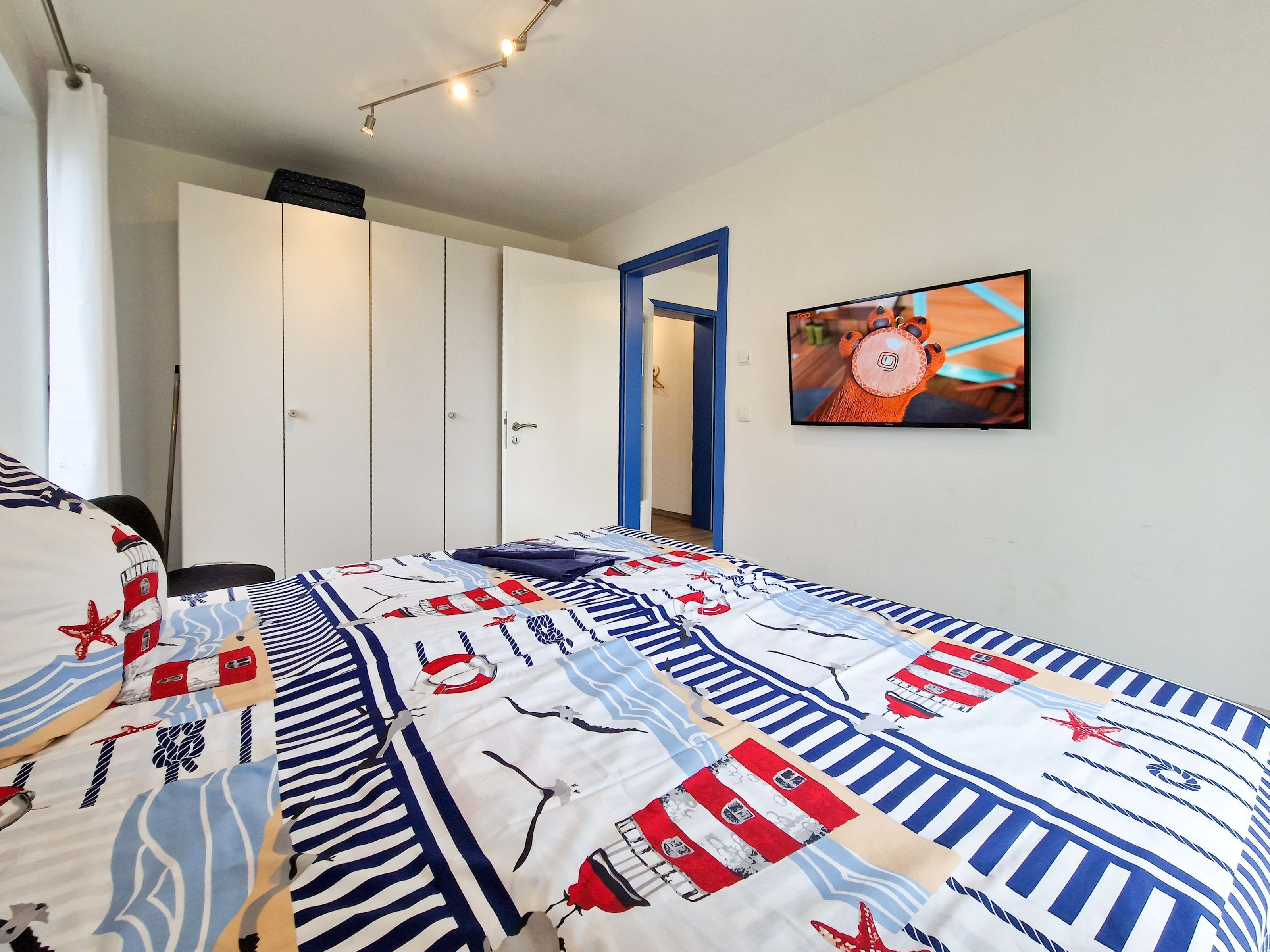 Im Schlafzimmer, vom Wohnraum aus zugänglich, steht ein Doppelbett (zwei 90 cm breite Matratzen); in den Schränken finden Sie Stauraum für Ihre Urlaubsgarderobe.