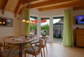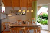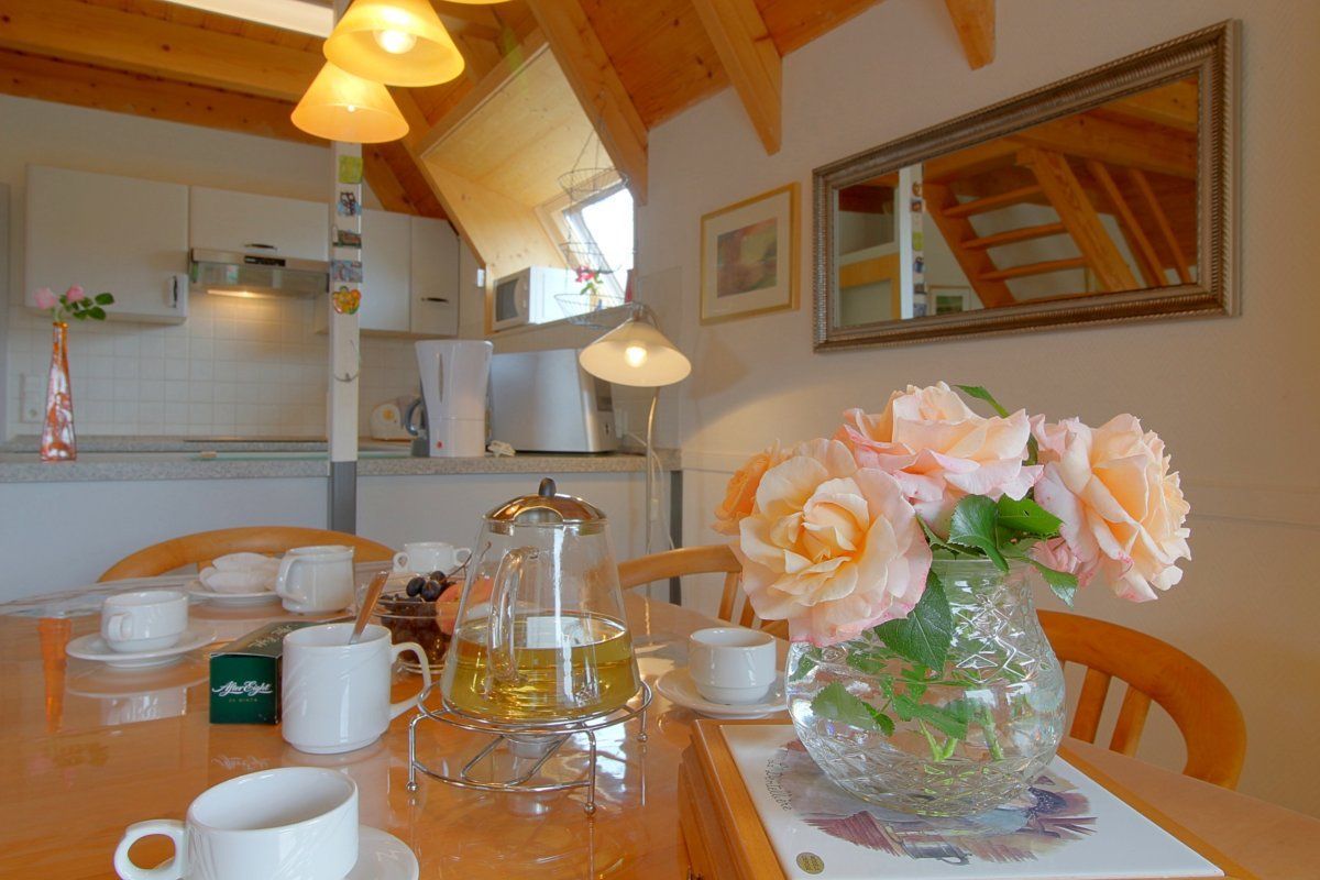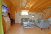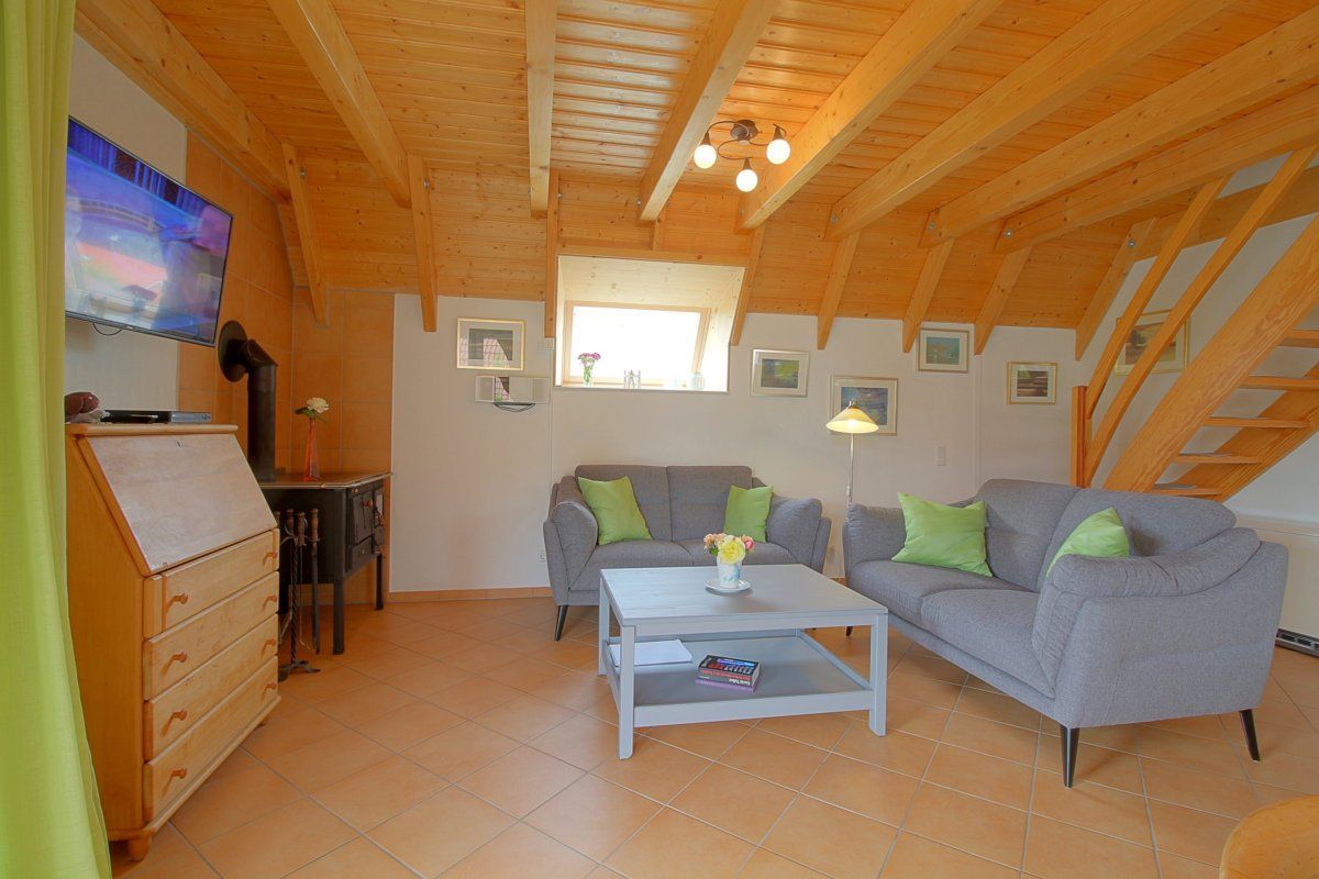 Das Erdgeschoss hat einen offenen Wohnbereich mit TV, CD, DVD, Radio und Kochkamin sowie den Essplatz mit Einbauküche (Kühlschrank, Gefrierschrank, Ceran Kochfeld, Mikrowelle, Backofen, Kaffeemaschine, Wasserkocher, Eierkocher, Toaster, Waffeleisen, Raclette-Gerät, Spülmaschine und reichlich Geschirr). Die geschmackvolle Einrichtung zieht sich durchs ganze Haus. Ein Kochherd, als Ofen zu gebrauchen, sorgt für Erinnerungen an die Ferien bei der Großmutter.