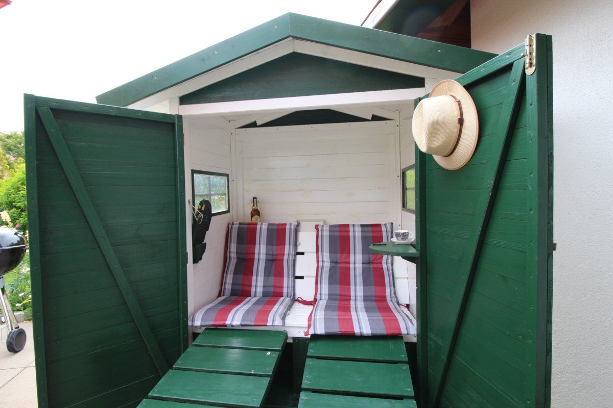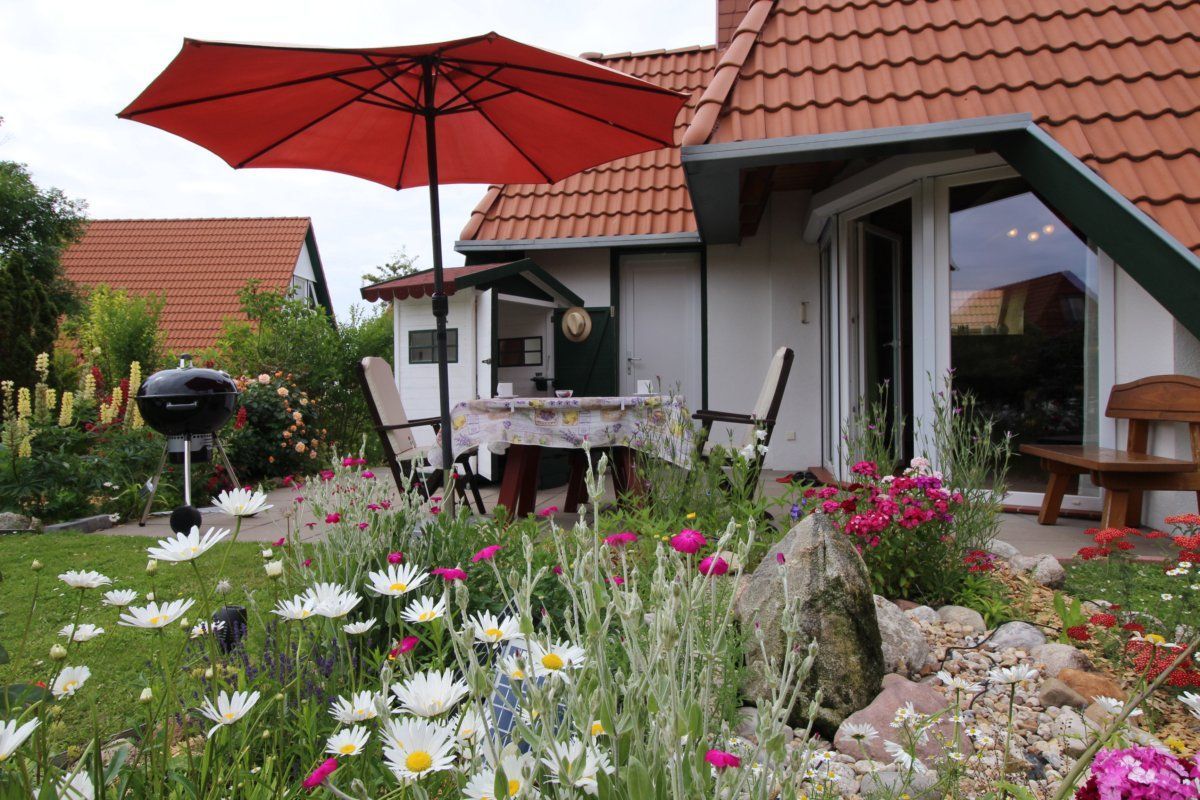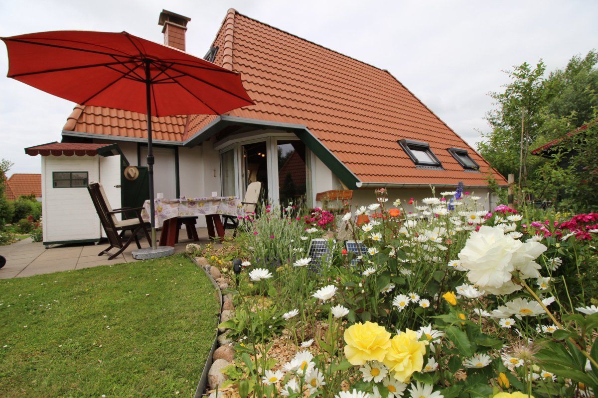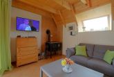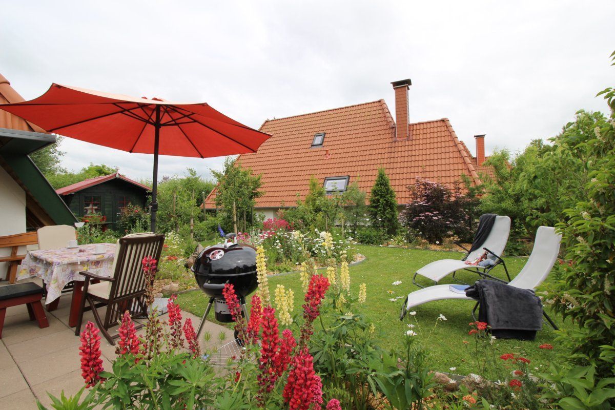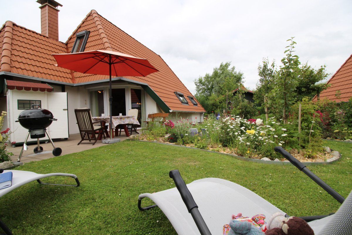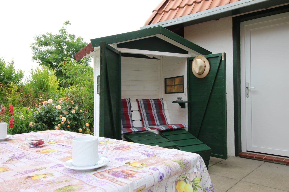 Die angrenzende Terrasse bietet einen schönen Blick in den hübsch angelegten Garten. Das sehr gelungene selbstgebaute Strandhaus lädt zu einem gemütlichen Beisammensein ein. Gartenmöbel, Sonnenliegen, Sonnenschirm und den Grill ndet man im Abstellraum. Ebenfalls im Erdgeschoss ist ein Schlafzimmer mit 1 Einzelbett (90 x 200 cm) und Kleiderschrank. Verdunklungsmöglichkeiten sind vorhanden und das moderne Tageslicht-Bad mit fast ebenerdiger Dusche und Waschmaschine liegt direkt gegenüber.