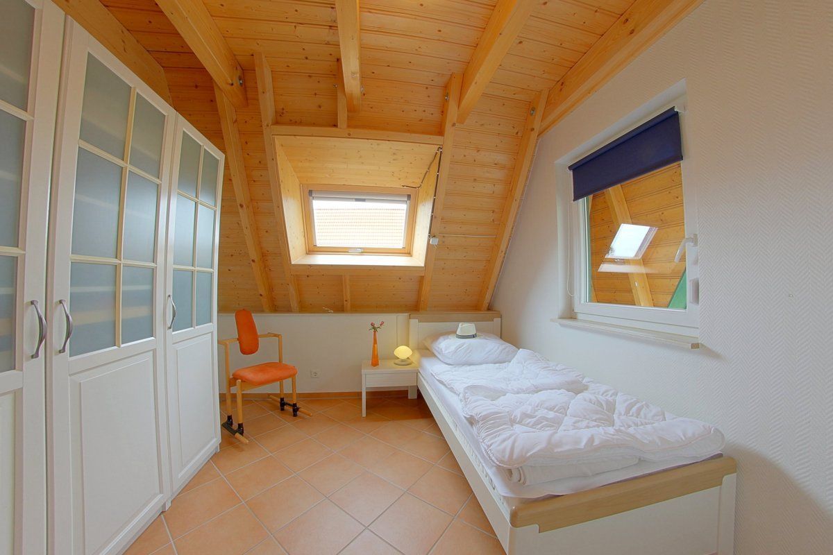 Im Obergeschoss benden sich zwei weitere Schlafzimmer und ein WC mit Waschbecken. Ein Schlafzimmer mit Doppelbett ( 180 x 200 cm ) und ein Schlafzimmer mit einem Einzelbett (90 x 200 cm) Weitere Merkmale: Reservierter Parkplatz, Treppenschutzgitter, Verdunklungsmöglichkeiten, moderne Fußböden und kostenloses WLAN. Alle Fenster inkl. Terrassenfenster haben einen Rollladen.
