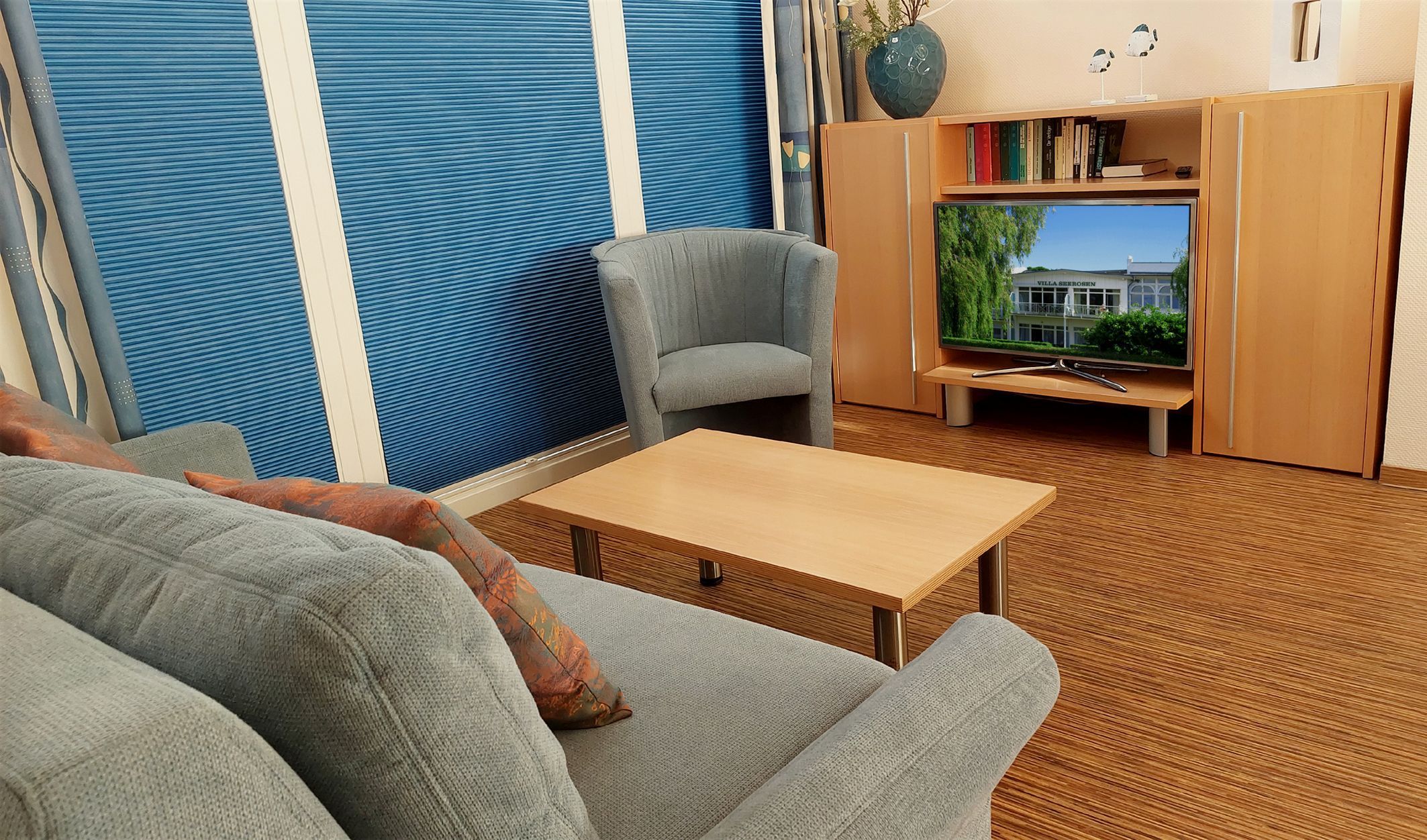 Der lichtdurchflutete Wohn- und Essbereich verfügt über ein gemütliches Sofa (mit Schlaffunktion), einen Smart-TV, eine kleine Hifi-Anlage und einen Essbereich mit 4 Sitzgelegenheiten.