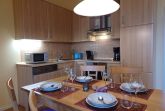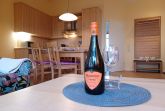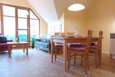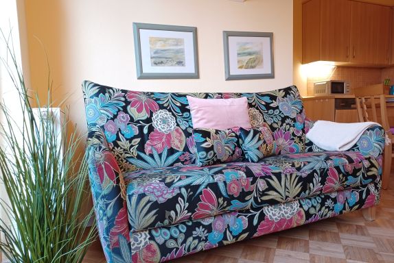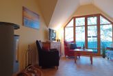Der offene Wohn- und Küchenbereich ist geschmackvoll eingerichtet und ist mit einem Kaminofen, einem TV mit USB/HDMI und Radio ausgestattet. Zur Ausstattung der offenen Küchenzeile gehört eine Kaffeemaschine, Wasserkocher, Kühlschrank mit Gefrierfach, Mikrowelle, Geschirrspüler und Herd mit Cerankochfeld und Backofen.