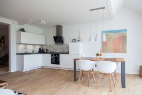 Die Unterkunft überzeugt mit zwei geschmackvoll eingerichteten Schlafzimmern, die mit hochwertigen Parkettböden ausgestattet sind. Hier können Sie nach einem aufregenden Tag am Strand erholsamen Schlaf finden. Der großzügige Wohnbereich mit Sofaecke und Essbereich ist ideal, um entspannte Abende mit der Familie oder Freunden zu verbringen. Die offene Küche ist mit modernsten Geräten, darunter ein Geschirrspüler, Kühlschrank, und eine Kaffeemaschine, ausgestattet und lässt keine Wünsche offen.