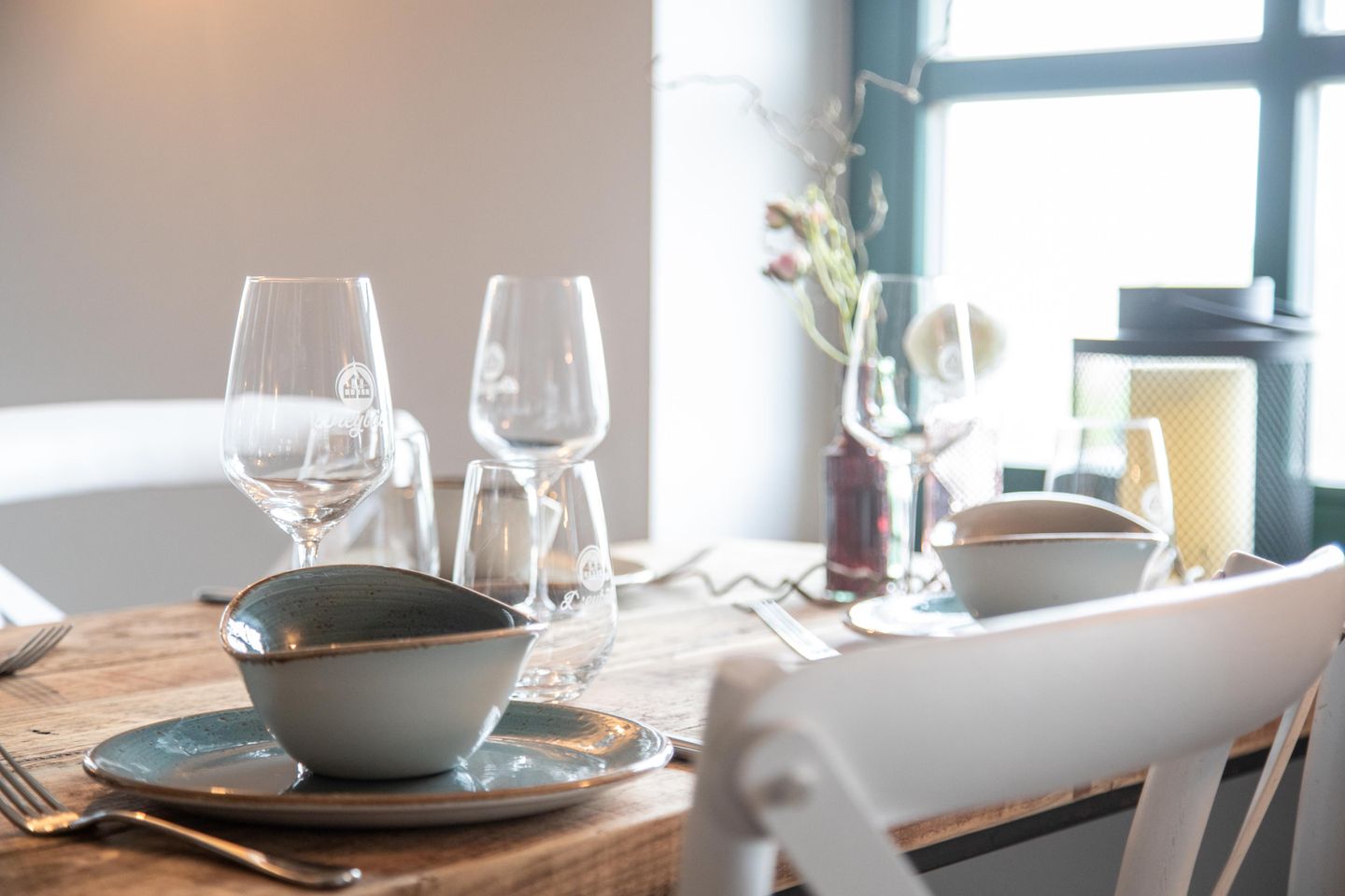Im ersten Obergeschoss bildet der großzügige lichtdurchflutete Wohn- und Essbereich mit Küchenzeile das gemütliche Herz der Wohnung. Die vollausgestattete Küche lässt mit hochwertigem Geschirr, Mikrowelle und KitchenAid-Geräten keine Wünsche offen. An den einladenden Essbereich mit handgefertigtem Tisch und bequemen Lederstühlen schließt sich die heimelige Sofa-Ecke an: Sowohl von der extralangen Ledercouch als auch von den beiden Sesseln fällt der Blick durch das große Fenster auf den nahen Deich. Im Sommer lassen sich die Dachflächenfenster zu kleinen Balkonen öffnen.
