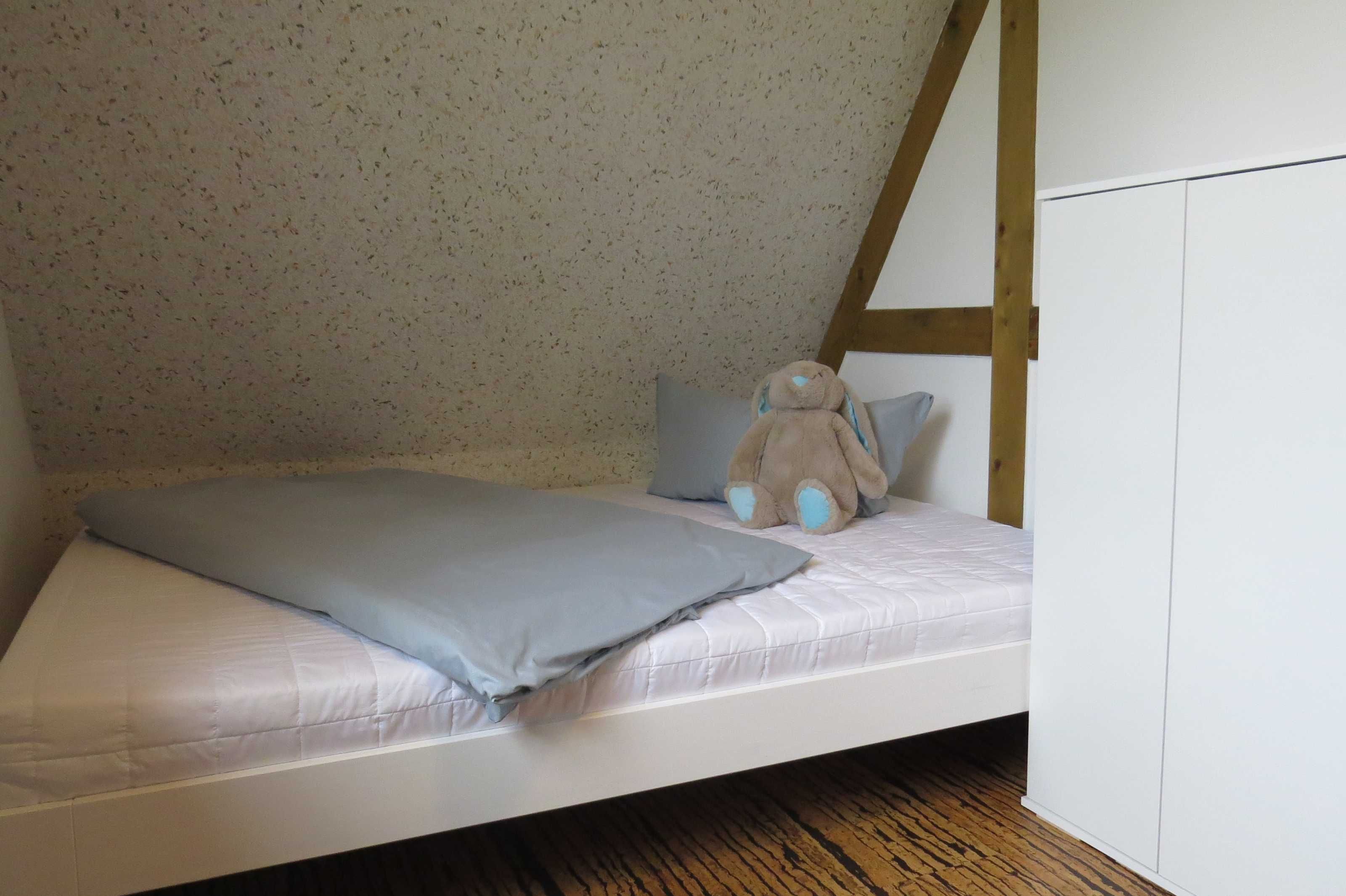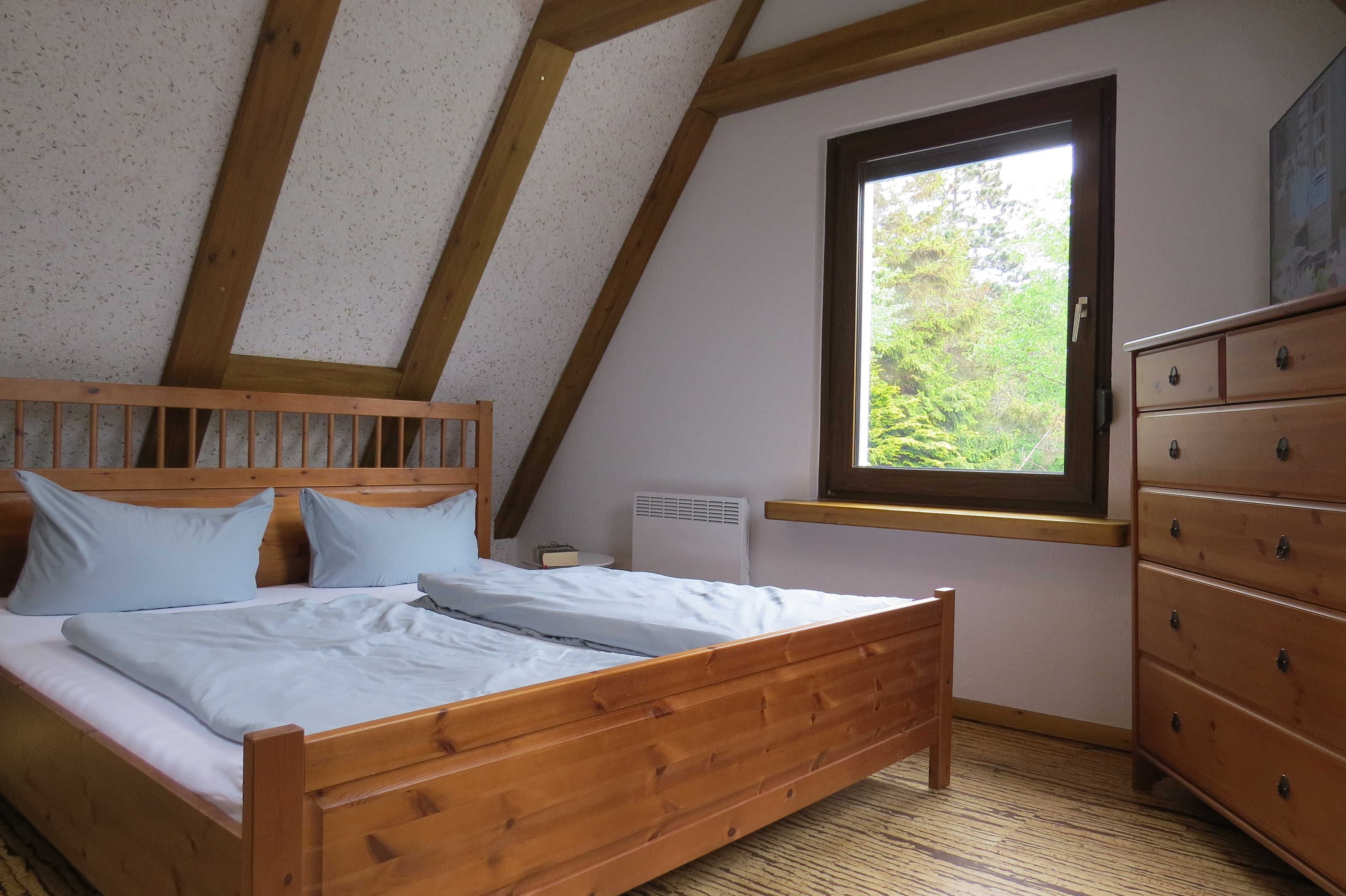 Das Ferienhaus bietet Ihnen auf 130 qm Platz für bis zu 6 Personen. Es erstreckt sich über ein Untergeschoss mit Terrasse und ein Obergeschoss mit offenem Schlafzimmer. Das Obergeschoss ist nur über eine Raumspartreppe ohne Geländer zu erreichen. Die Einzelbetten haben jeweils die Maße 140x190cm.