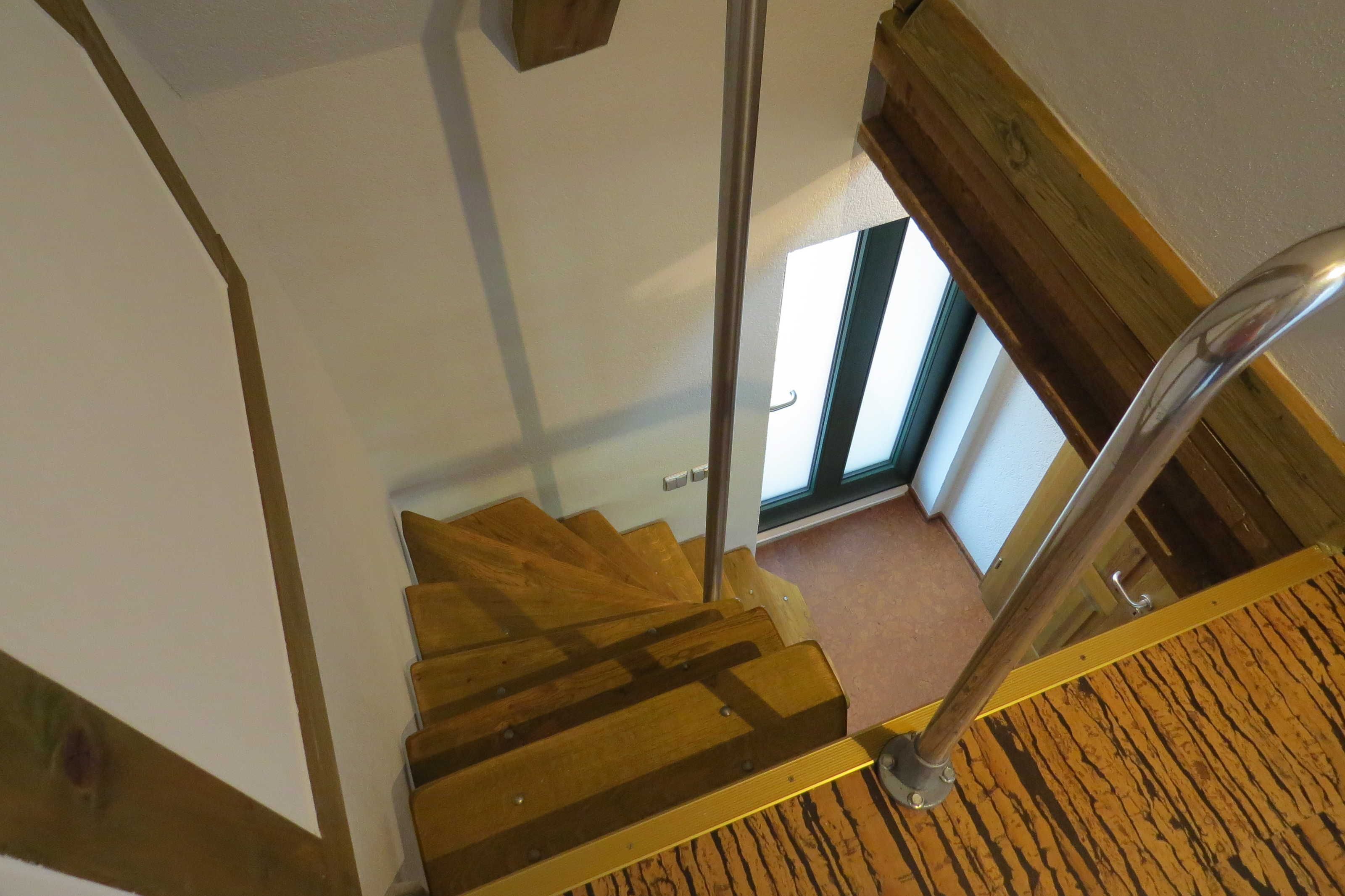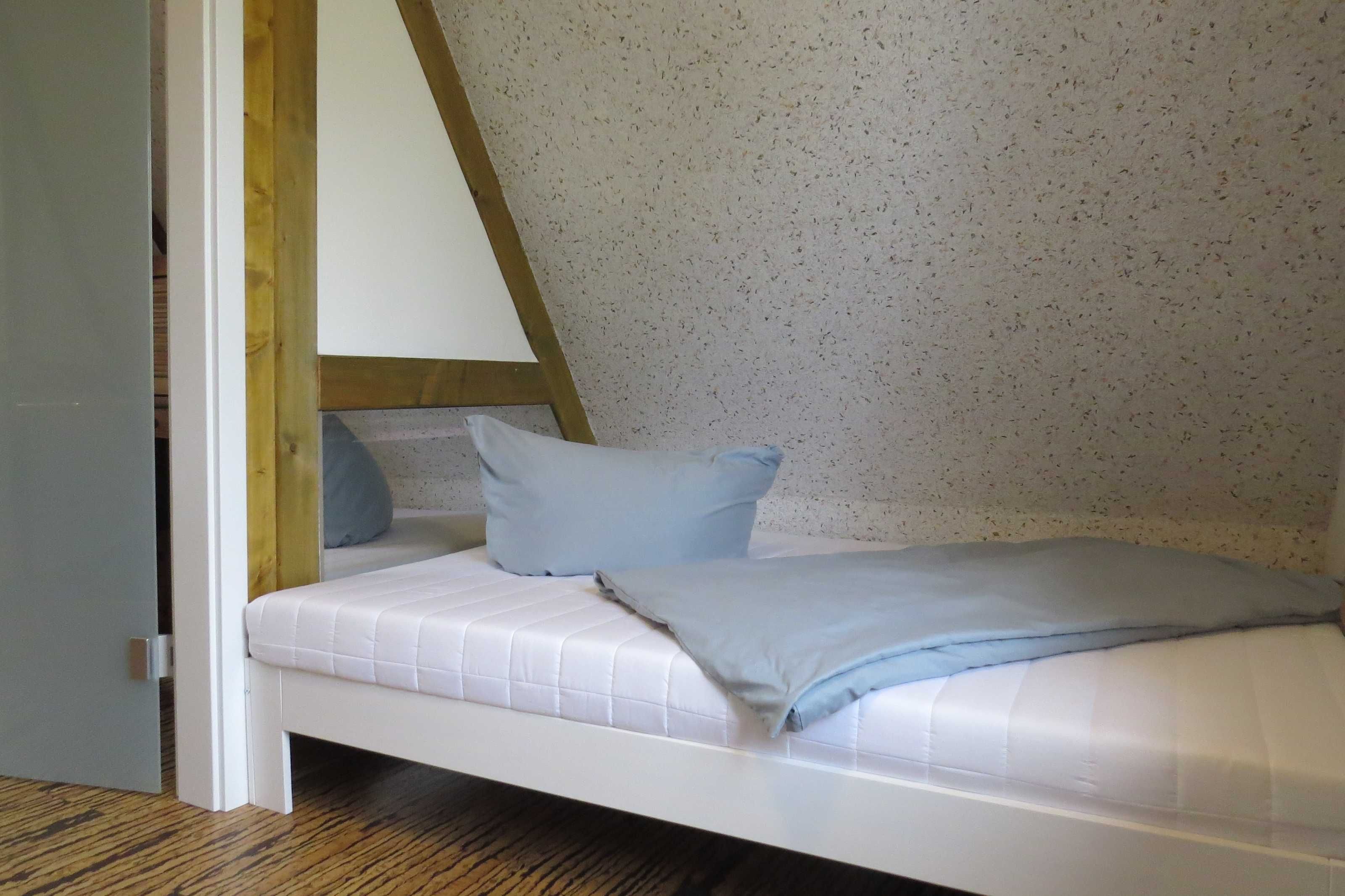 In der oberen Etage finden Sie mit Galeriecharakter ein weiteres Schlafzimmer. Zur Nacht können Sie dann sogar das Meer rauschen hören. In das Obergeschoss führt eine Raumspartreppe ohne Geländer.