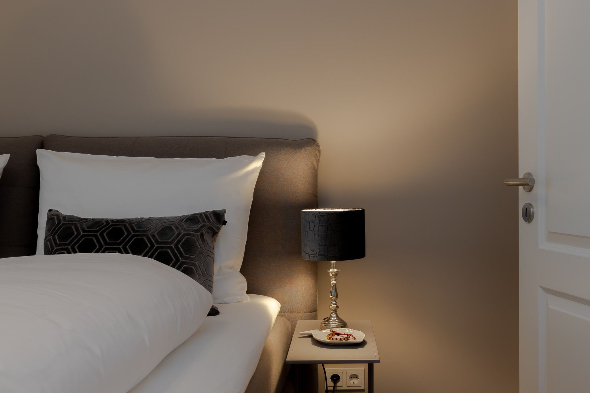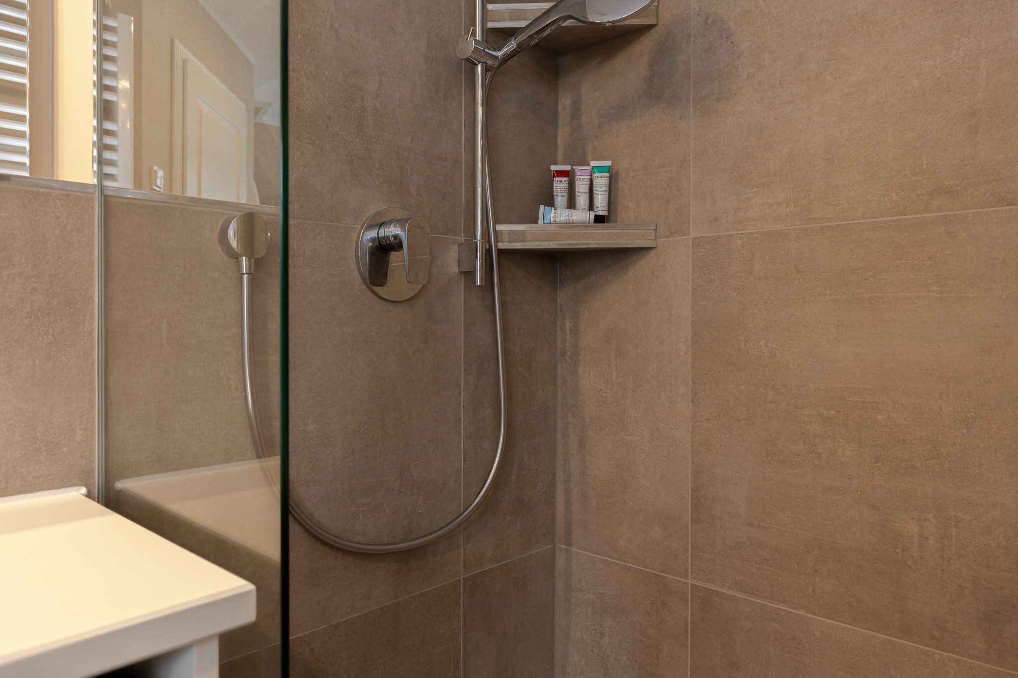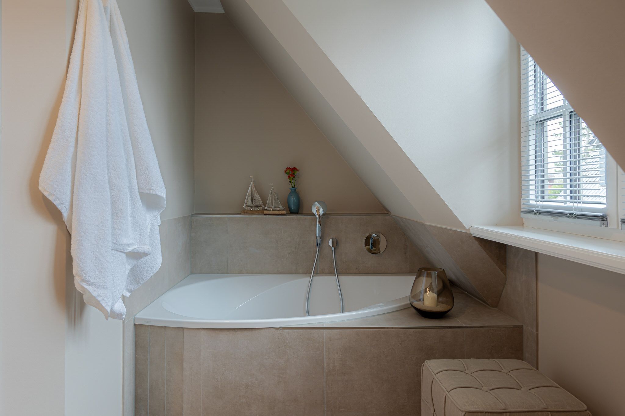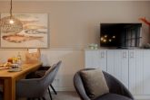 Im Obergeschoss befindet sich das zweite Schlafzimmer, welches ebenfalls über ein gemütliches Boxspringbett, einen Flatscreen-TV und einen großzügigen Kleiderschrank verfügt. Das Badezimmer Eine kleine eigene Wohlfühloase, mit Tageslicht, hellen Lime Stone Fliesen, einer Badewanne und einer Dusche.