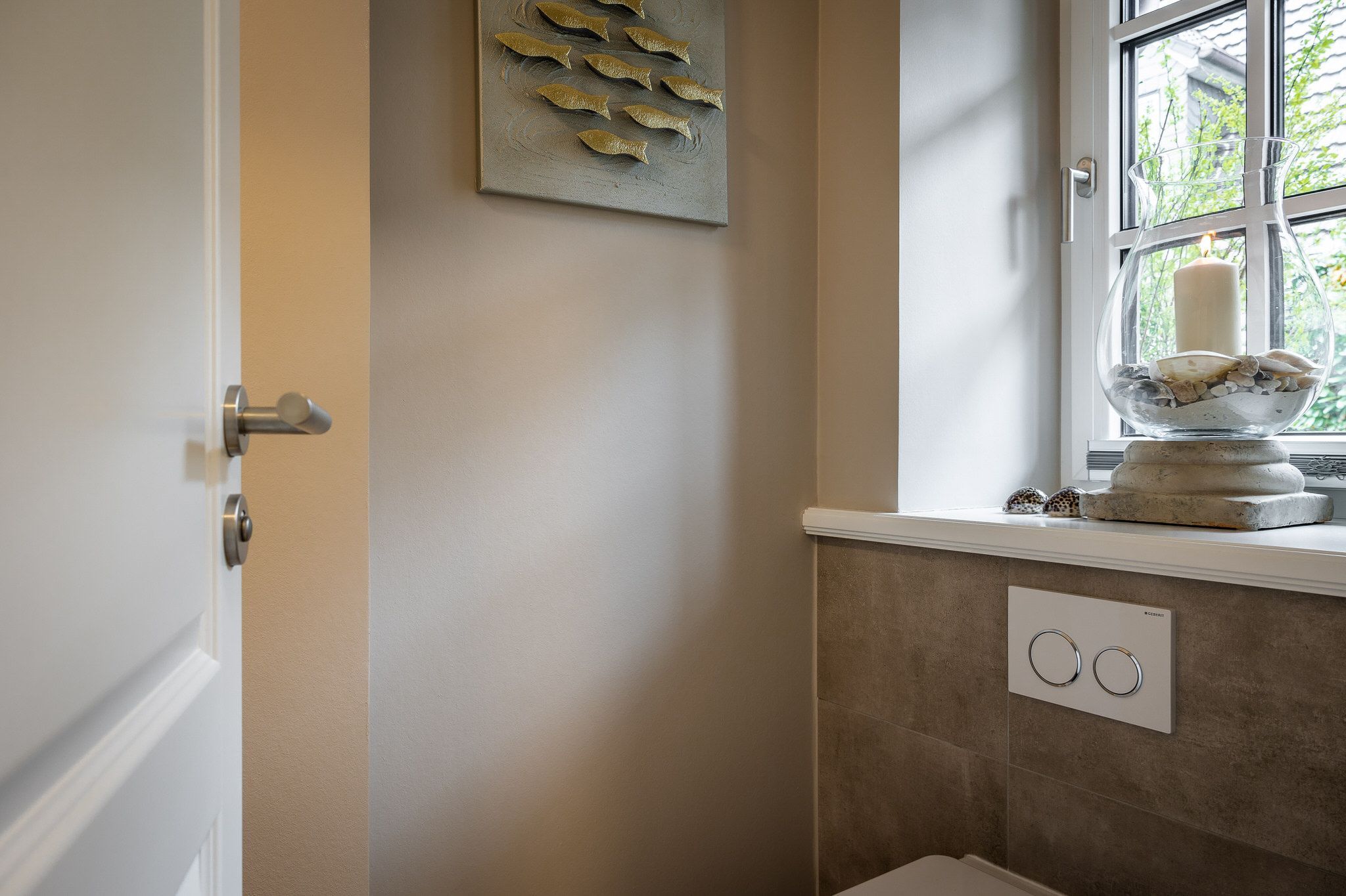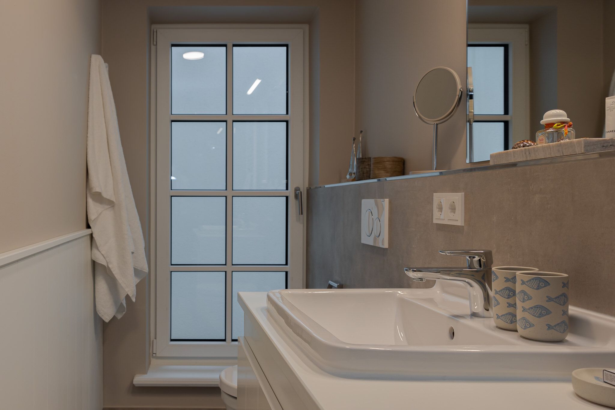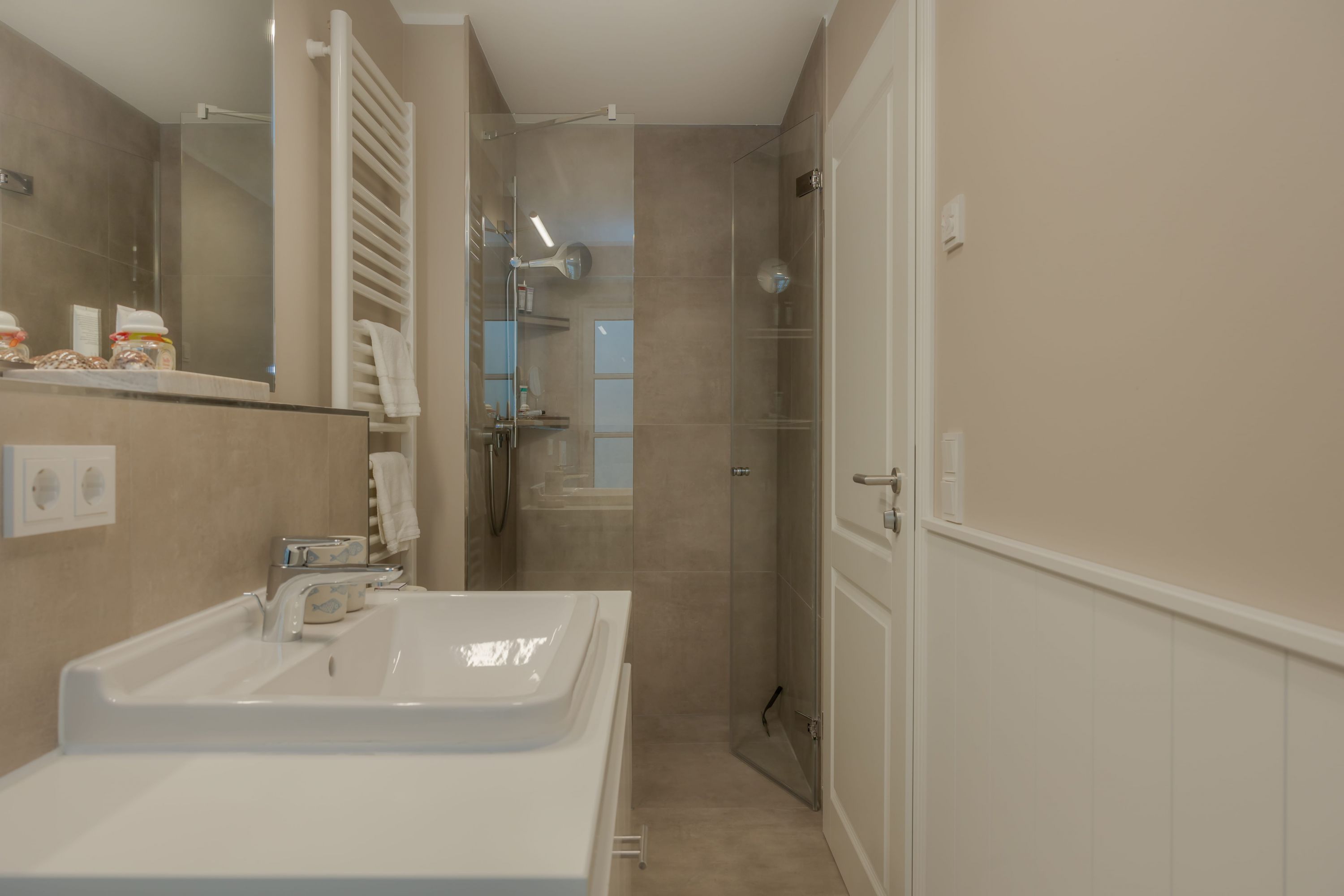 Im hellen Untergeschoss befindet sich ein geräumiges Schlafzimmer mit bodentiefen Fenstern. Das große und gemütliche Boxspringbett von Dieter Knoll lädt nach einem langen Tag am Strand und weiten Spaziergängen zum Erholen ein. Ihre Kleidung findet genügend Platz in der geschreinerten Schrankwand. Neben dem Schlafzimmer befindet sich ein geräumiges und helles Badezimmer mit Tageslicht, Dusche und WC. Das Tageslicht und die hellen Natursteinfliesen bringen die Cozy Sylt Vibes auch ins Badezimmer. Ebenso finden Sie hier einen kleinen Hauswirtschaftsraum mit Waschmaschine und Trockner.