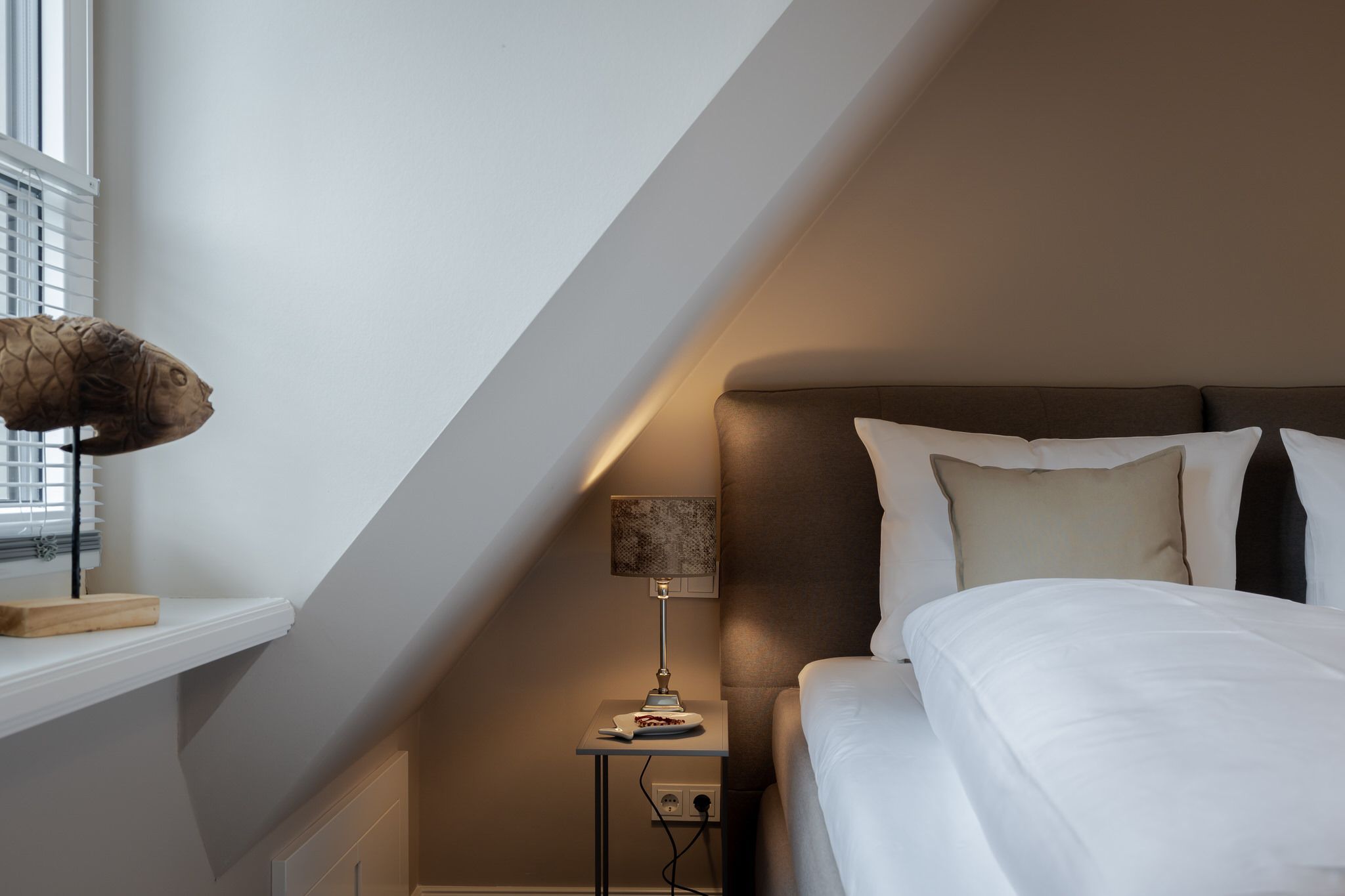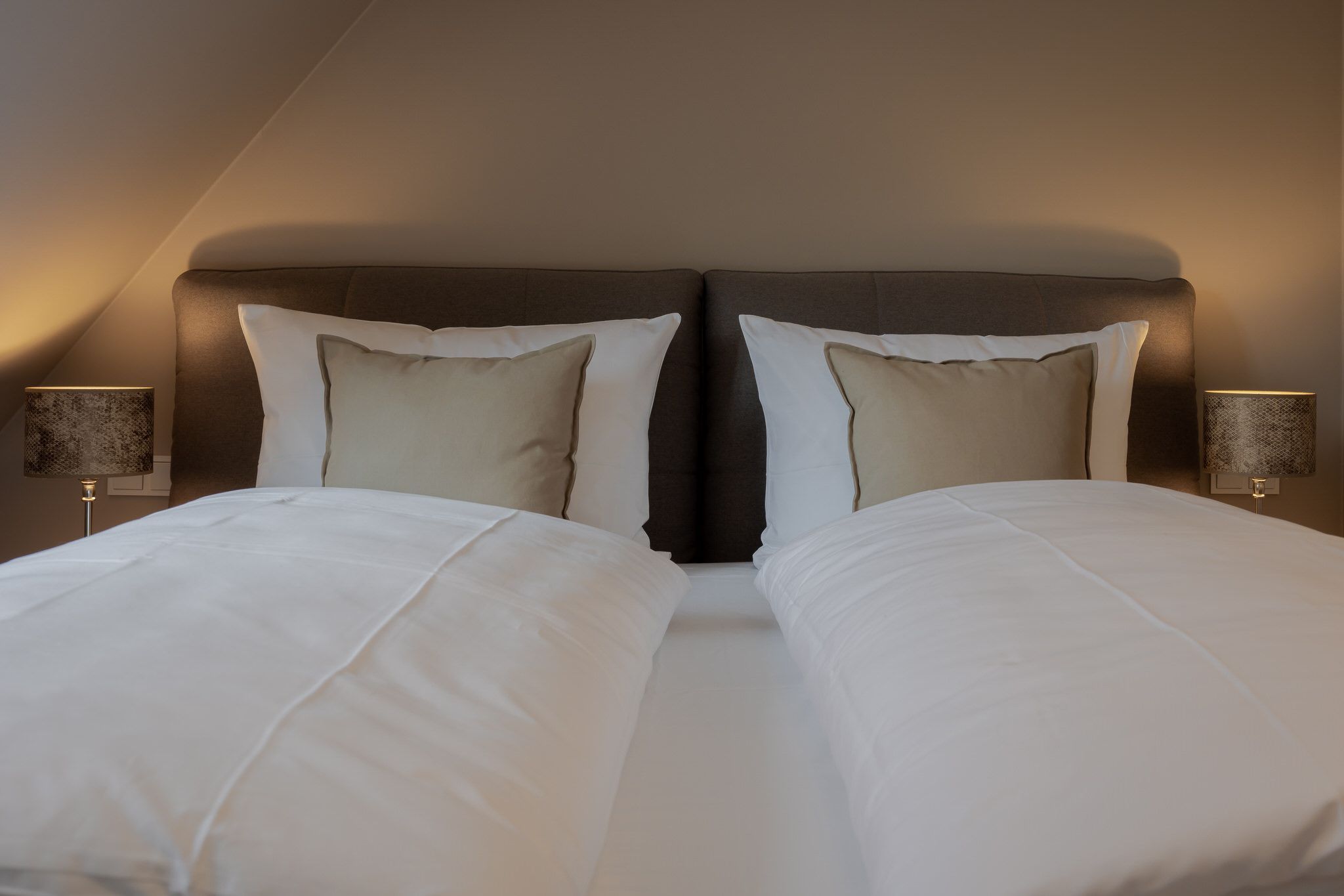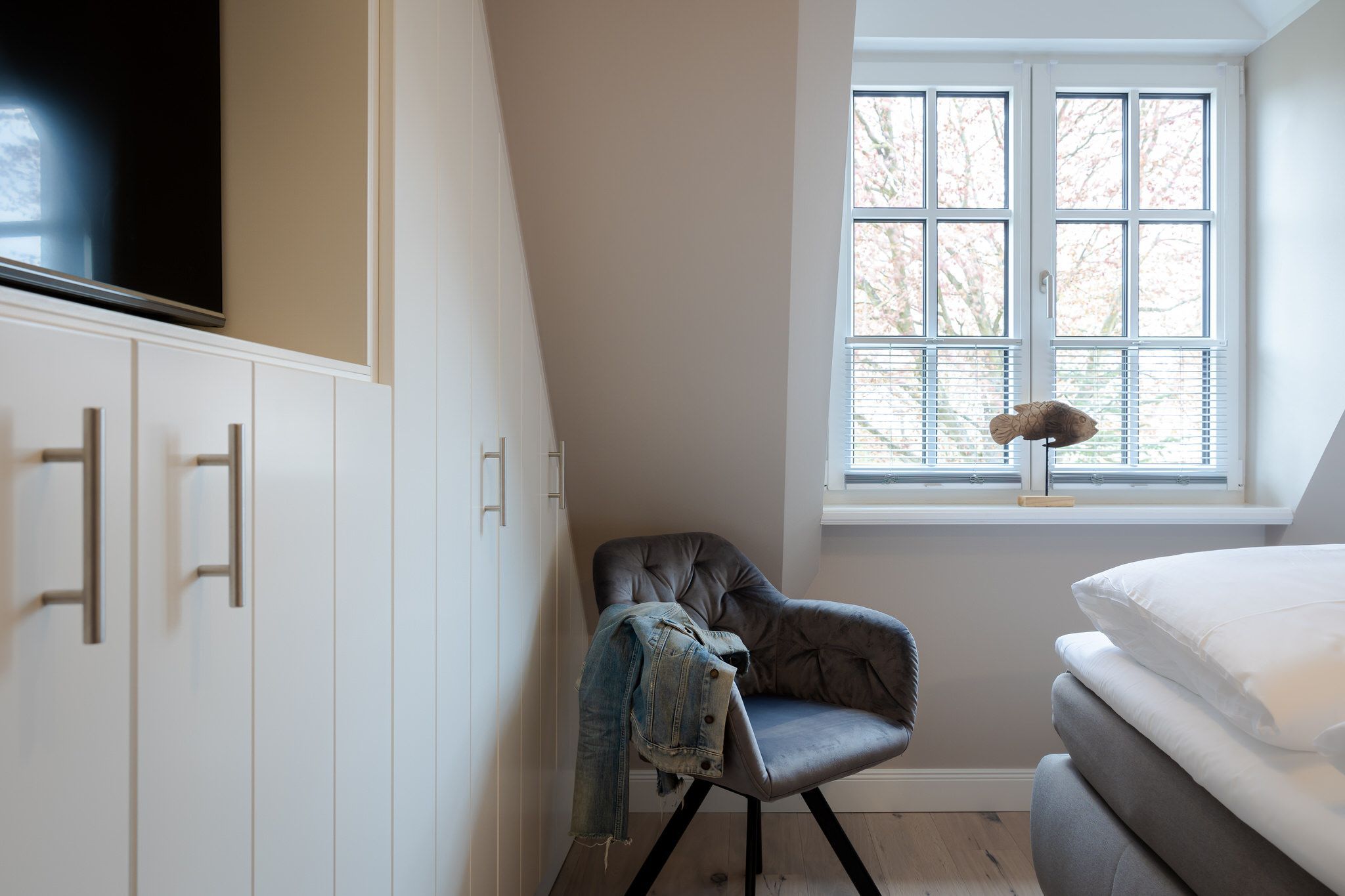 Der Spitzboden bietet einen gemütlichen Rückzugsort, besonders für die kleinen Syltbesucher. Hier wurden zwei Einzelbetten durch einen Schreiner integriert und bieten einen weiteren Schlafplatz direkt unter dem Dach.