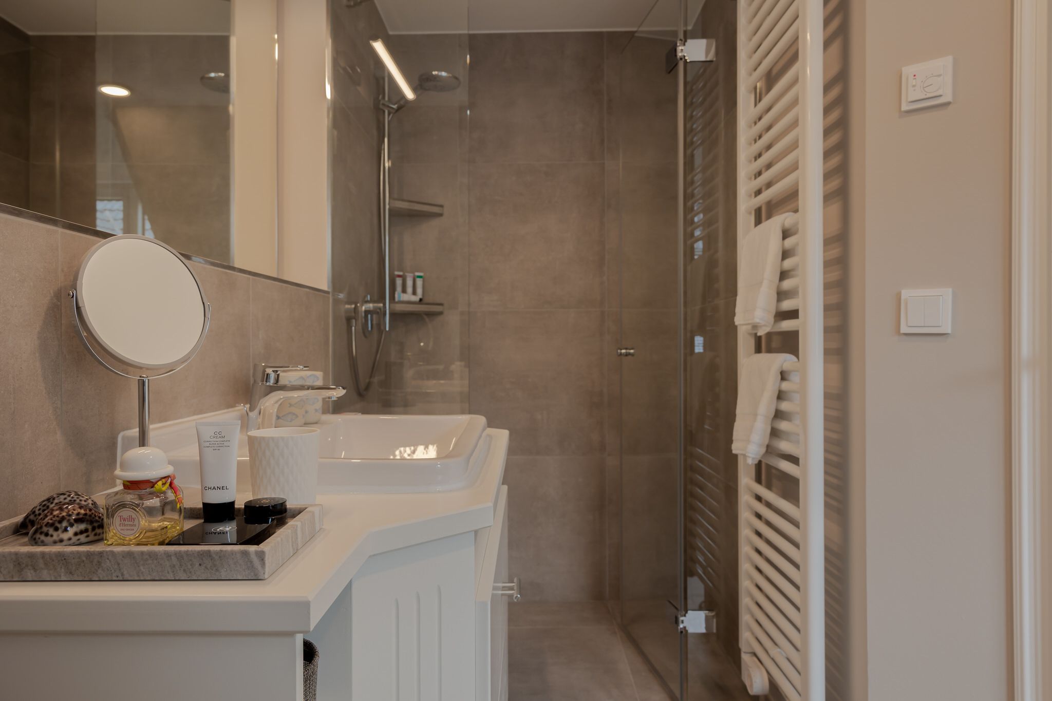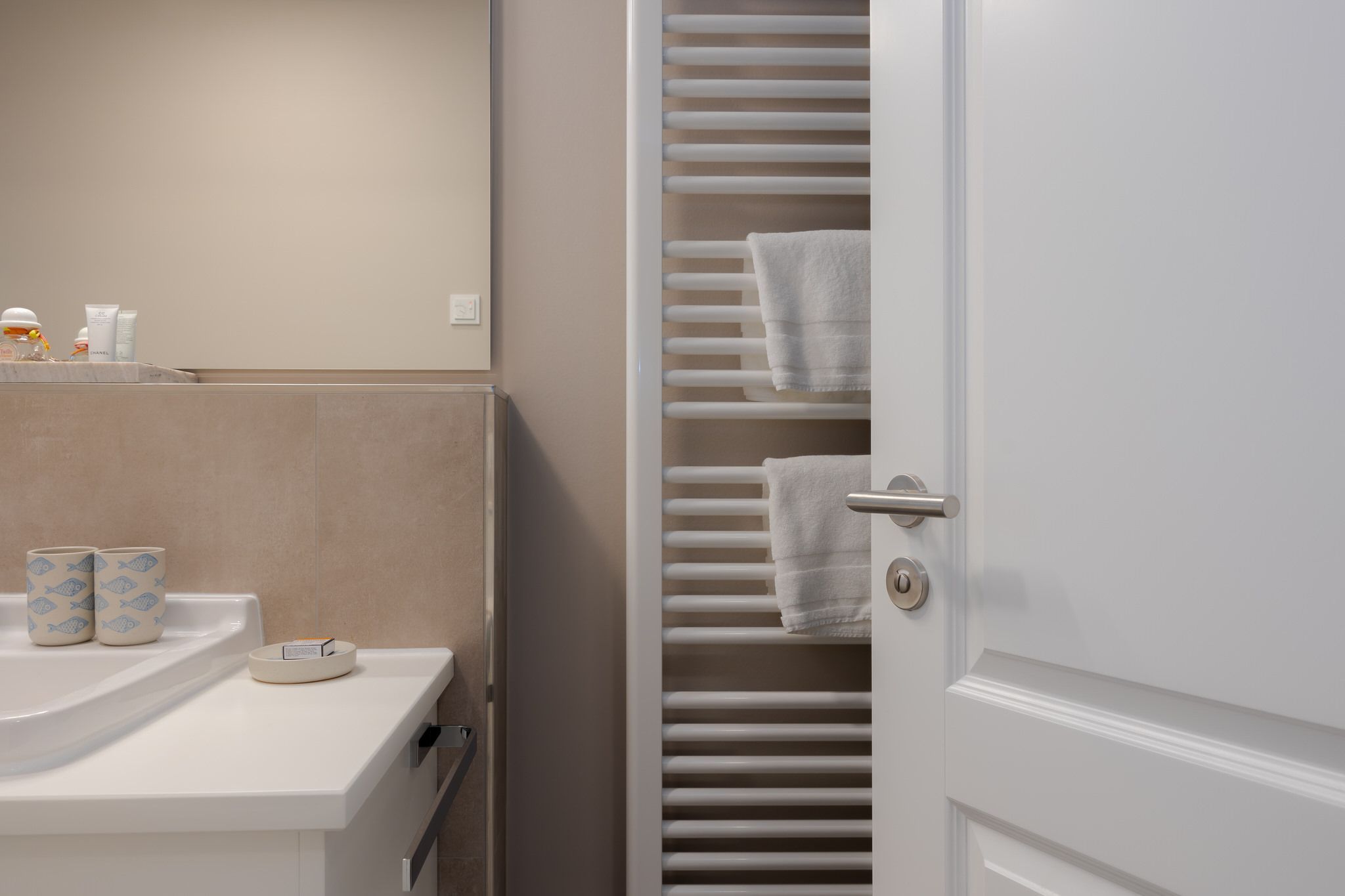 Die Küche ist bestens ausgestattet und verfügt über ein Induktionskochfeld, einen Backofen, eine Geschirrspülmaschine und eine Nespresso-Maschine. Am Esstisch finden bis zu sechs Personen Platz und von dort aus gelangen Sie auf die großzügige und möblierte Terrasse (von April bis Oktober). Die Terrasse ist zum Westen hin ausgerichtet und bietet genügend Privatsphäre. Auf dieser Etage finden Sie ebenfalls ein kleines Gäste-WC.