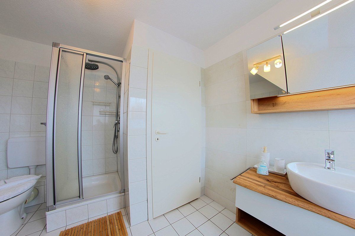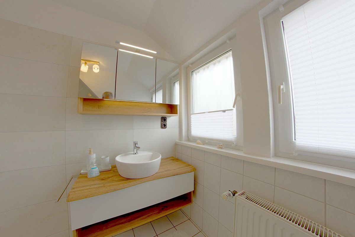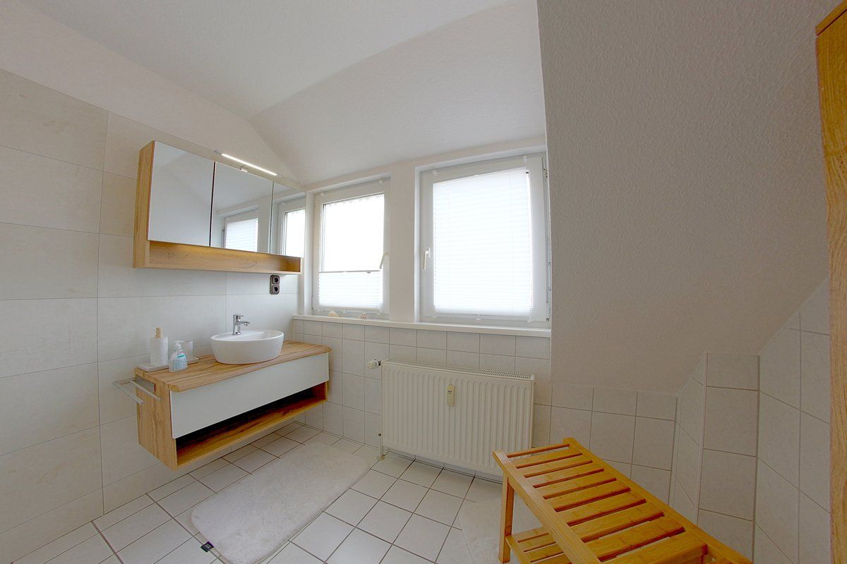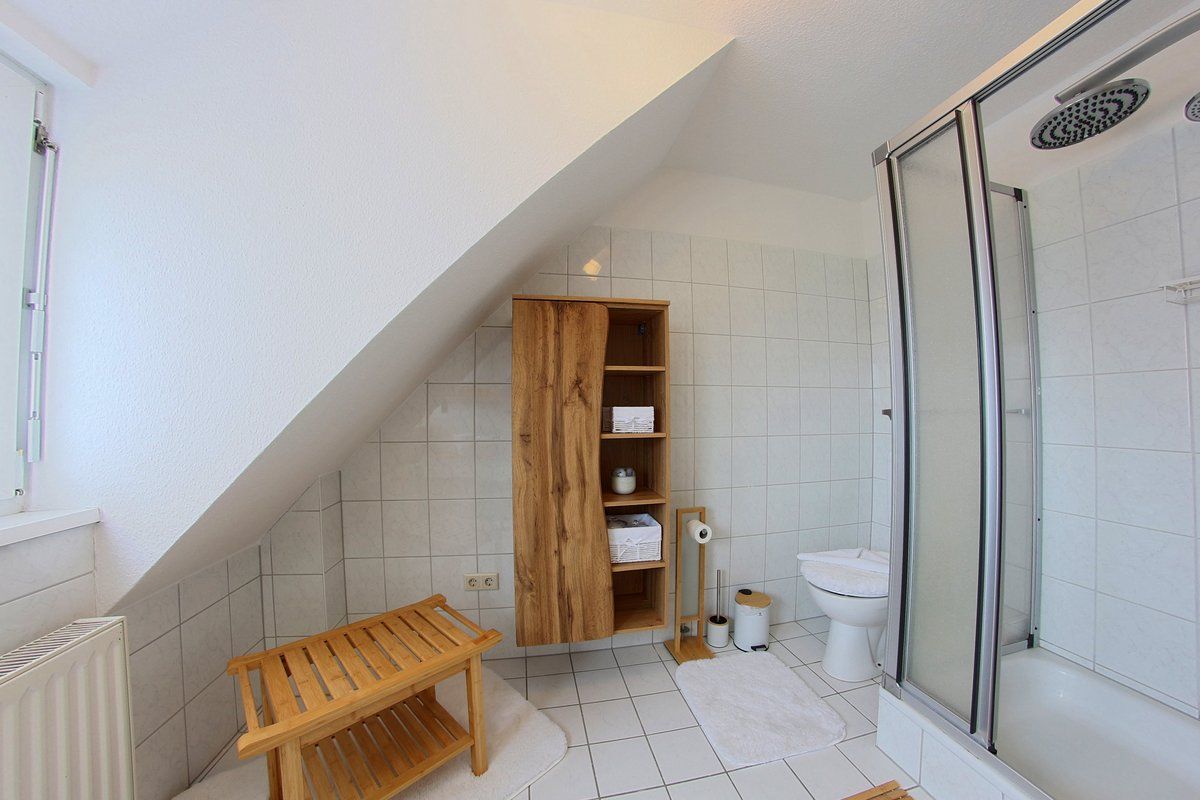 Ein geräumiges Schlafzimmer mit Doppelbett und großem Kleiderschrank sorgt für erholsamen Schlaf. Ein helles Duschbad mit Fenster befindet sich in der Ebene.