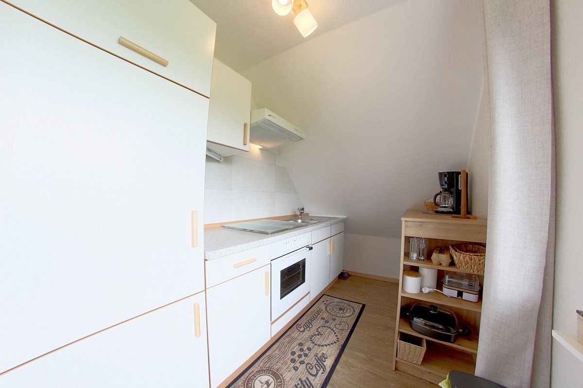 Komplett ausgestattete Küchenzeile mit Herd, Backofen, Kühlschrank mit Gefrierschrank, Kaffeemaschine, Toaster etc., auch hier fehlt es an nichts.
