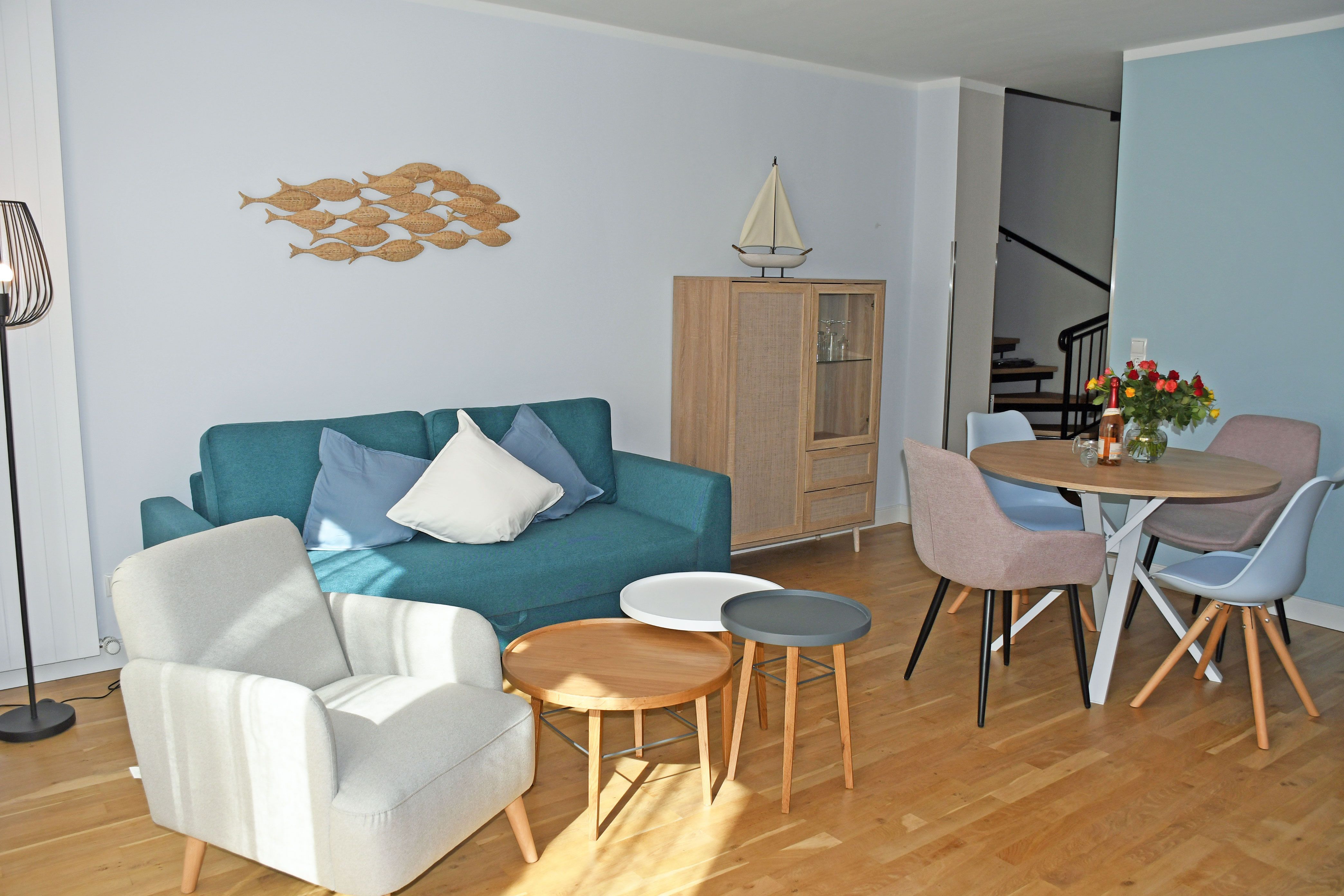 Unsere Maisonett-Ferienwohnungen bieten Platz für 5 Gäste und ein Kind bis 3 Jahre im Kinderreisebett, sie wurden 2022 komplett renoviert und neu im modernen nördlich maritimen Stil eingerichtet.