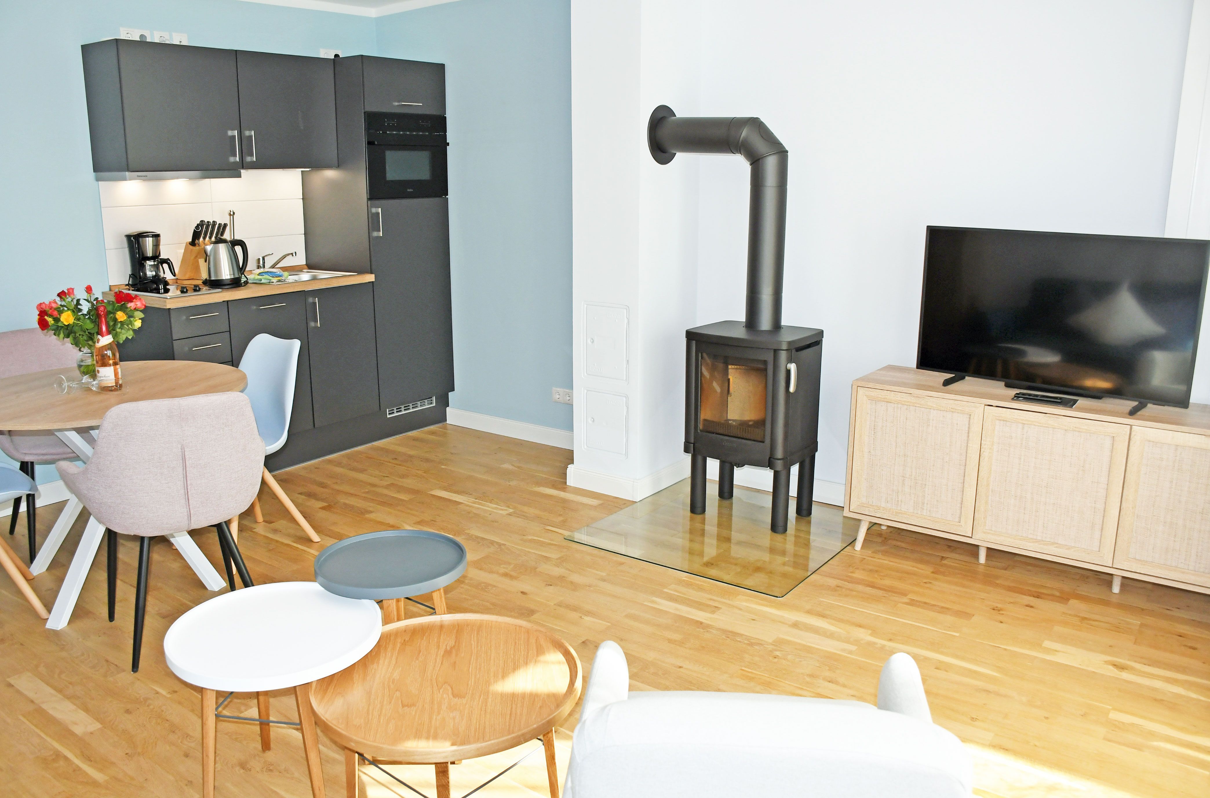 Das Wohnzimmer verfügt über einen Flachbild-TV, eine Sitzcouch, Sessel, Tisch, eine Essecke und eine Schlafcouch. Ein kleiner Kaminofen wird die Attraktivität der Ferienwohnung besonders in der dunklen Jahreszeit erheblich steigern. Auf der Schlafcouch im Wohnraum (1,60m breit) können zwei Aufbettungen hergestellt werden.