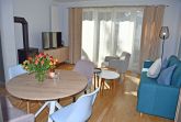 Das Wohnzimmer verfügt über einen Flachbild-TV, eine Sitzcouch, Sessel, Tisch, eine Essecke und eine Schlafcouch. Ein kleiner Kaminofen wird die Attraktivität der Ferienwohnung besonders in der dunklen Jahreszeit erheblich steigern. Auf der Schlafcouch im Wohnraum (1,60m breit) können zwei Aufbettungen hergestellt werden.