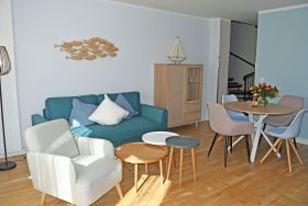 Unsere Maisonett-Ferienwohnungen bieten Platz für 5 Gäste und ein Kind bis 3 Jahre im Kinderreisebett, sie wurden 2022 komplett renoviert und neu im modernen nördlich maritimen Stil eingerichtet.