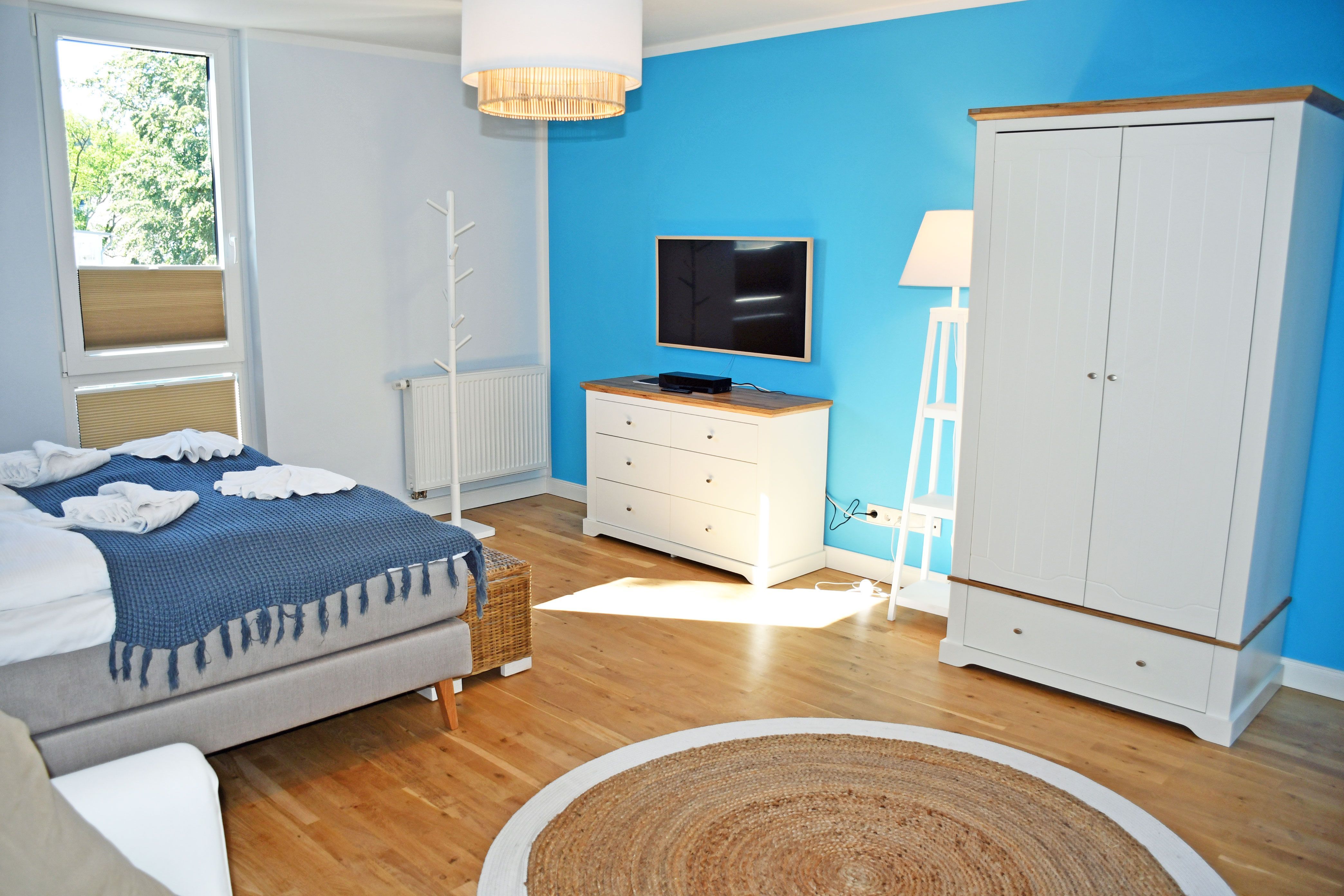 Jede der Wohnungen wird ebenerdig über die Eingangstür betreten. Hier erstreckt sich gleich rechtsseitig ein kleines Duschbad, sowie dem Flur folgend ein großzügiger langgezogener Schlafraum. Ein bequemes Boxspringbett (1,80m) mit Nachttischen und Leselampen sorgt hier für hohen Komfort und erholsamen Schlaf der Gäste und bildet den zentralen Punkt des Raumes. Ein 3- türiger Kleiderschrank und eine Kommode bieten ausreichend Stauraum für Kleider, das Schlafsofa im gradlinigen nordischen Stil bietet die Möglichkeit einer zusätzlichen Aufbettung für einen Gast in dem großen Schlafraum. Der große Bettkasten bietet Stauraum für die zur Aufbettung zusätzlich benötigten Bettdecken. Die Fenster können bei Bedarf zum Schlafen verdunkelt werden.