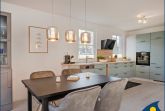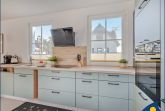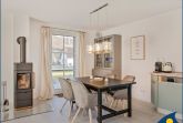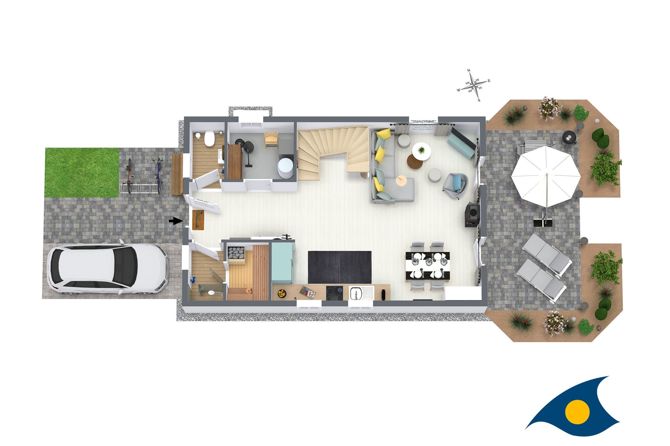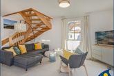 In der offenen Küche mit angrenzendem Essplatz und Wohnzimmer werden gemeinsame Abende zu einem gemütlichen Zusammensein. Das Badezimmer im Erdgeschoss verfügt über eine Sauna und eine Dusche.