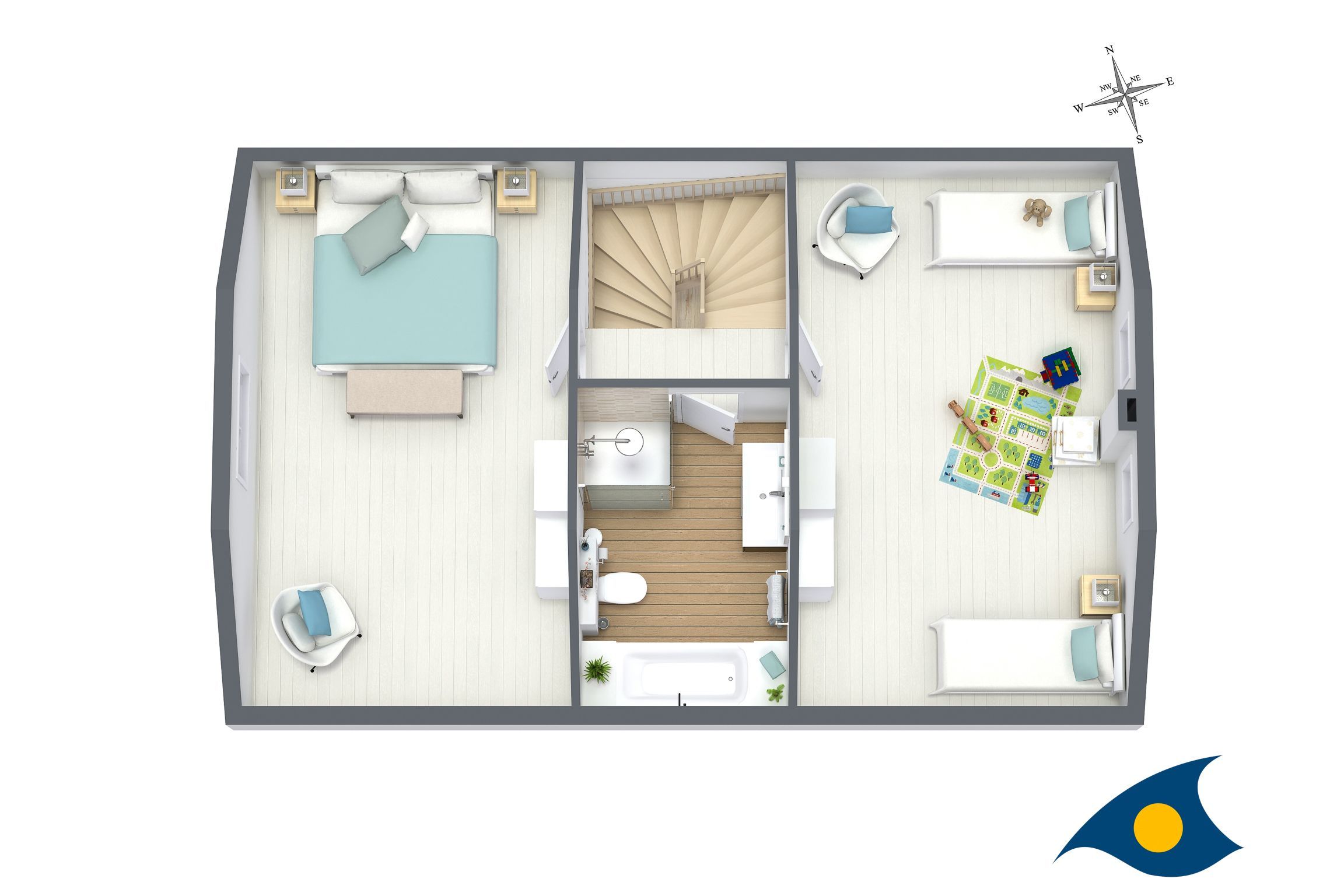 Im Obergeschoss befinden sich zwei Schlafzimmer mit ausreichend Strauraum für Ihre privaten Sachen und ein großzügiges Badezimmer mit Badewanne und Dusche.