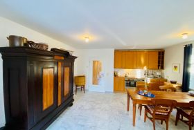 Der Wohnbereich hat eine Sitzecke mit TV. Vom Wohnzimmer aus gelangen Sie zur offener Komplettküche mit großem Esstisch.