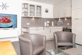 Das Apartment besteht aus einem Schlafzimmer mit 1 Doppelbett , einem Wohnbereich mit zusätzlichem Schlafsofa für 2 Personen und einem Badezimmer mit Dusche sowie WC. Die Ferienwohnung beinhaltet eine voll ausgestattete offene Küche.