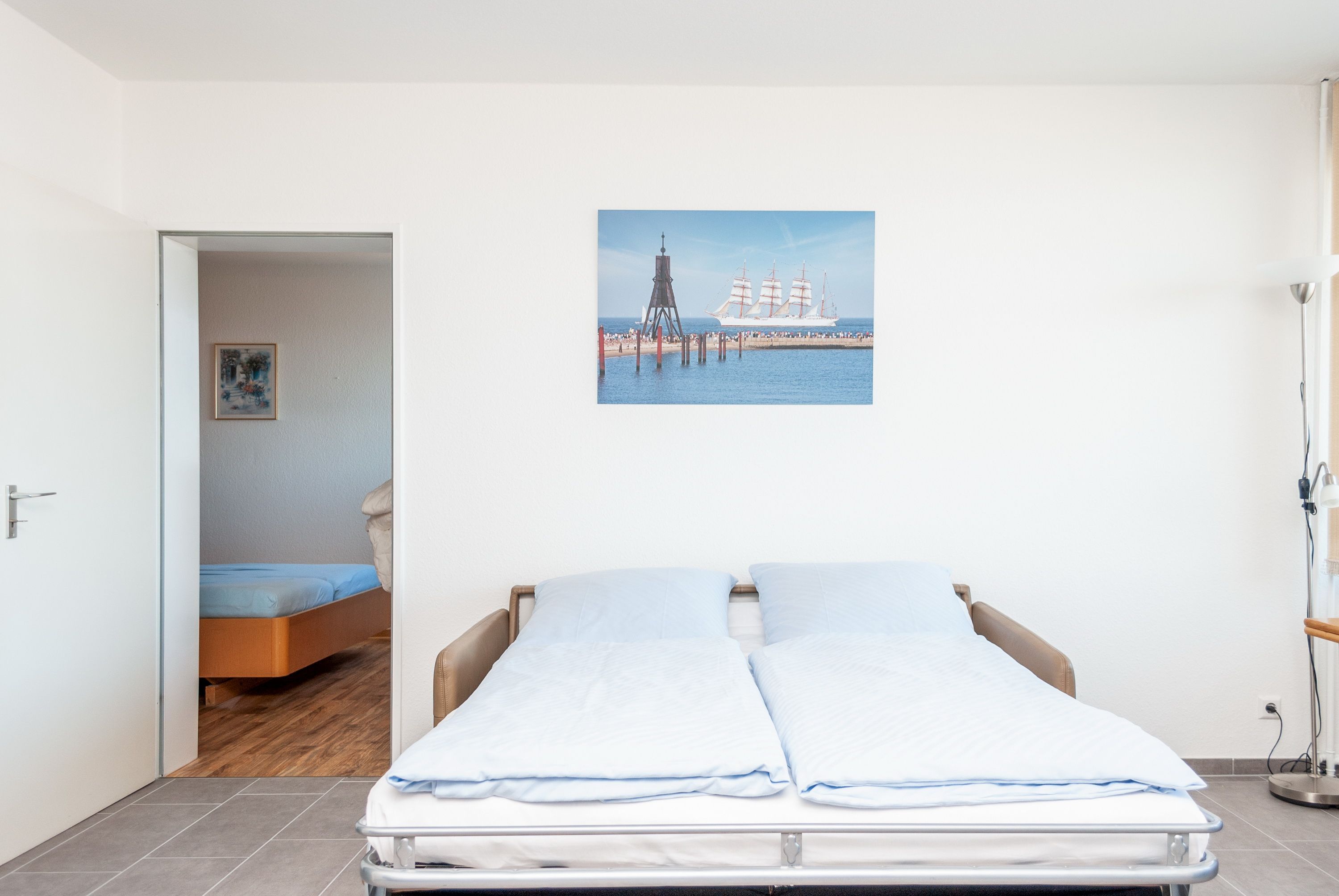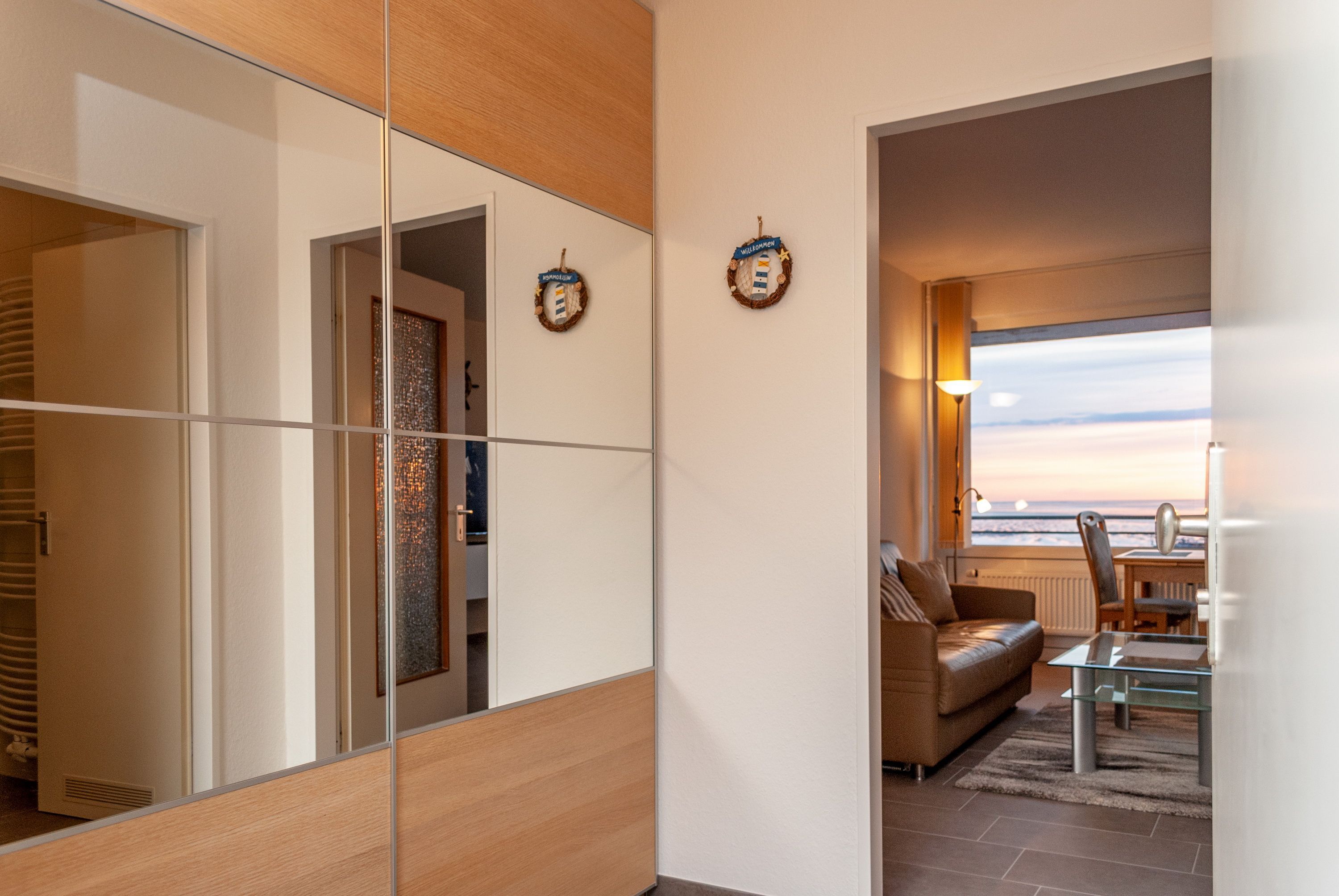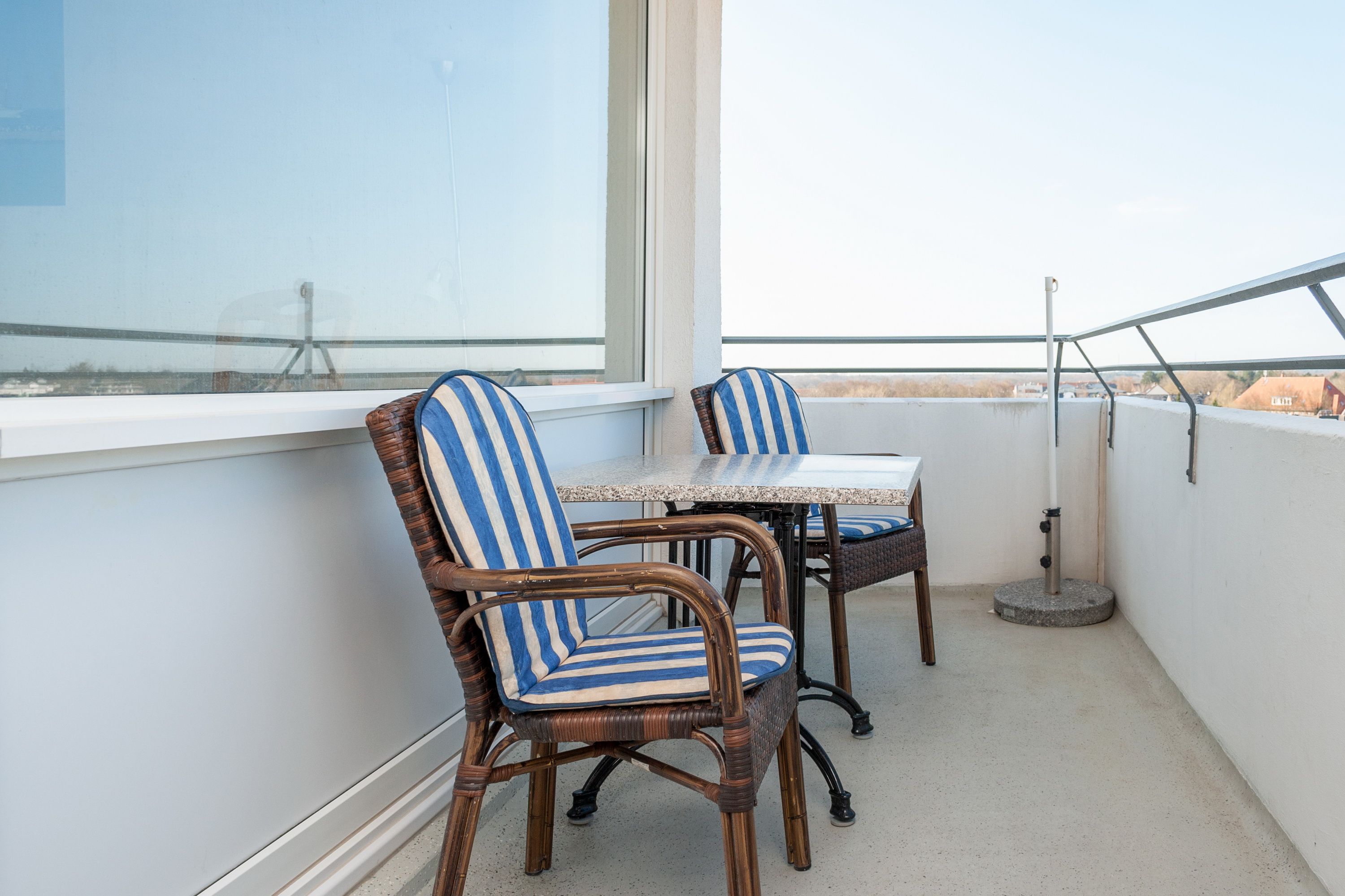 Das Apartment 701 ist ein 2-Raum-Apartment im 7. Obergeschoss für bis zu 4 Personen mit 50 qm. Der Westbalkon mit Meerblick bietet Ihnen vormittags Schatten und nachmittags Sonne.