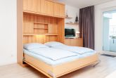 Das Apartment 110 ist ein 1-Raum-Apartment im 1. Obergeschoss für bis zu 4 Personen mit 40 qm. Der Ostbalkon mit Meerblick bietet Ihnen vormittags Sonne und nachmittags Schatten.