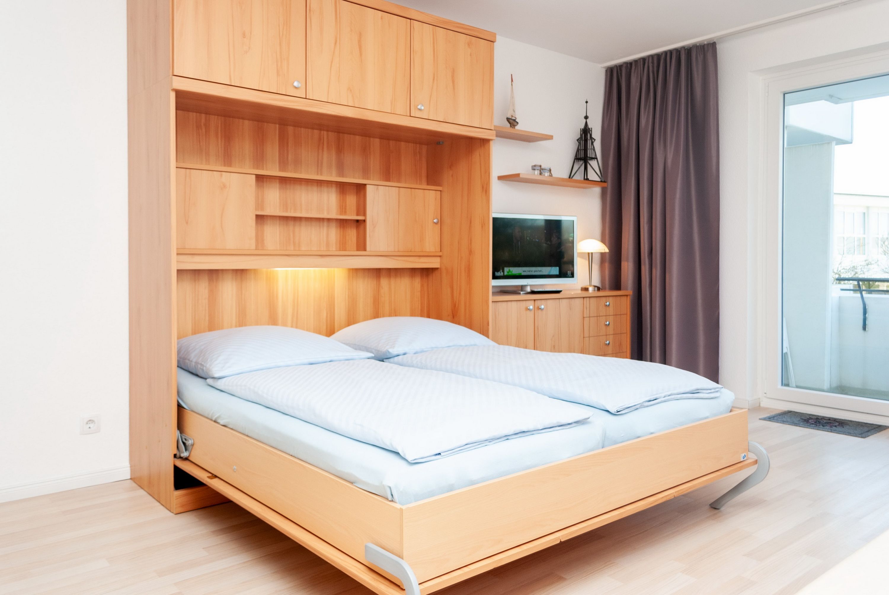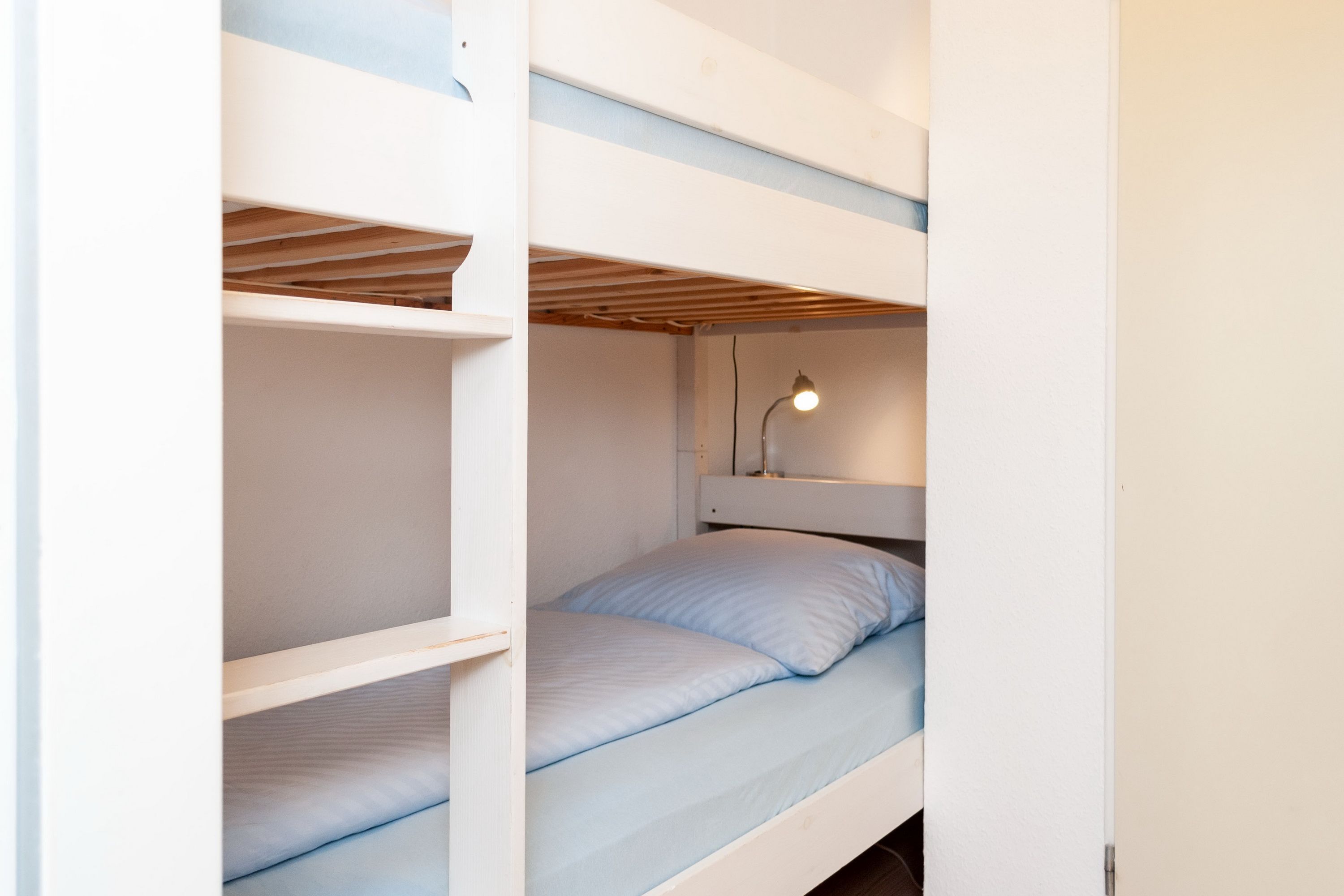 Das Apartment besteht aus einem Wohnbereich mit Schrankbett für 2 Personen und Zusätzlichem Etagenbett in einer Nische im Flur einem Badezimmer mit Dusche sowie WC. Die Ferienwohnung beinhaltet eine gut ausgestattete offene Küche.
