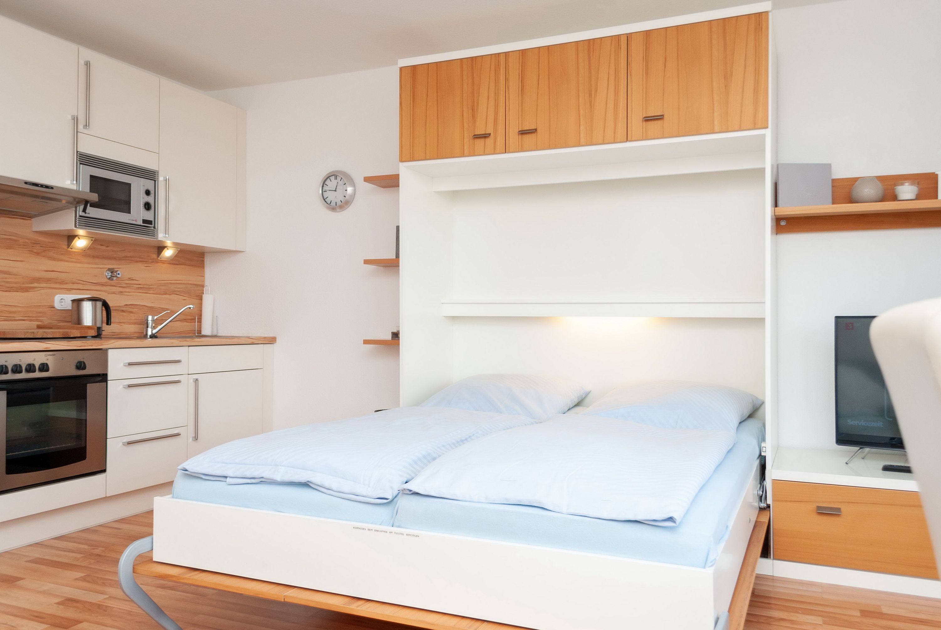 Das Apartment besteht aus einem Wohnbereich mit Schrankbett für 2 Personen, und einem zusätzlichem Etagenbett in einer Nische im Flur , Badezimmer mit Dusche sowie WC. Die Ferienwohnung beinhaltet eine voll ausgestattete offene Küche.