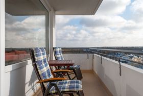 Das Apartment 801 ist ein 2-Raum-Apartment im 8. Obergeschoss für bis zu 3 Personen mit 50 qm. Der Westbalkon mit Meerblick bietet Ihnen vormittags Schatten und nachmittags Sonne.