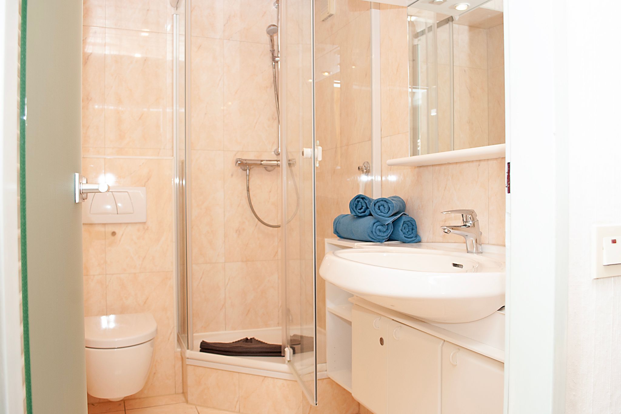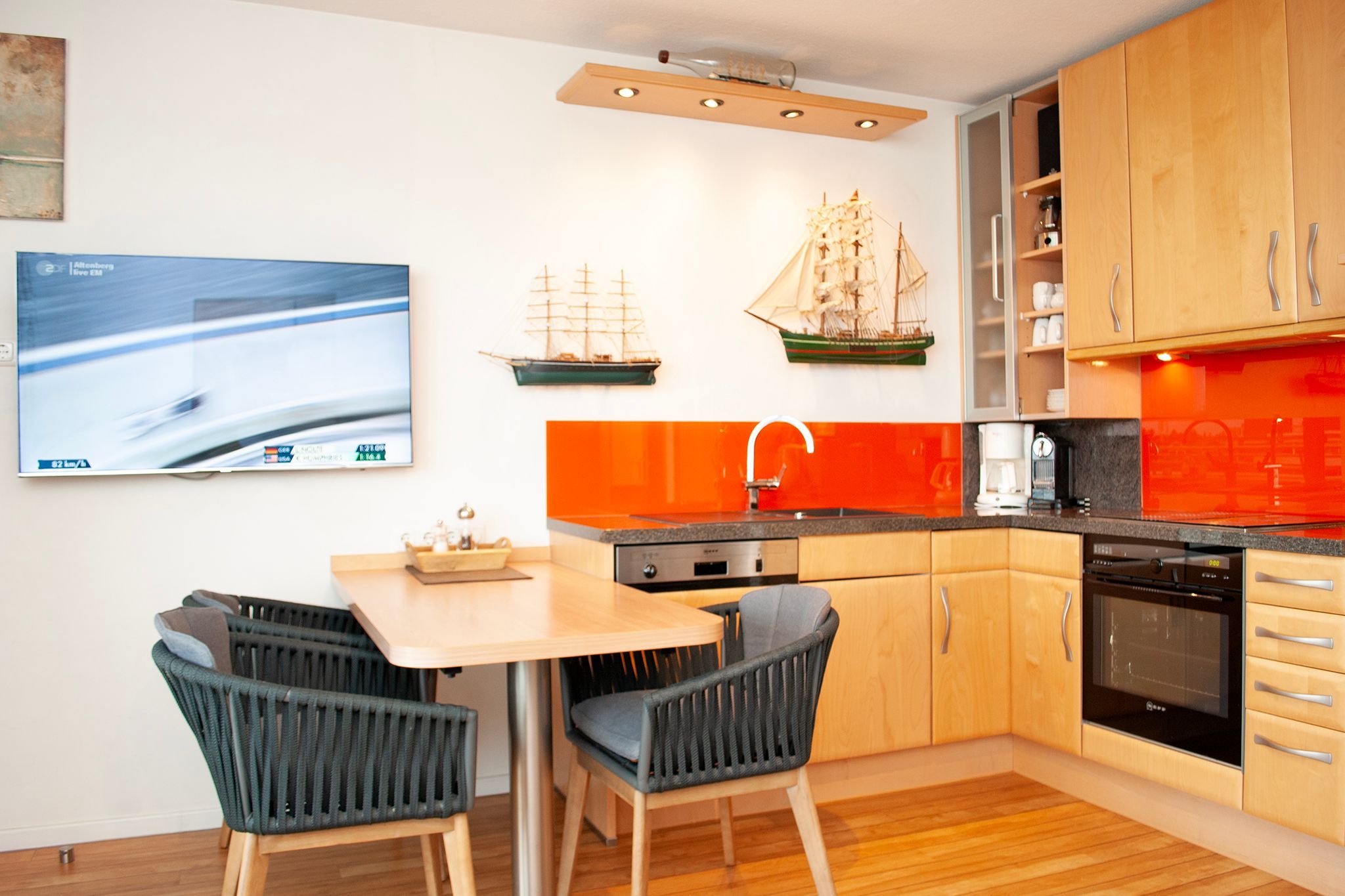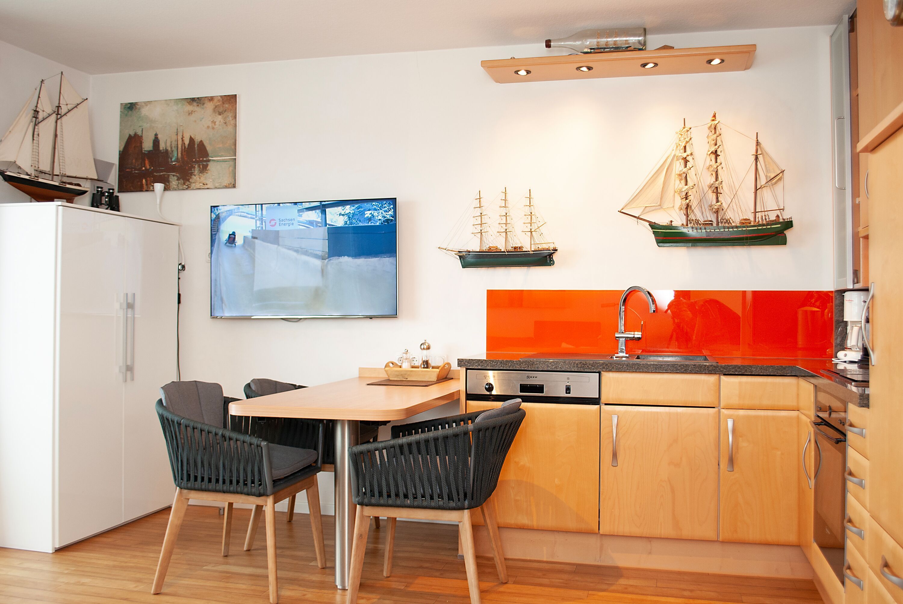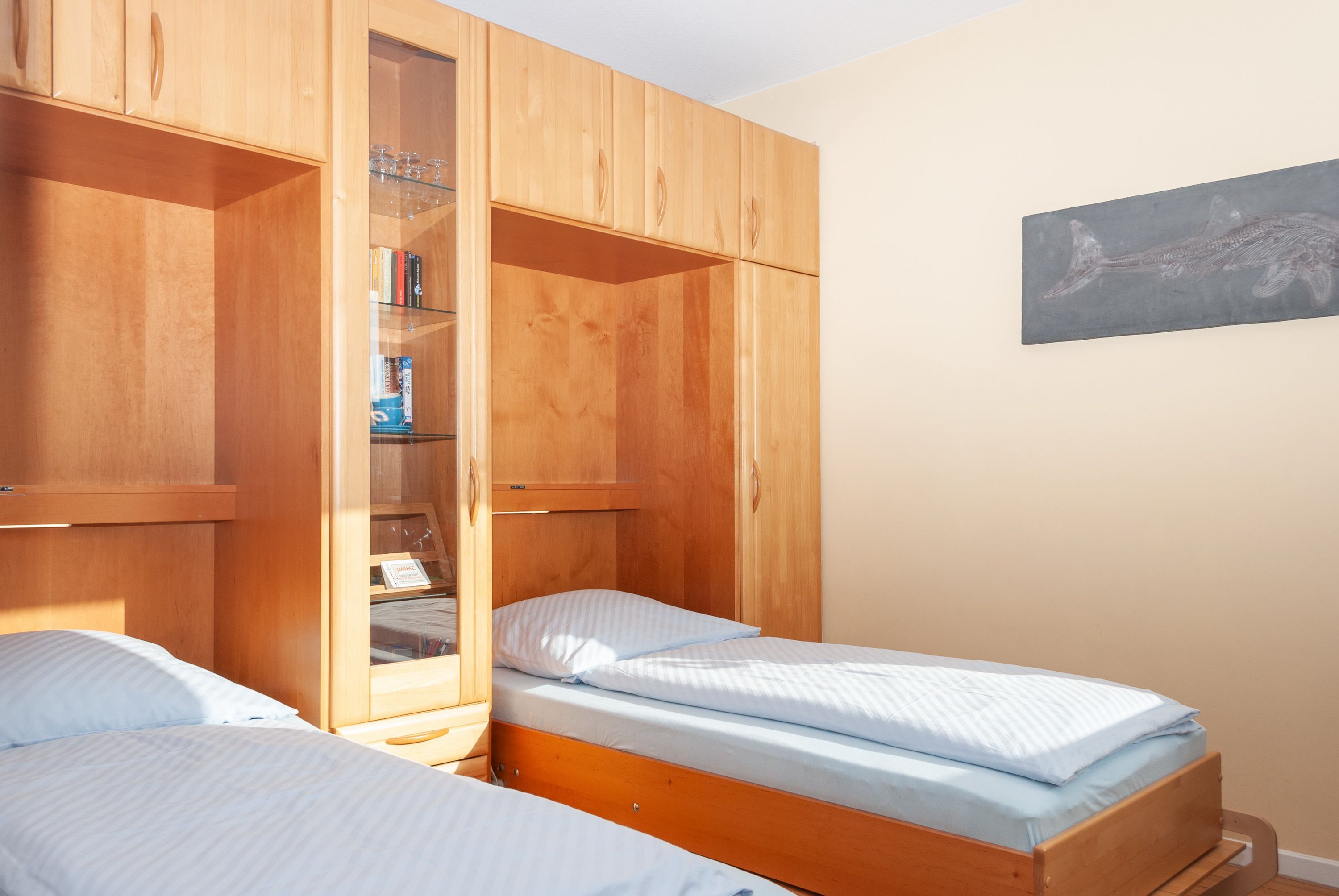 Das Apartment besteht aus einem Schlafzimmer mit 2 Einzel Schrankbetten , einem Wohnbereich und einem zusätzlichem Etagenbett in einer Nische im Flur für 1 Person und einem Badezimmer mit Dusche sowie WC. Die Ferienwohnung beinhaltet eine voll ausgestattete offene Küche.