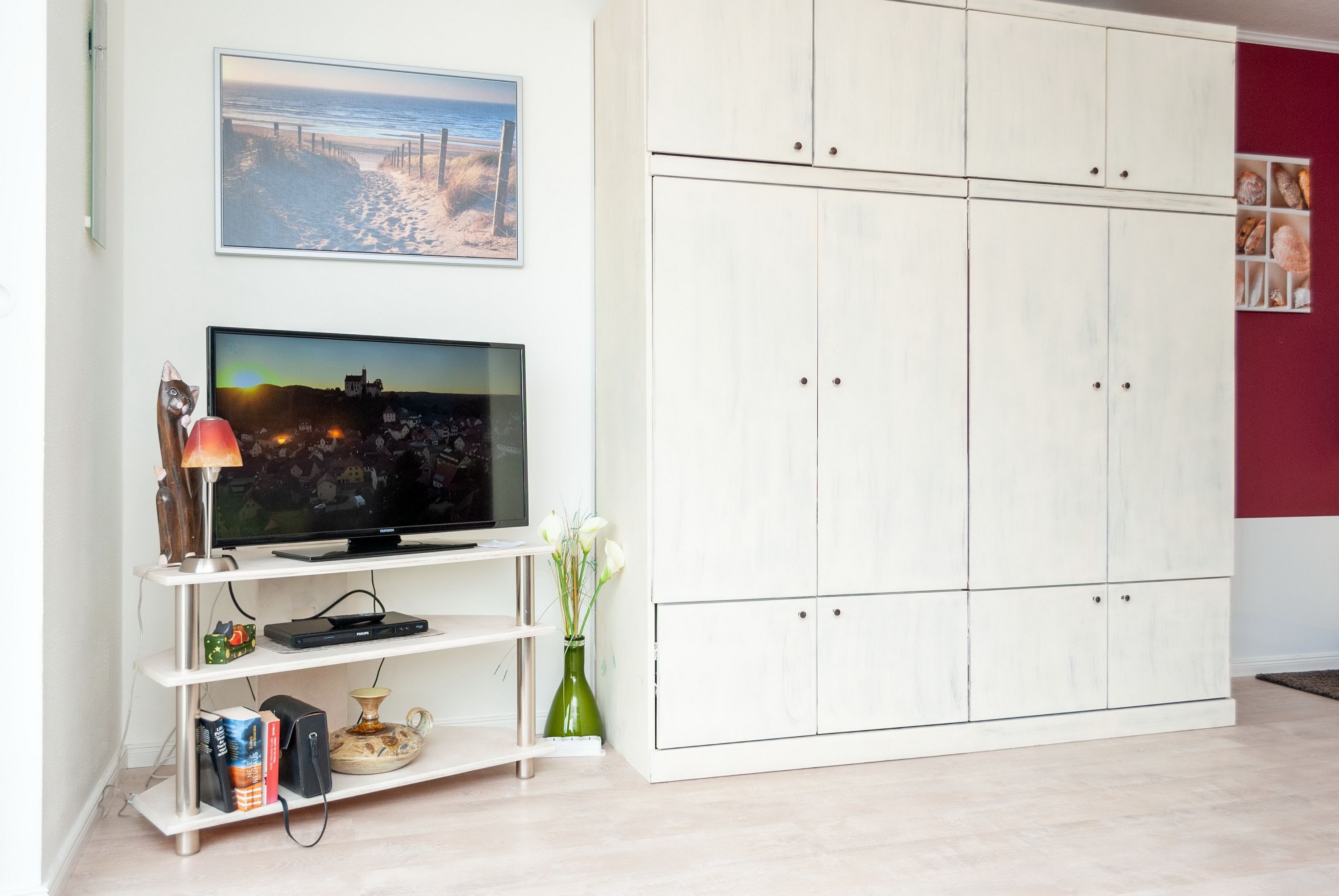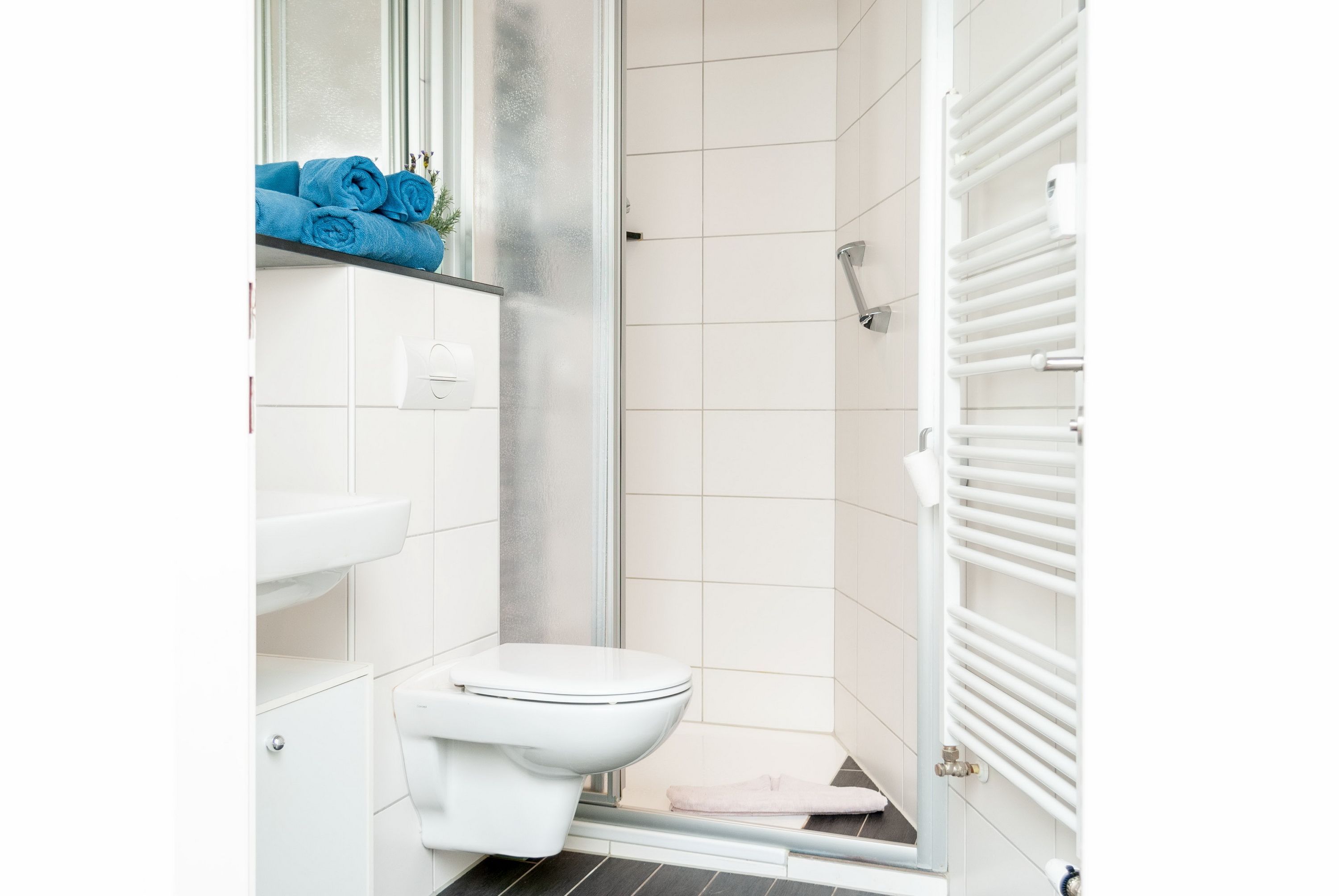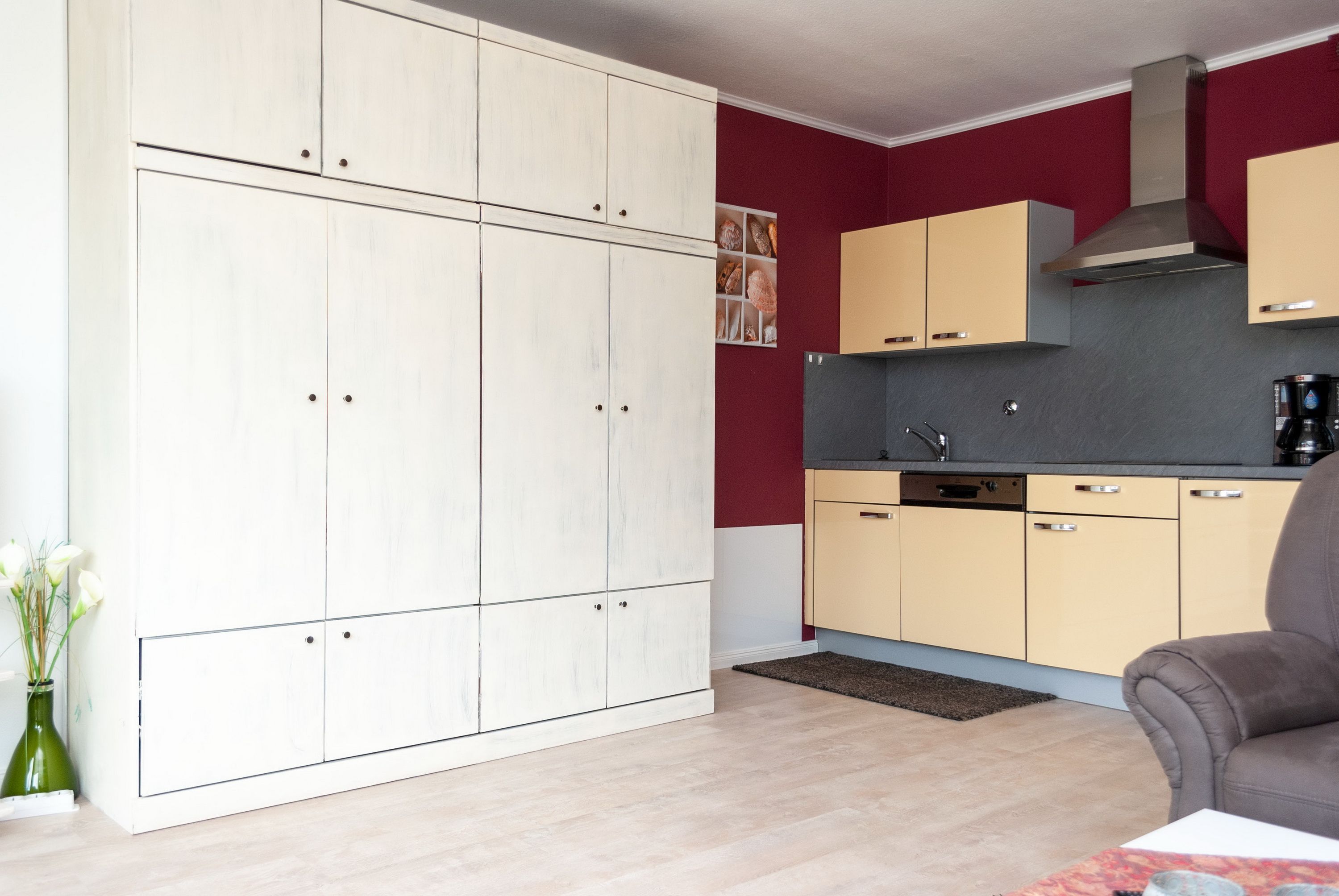 Das Apartment besteht aus einem Wohnbereich mit Schrankbett für 2 Personen und einem Badezimmer mit Dusche sowie WC. Die Ferienwohnung beinhaltet eine voll ausgestattete offene Küche.