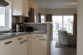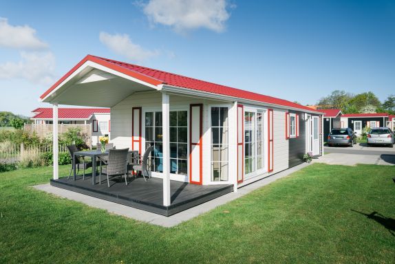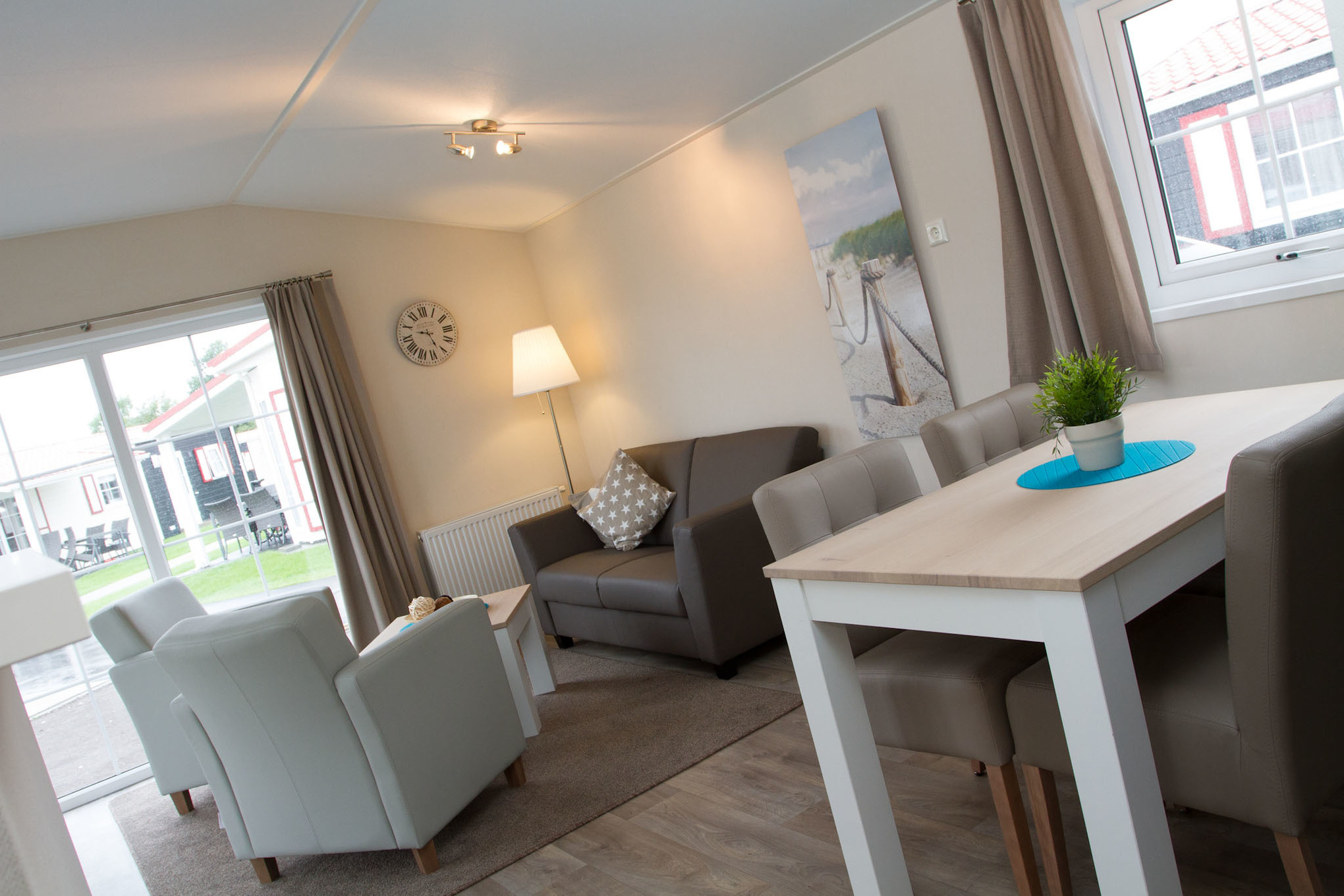 Ferienhaus mit rd. 45m² und Platz für bis zu vier Personen. 2 Schlafzimmer davon 1 mal mit Doppelbett und TV und 1 mal mit zwei Einzelbetten, 1 Badezimmer. Großer Wohnraum mit Küche, Sitzgelegenheiten und Unterhaltungsmedien (TV).