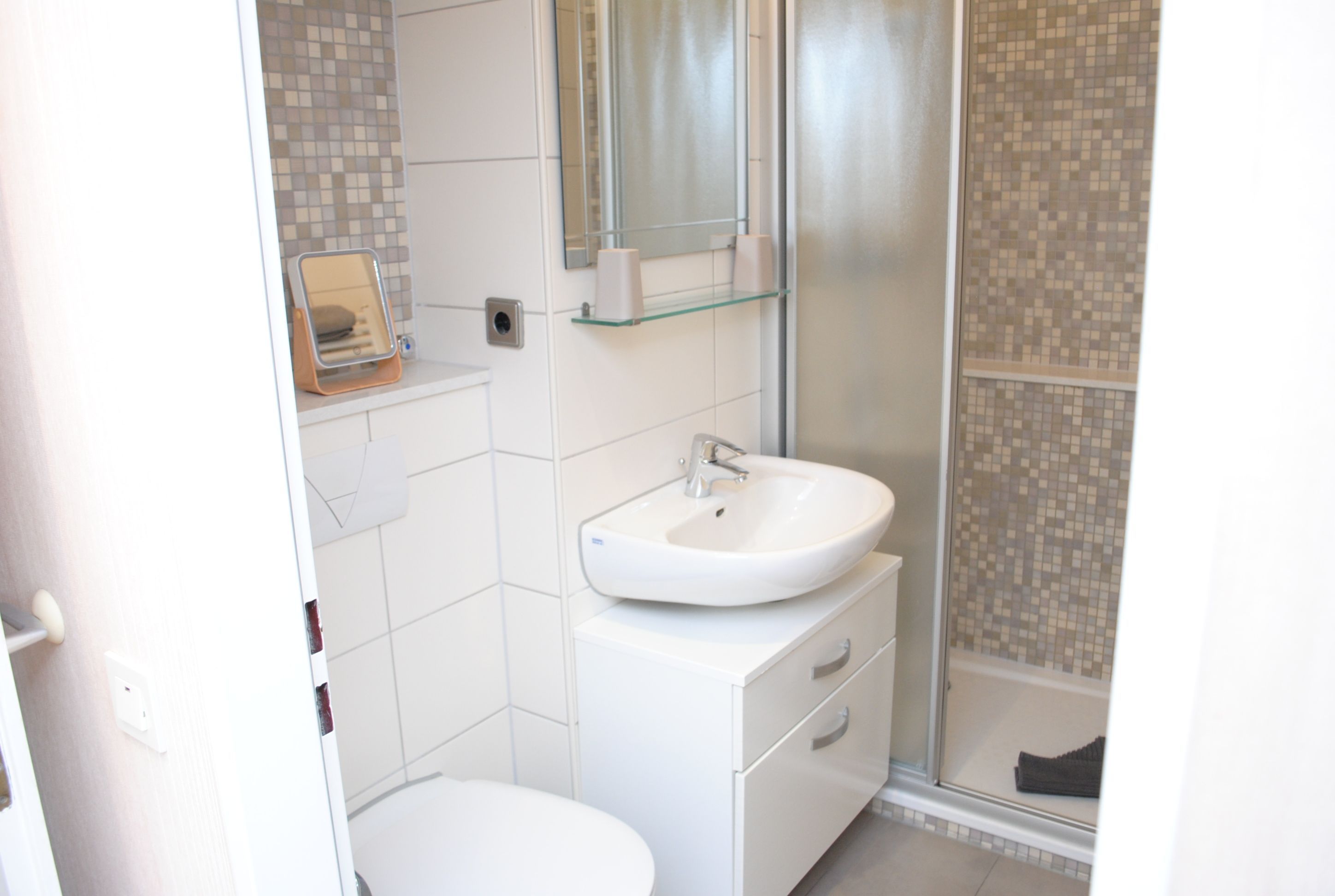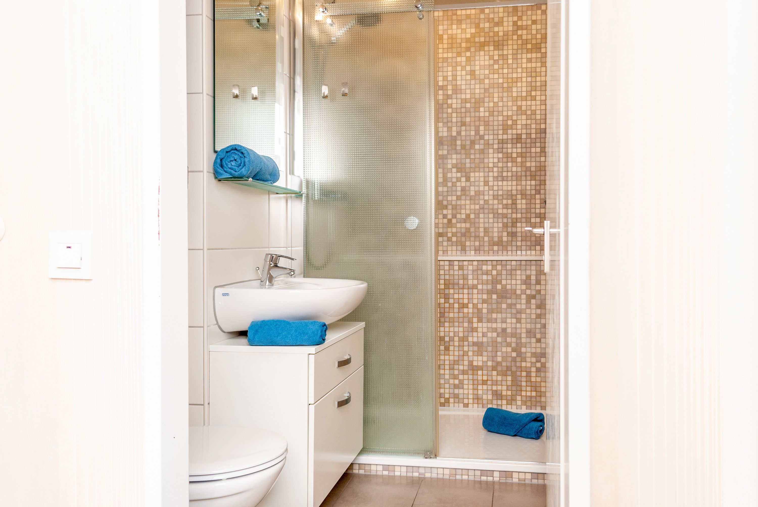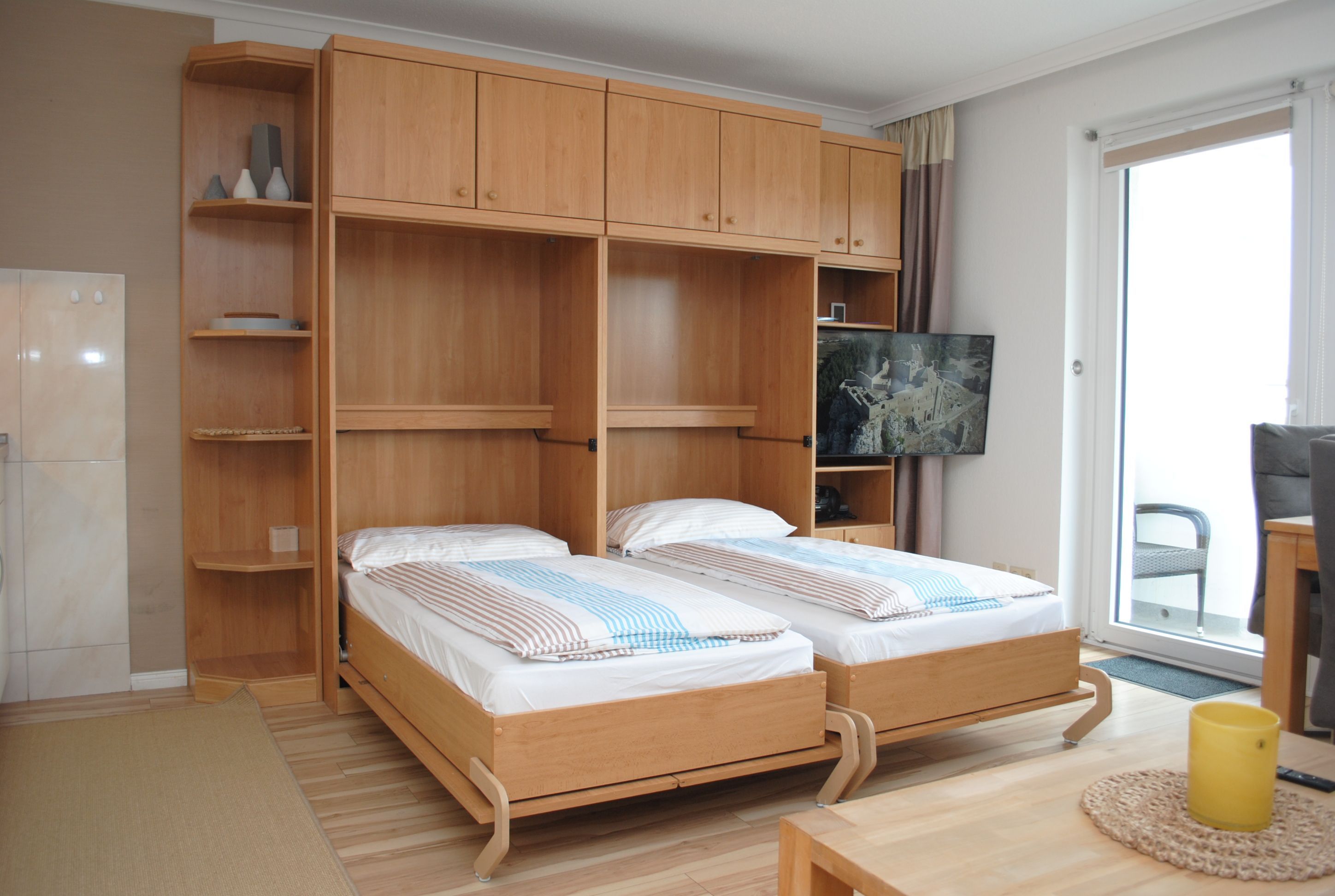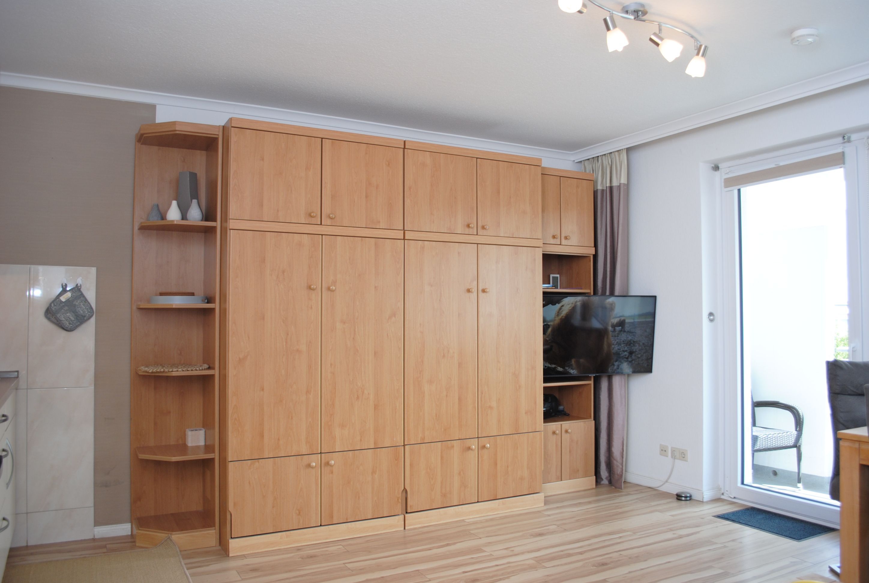 Das Apartment besteht aus einem Schlafzimmer mit 2 Einzelbetten, einem Wohnbereich mit zusätzlichem Schrankbett für 2 Personen und einem Badezimmer mit Dusche sowie WC. Die Ferienwohnung beinhaltet eine voll ausgestattete offene Küche.