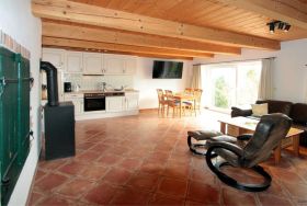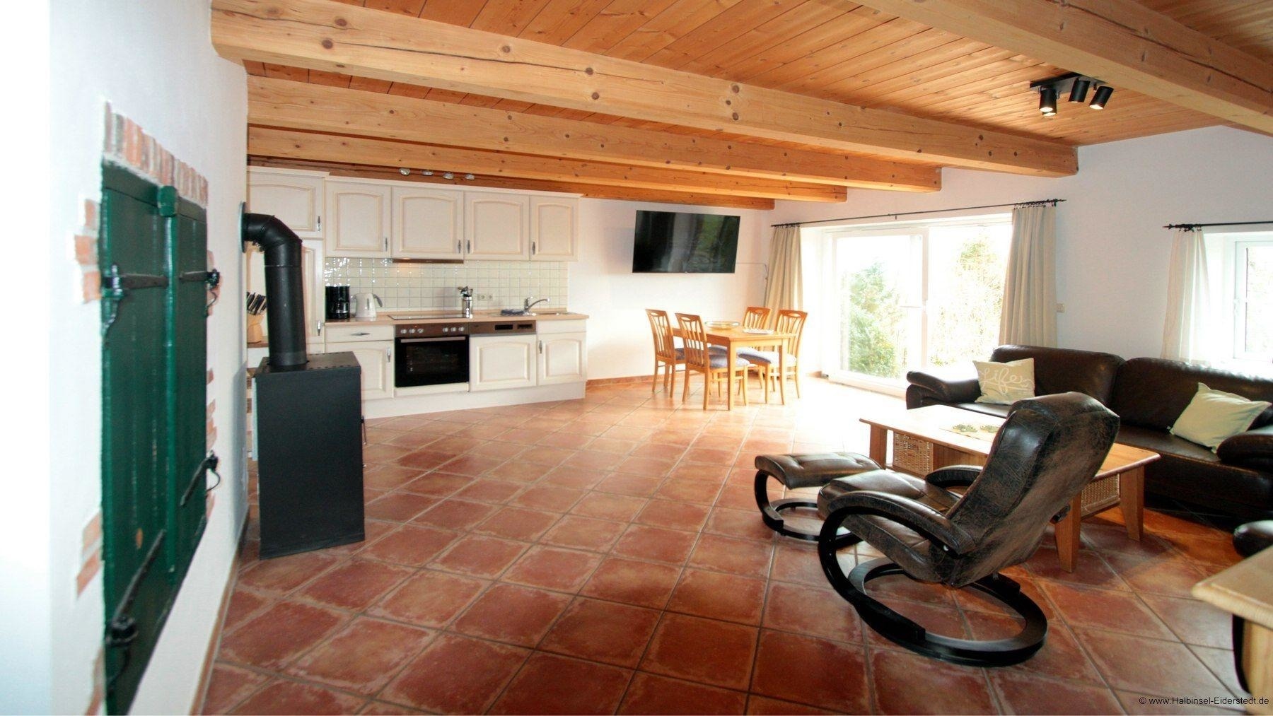 Im hellen Wohnzimmer mit integrierter Küche stehen für Sie eine bequeme Sitzgarnitur und ein Fernseher bereit. Ein Esstisch ist auch vorhanden. Der Kaminofen verstärkt die Gemütlichkeit des Wohnbereichs zusätzlich.
