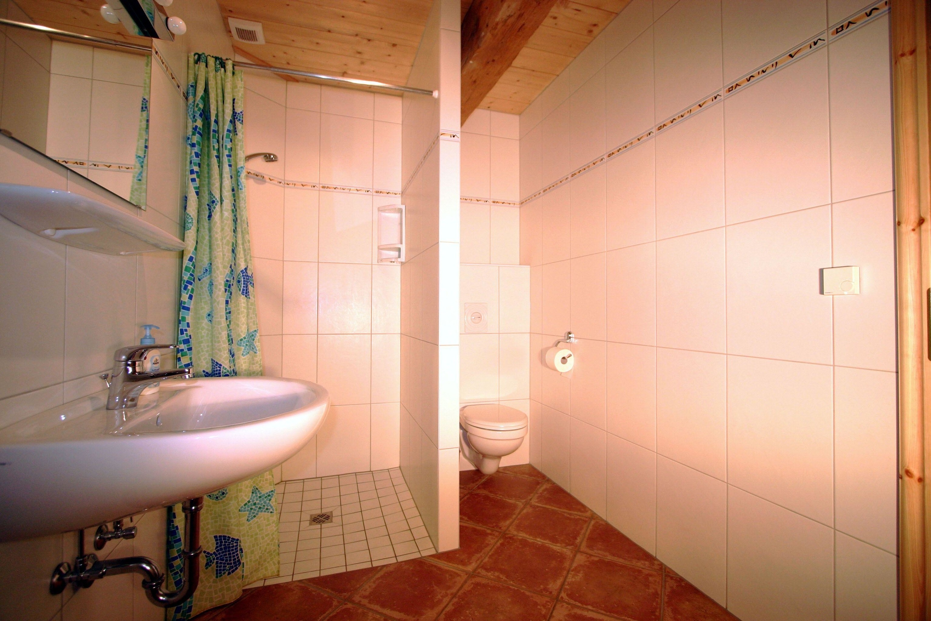 Das gepflegte Badezimmer ist hübsch gekachelt und verfügt über eine ebenerdige Dusche, Spiegel, Waschbecken und WC.