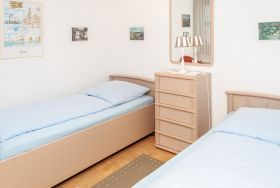 Das Apartment besteht aus einem Schlafzimmer mit 2 Einzelbetten, einem Wohnbereich mit zusätzlichem Schrankbett für 2 Personen und einem Badezimmer mit Dusche sowie WC. Die Ferienwohnung beinhaltet eine gut ausgestattete offene Küche.
