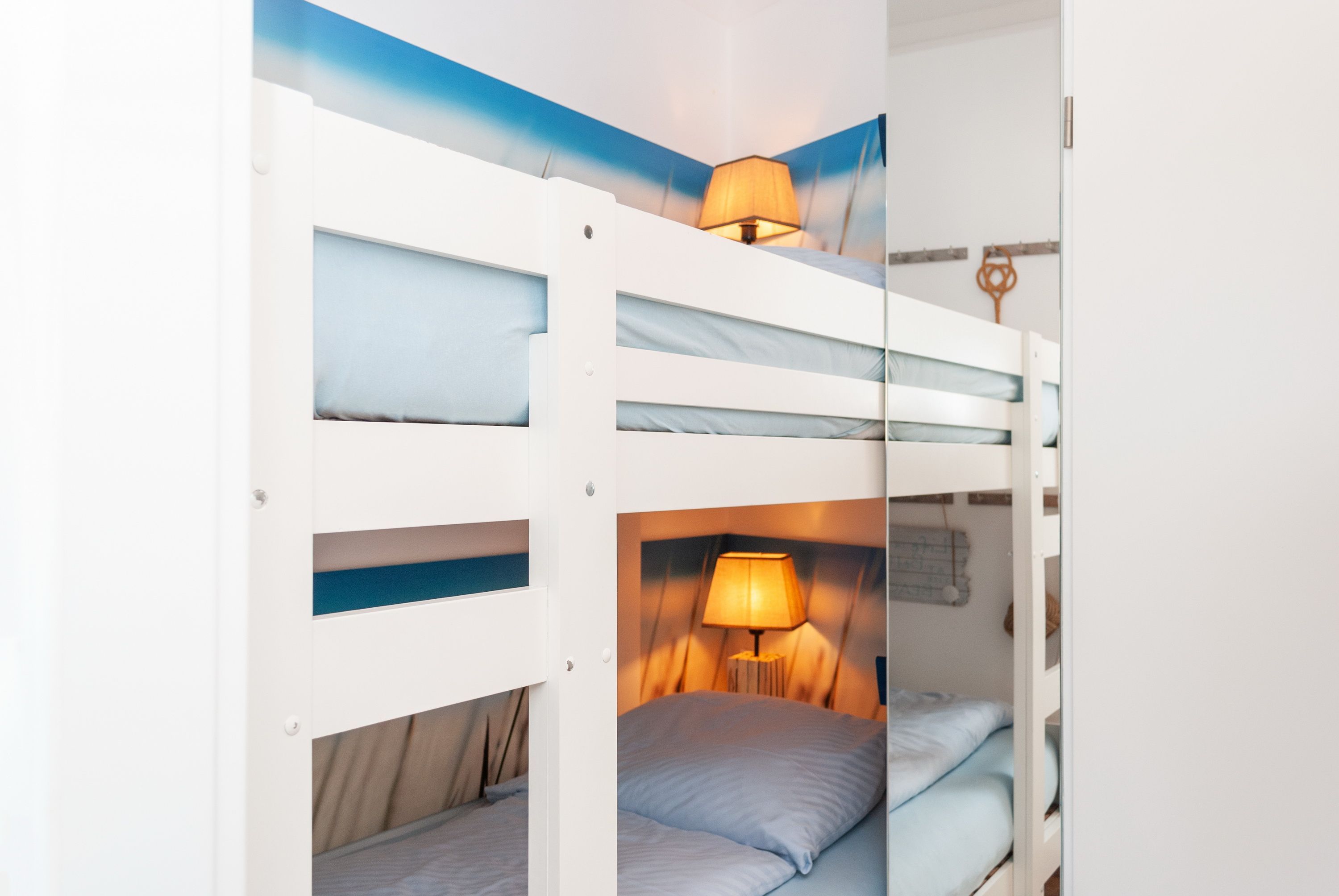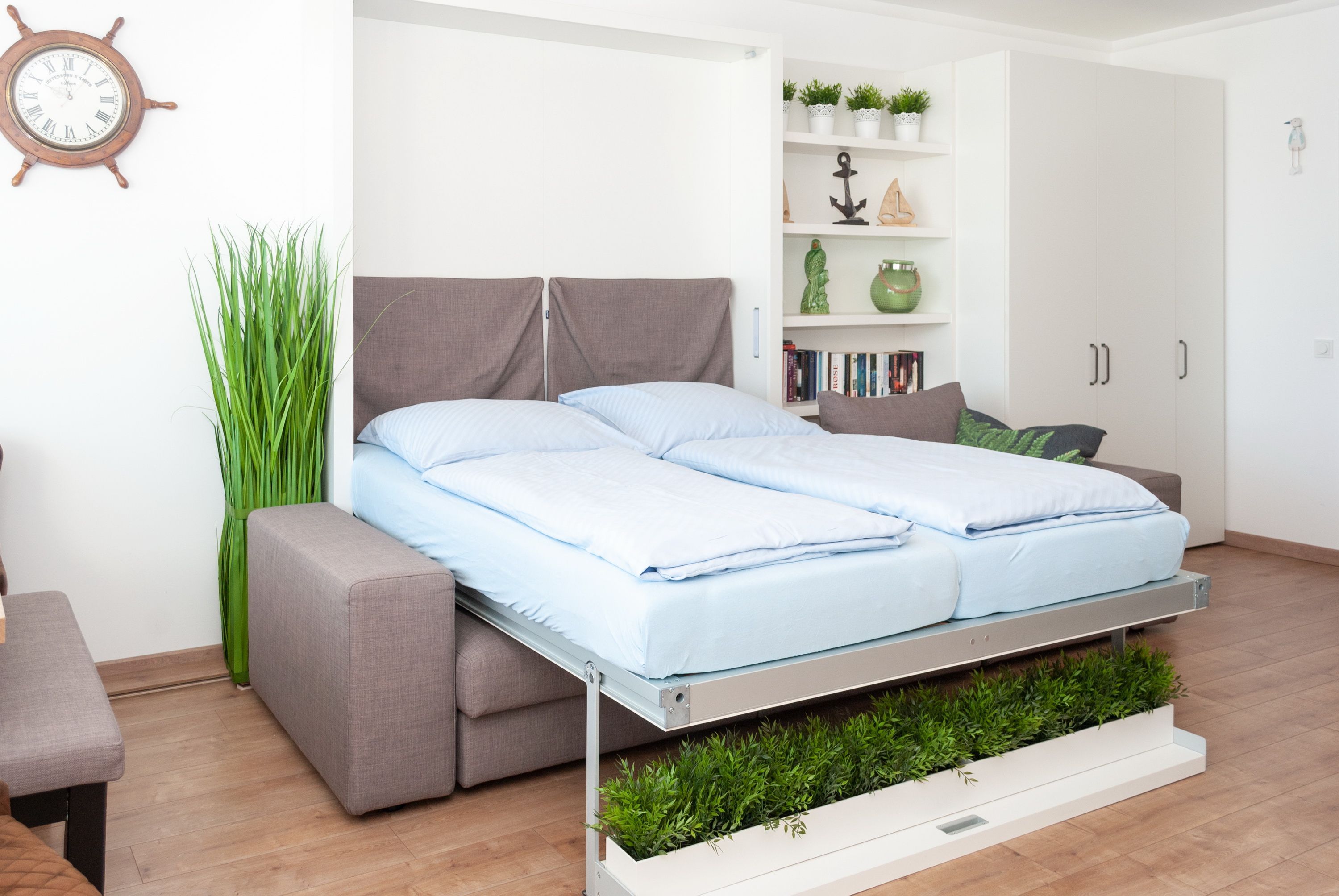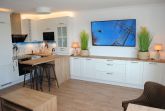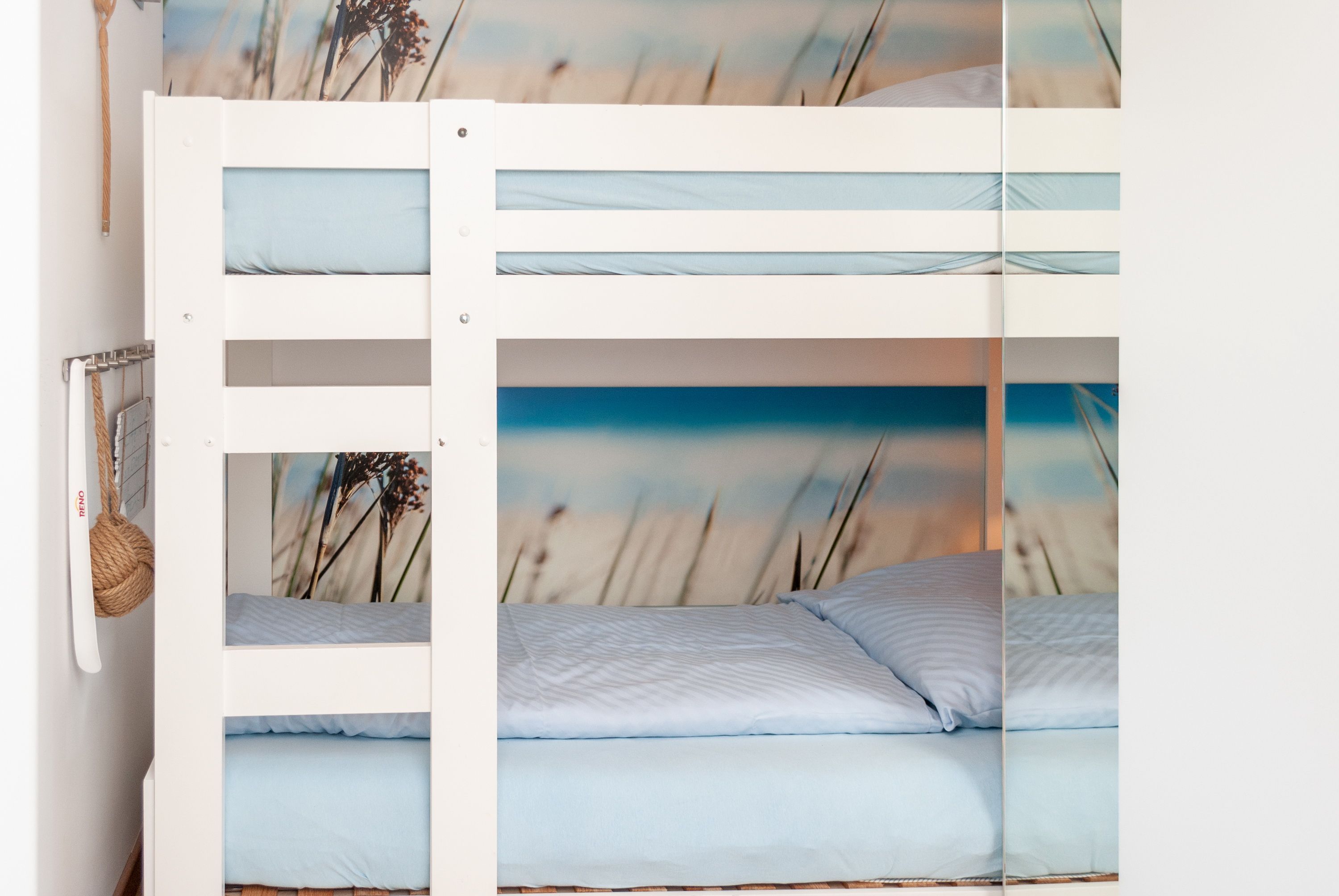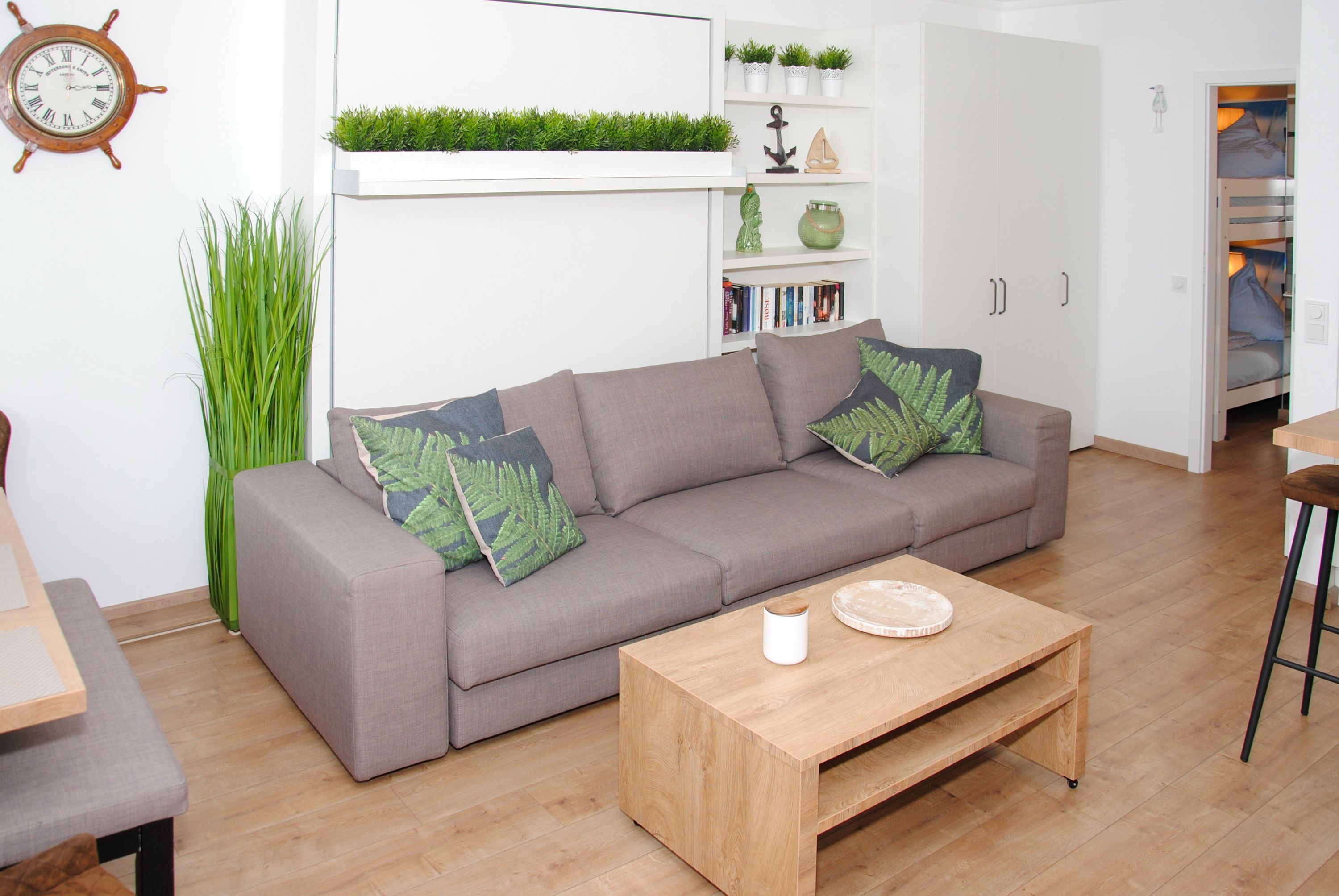 Das Apartment besteht aus Wohnbereich mit Schrankbett für 2 Personen, aus einem zusätzlichem Etagenbett in einer Nische im Flur und einem Badezimmer mit Dusche sowie WC. Die Ferienwohnung beinhaltet eine voll ausgestattete offene Küche.